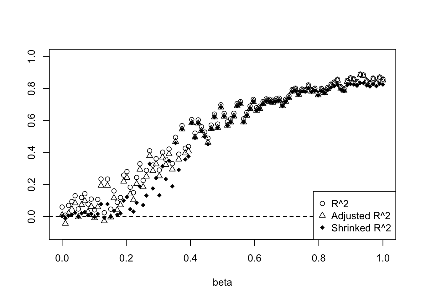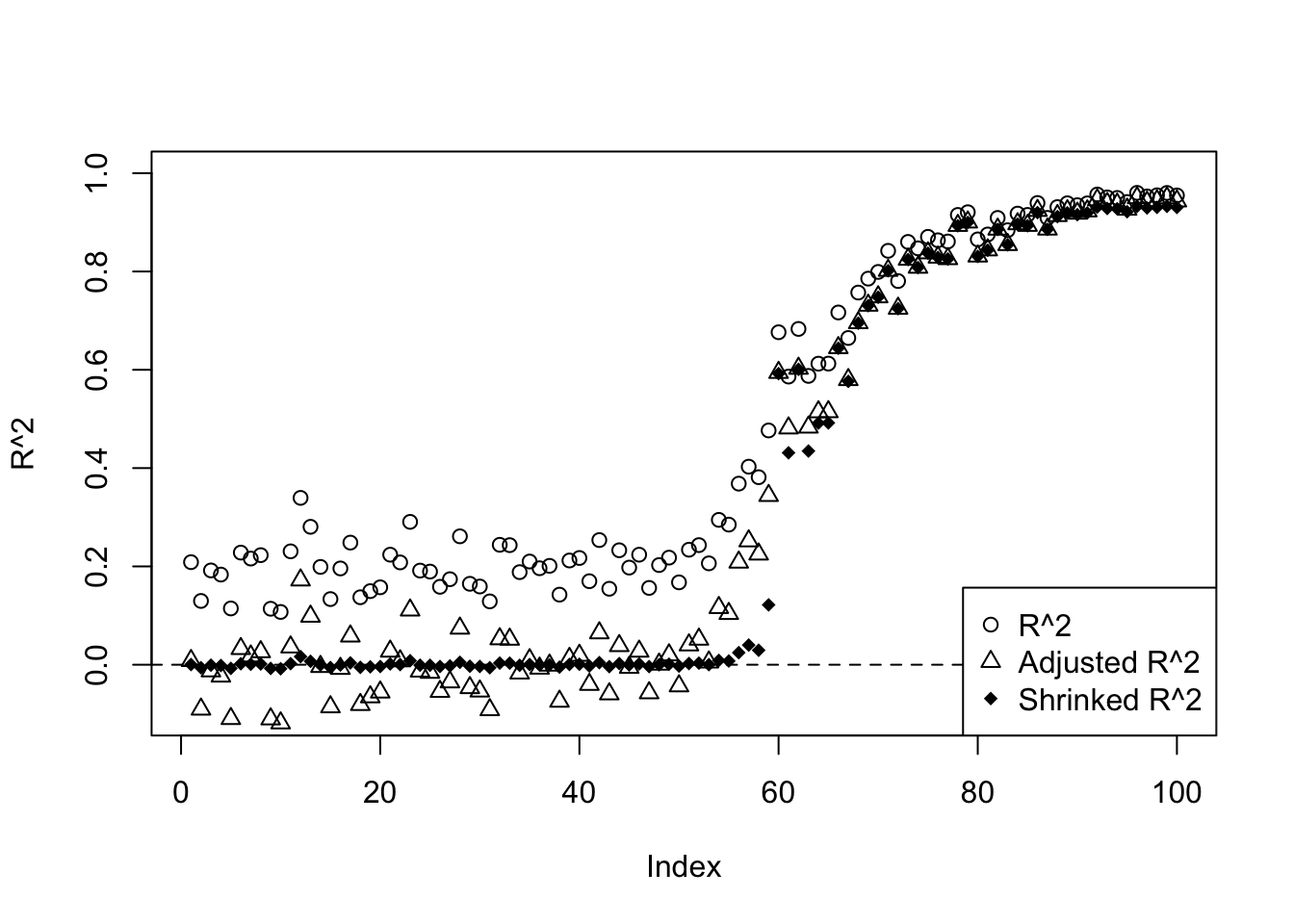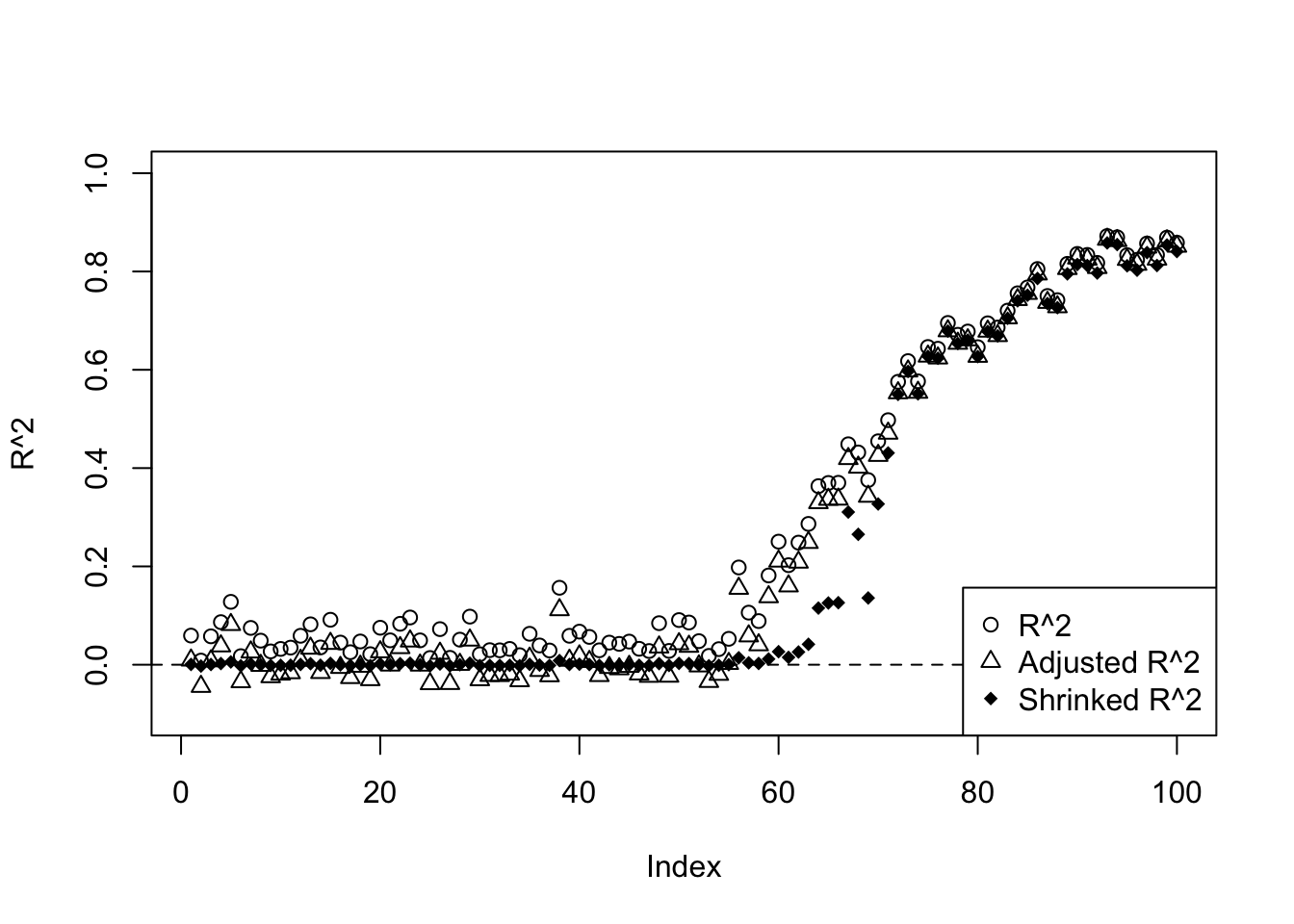 legend('bottomright',c('R^2','Adjusted R^2','Shrinked R^2'),pch=c(1,2,18))