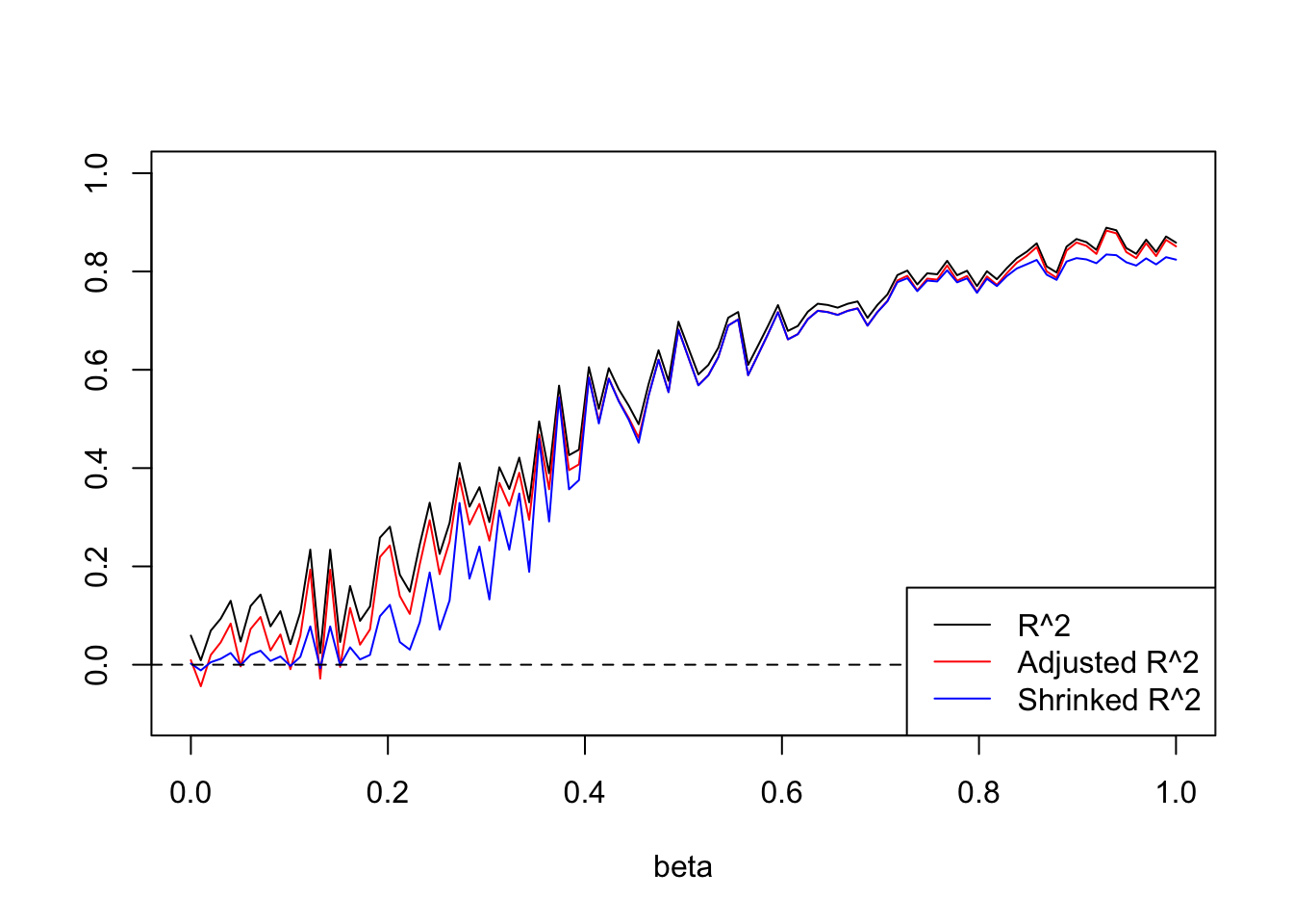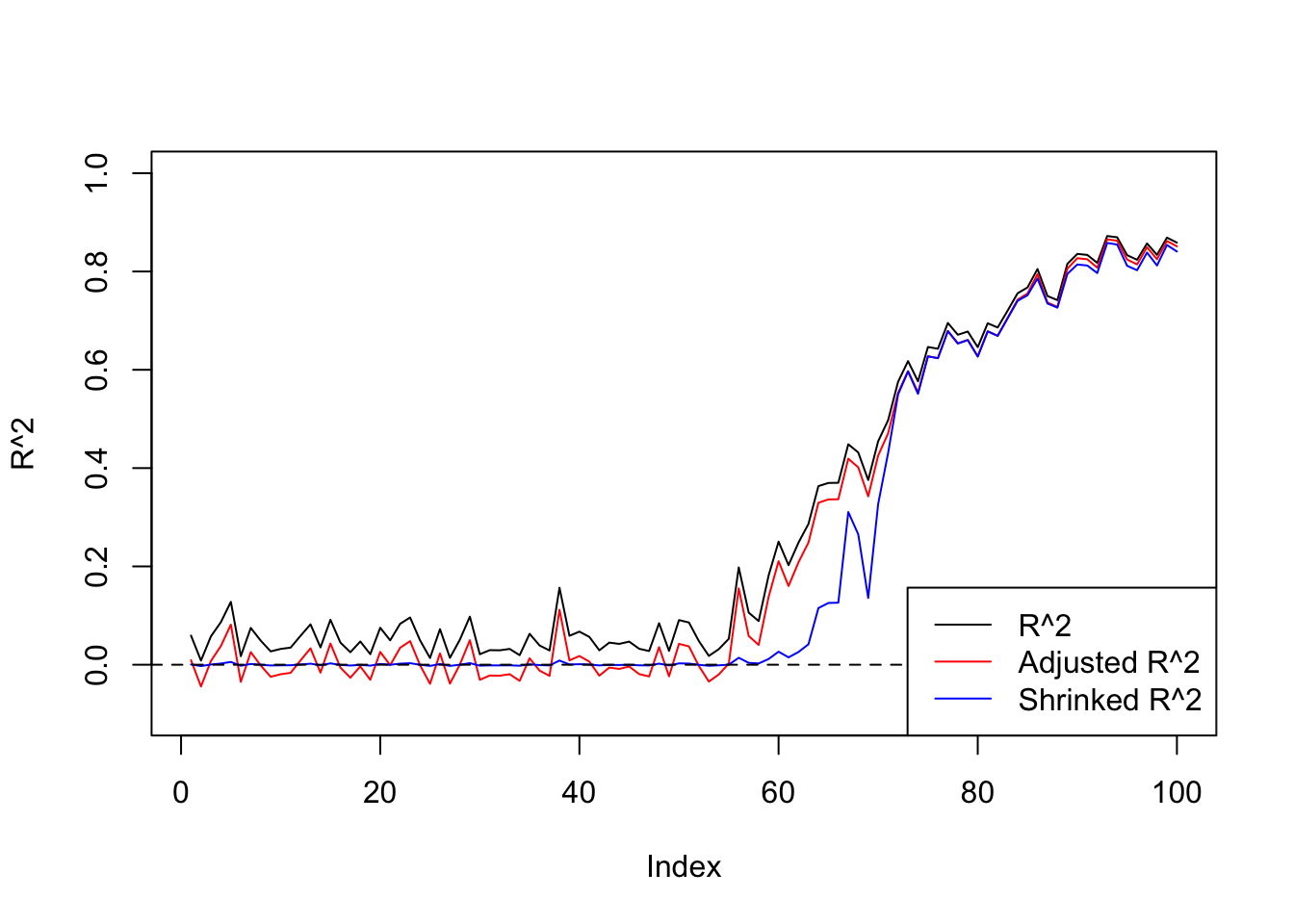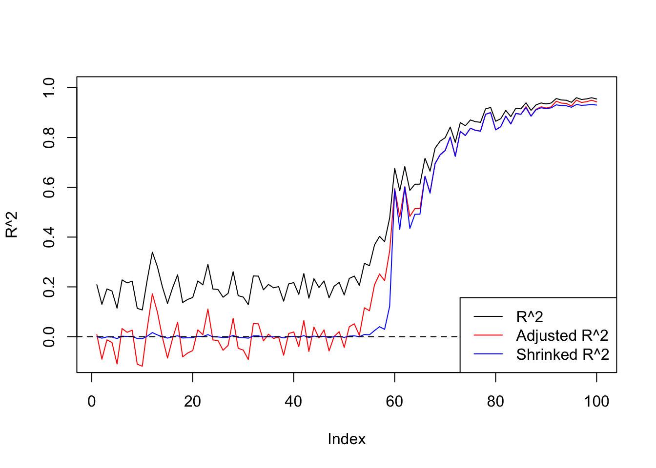 legend('bottomright',c('R^2','Adjusted R^2','Shrinked R^2'),lty=c(1,1,1),col=c(1,2,4))