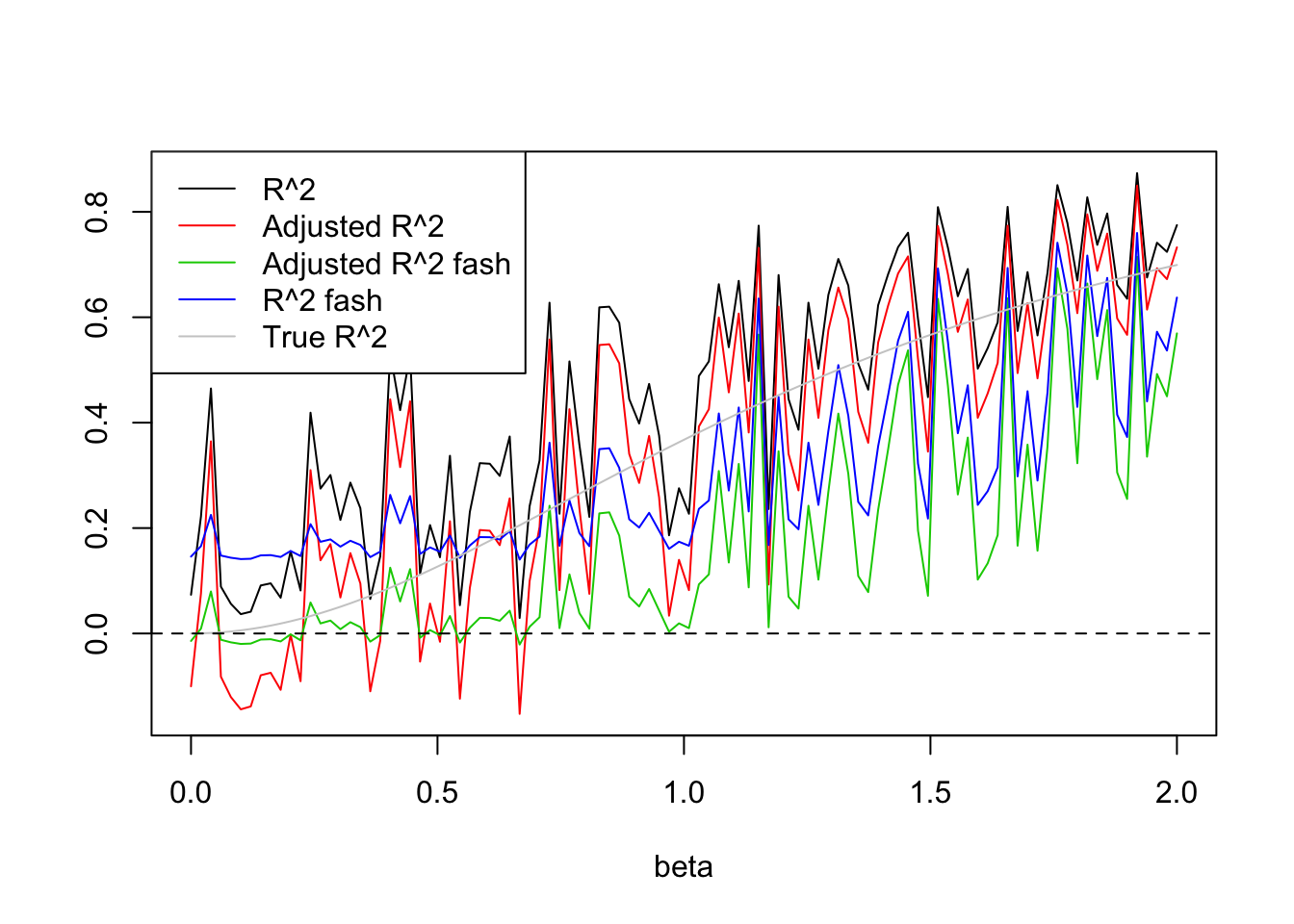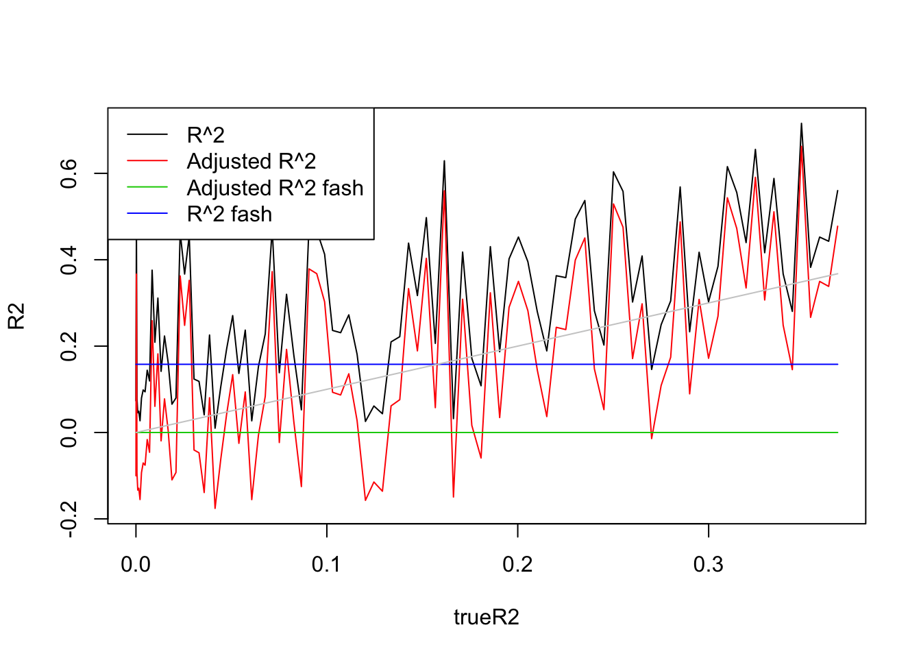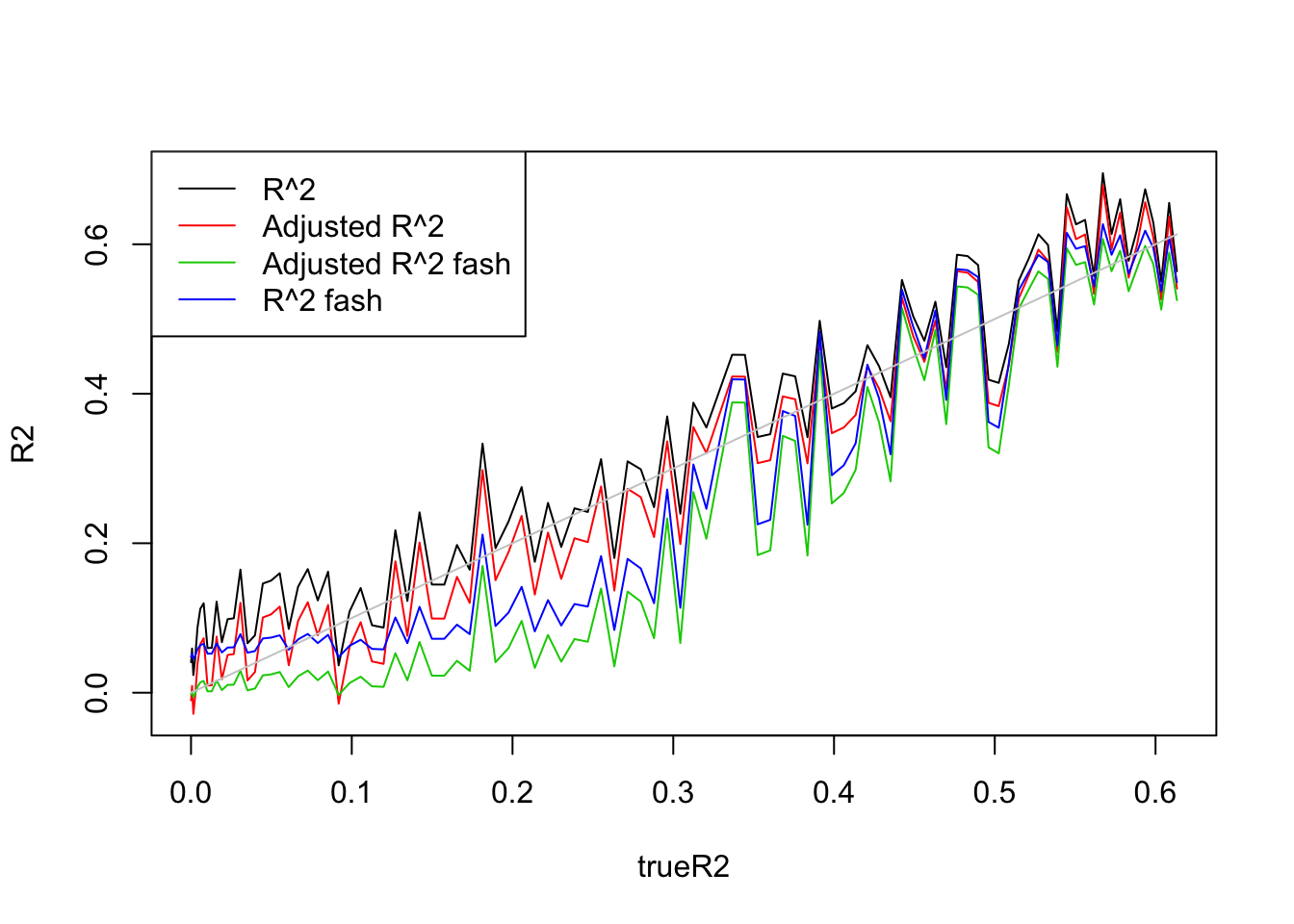 legend('topleft',c('R^2','Adjusted R^2','Adjusted R^2 fash','R^2 fash','True R^2'),lty=c(1,1,1,1,1),col=c(1,2,3,4,'grey80'))