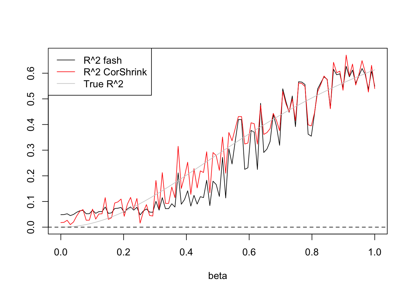 legend('topleft',c('R^2 fash','R^2 CorShrink','True R^2'),lty=c(1,1,1),col=c(1,2,'grey80'))
