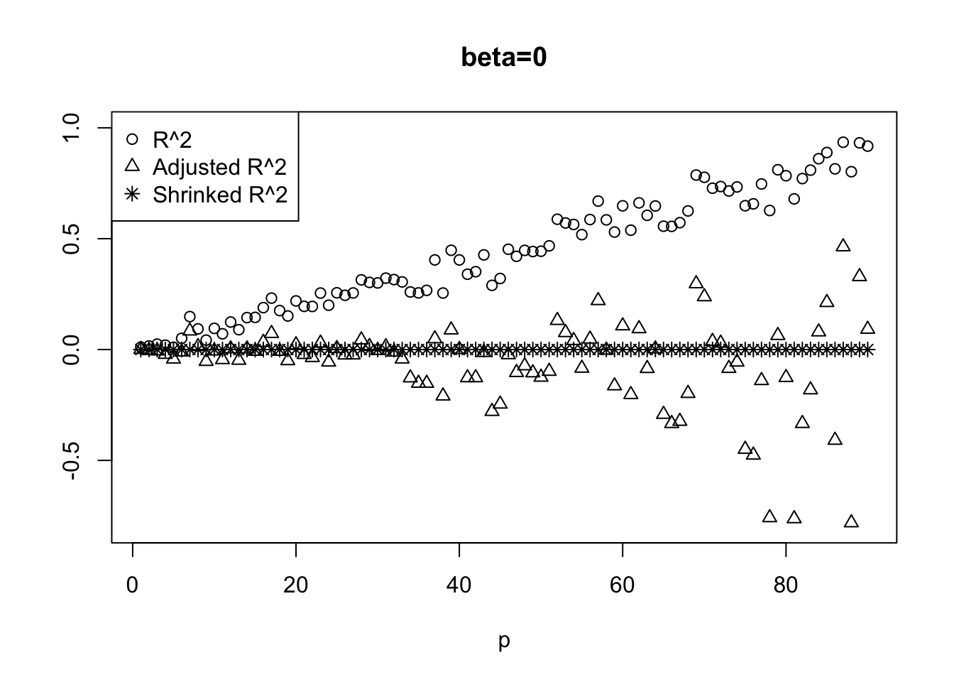 legend('topleft',c('R^2','Adjusted R^2','Shrinked R^2'),pch=c(1,2,8))