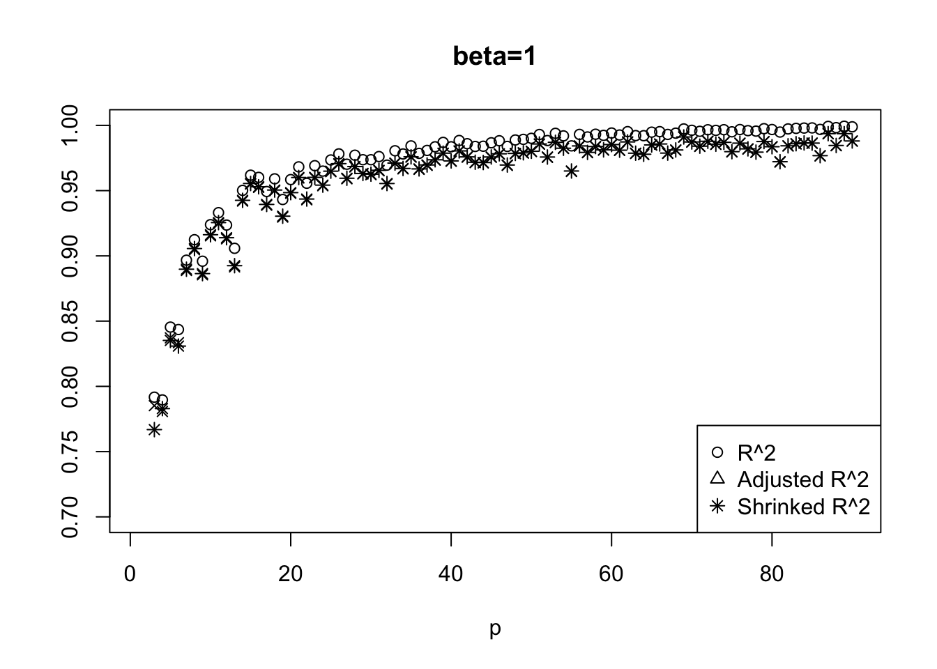 legend('bottomright',c('R^2','Adjusted R^2','Shrinked R^2'),pch=c(1,2,8))