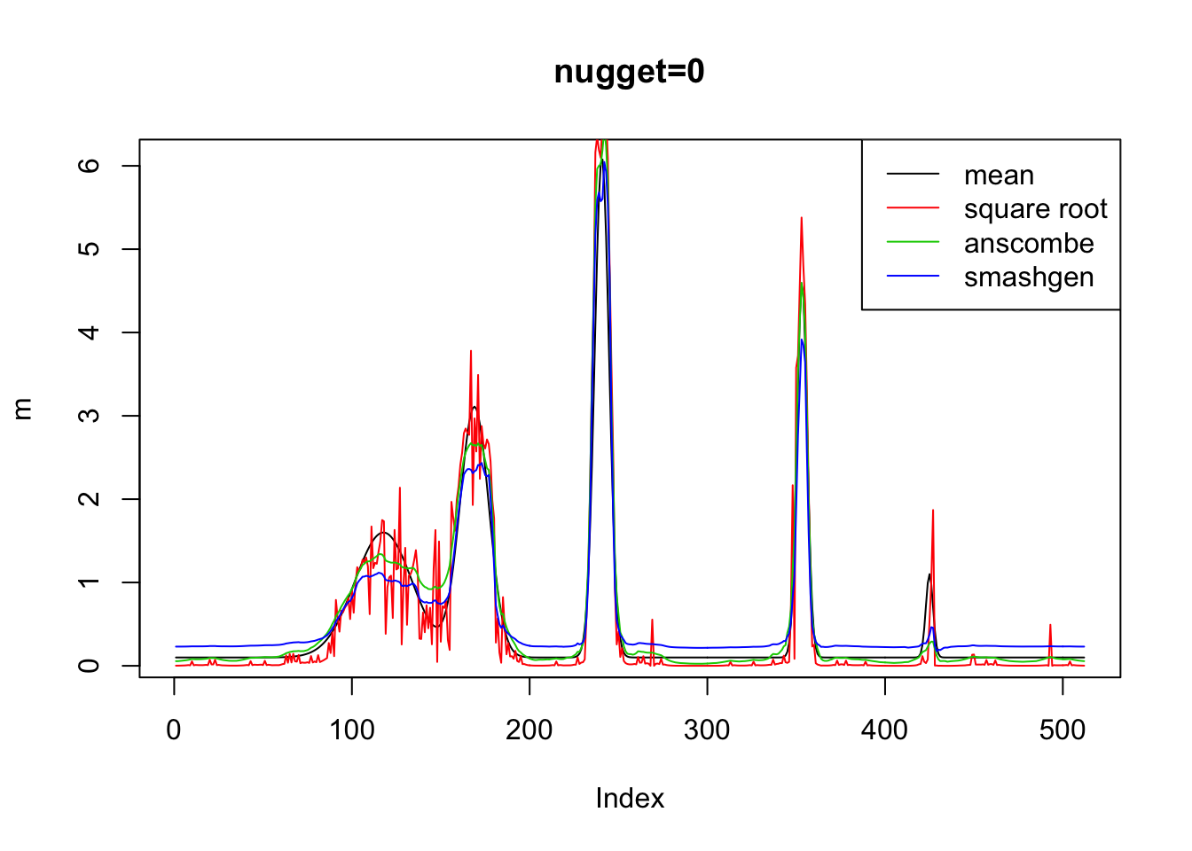 #legend('topright',c('mean','square root','anscombe','smashgen'),lty=c(1,1,1,1),col=c(1,2,3,4))