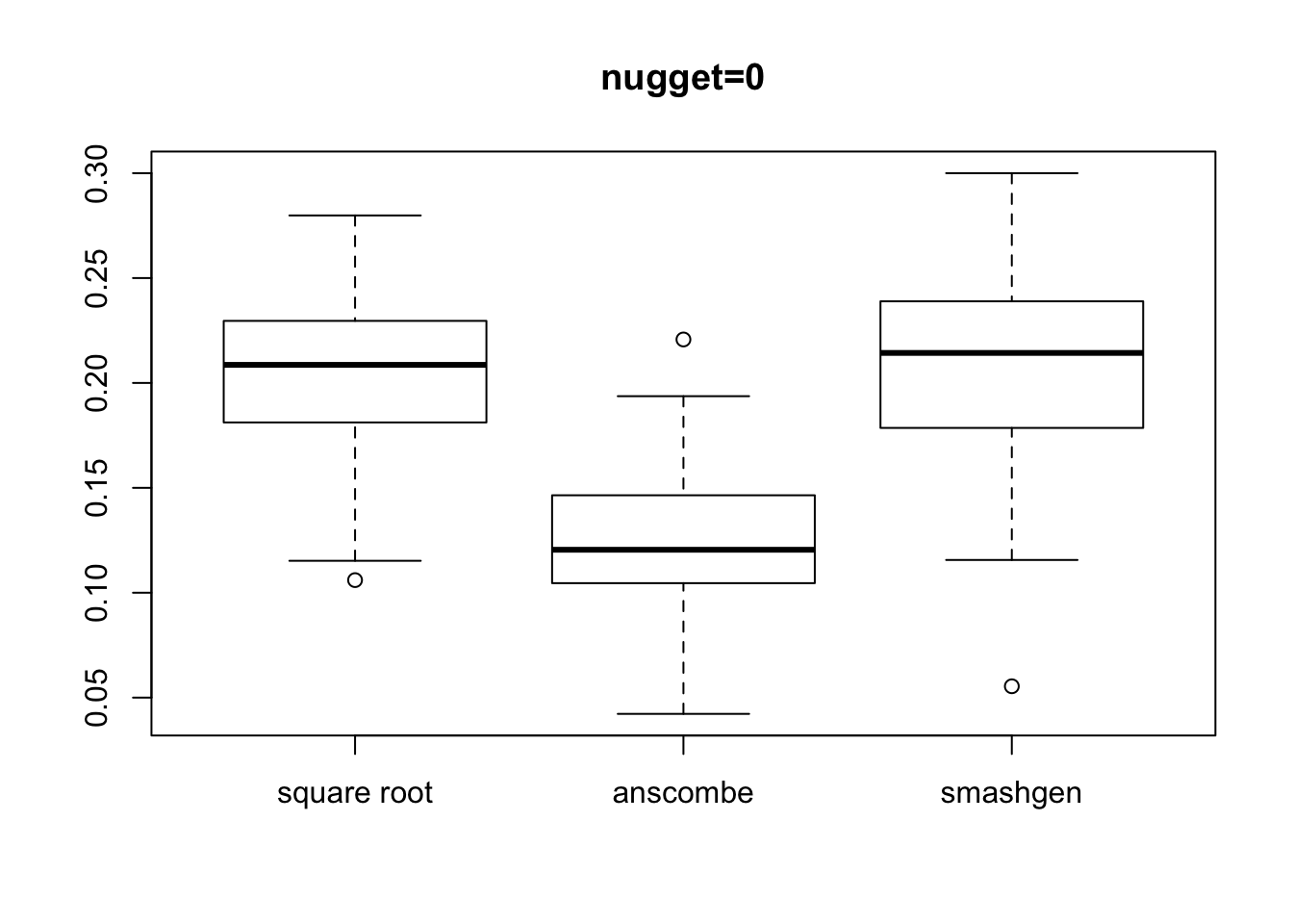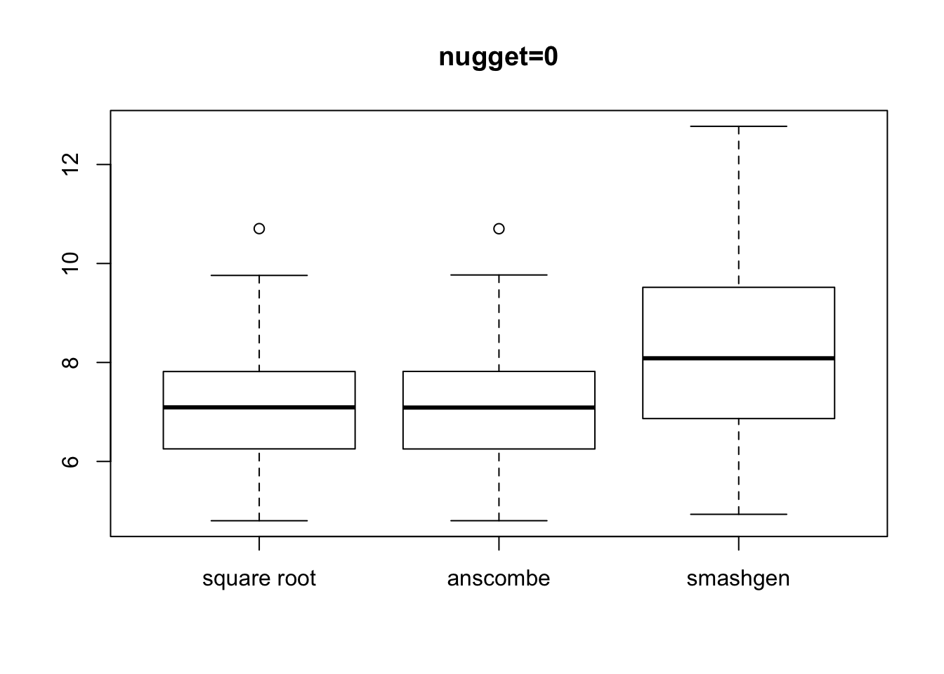 boxplot(mses,names = c('square root','anscombe','smashgen'),main='nugget=0')