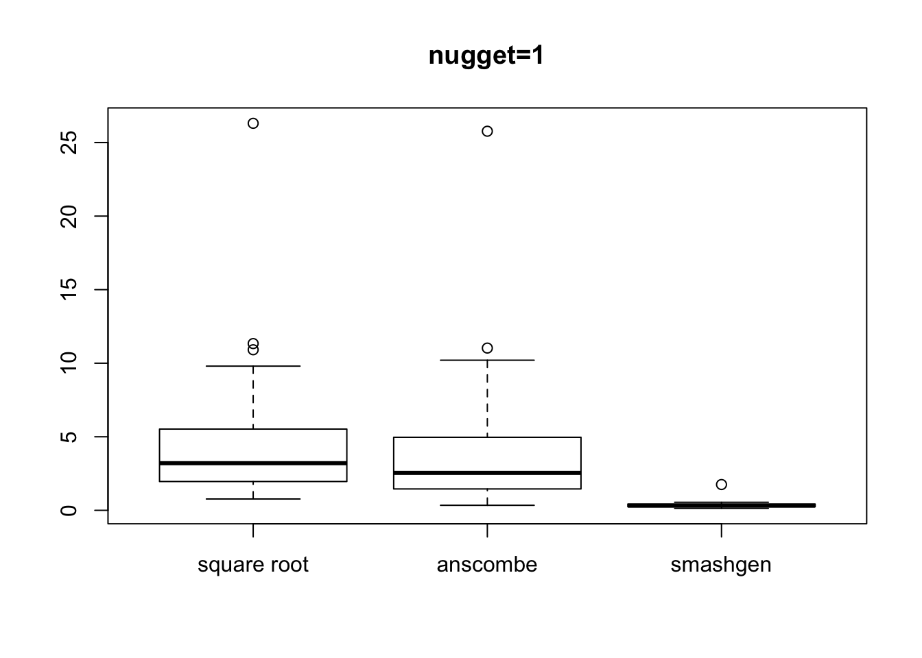 boxplot(mses,names = c('square root','anscombe','smashgen'),main='nugget=1')