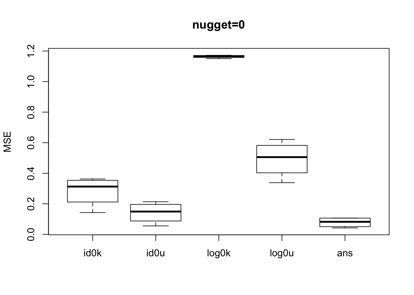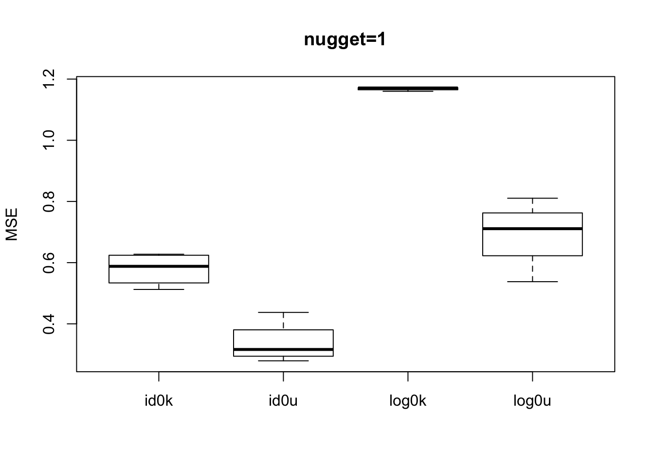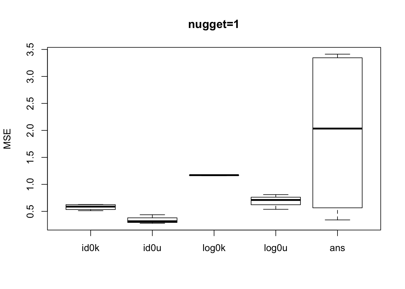 boxplot(mses[-c(1,2,5,6,9)],main='nugget=1',ylab='MSE')