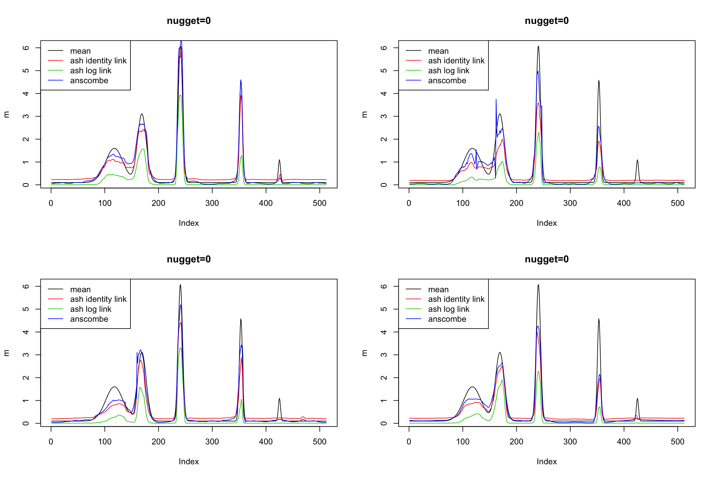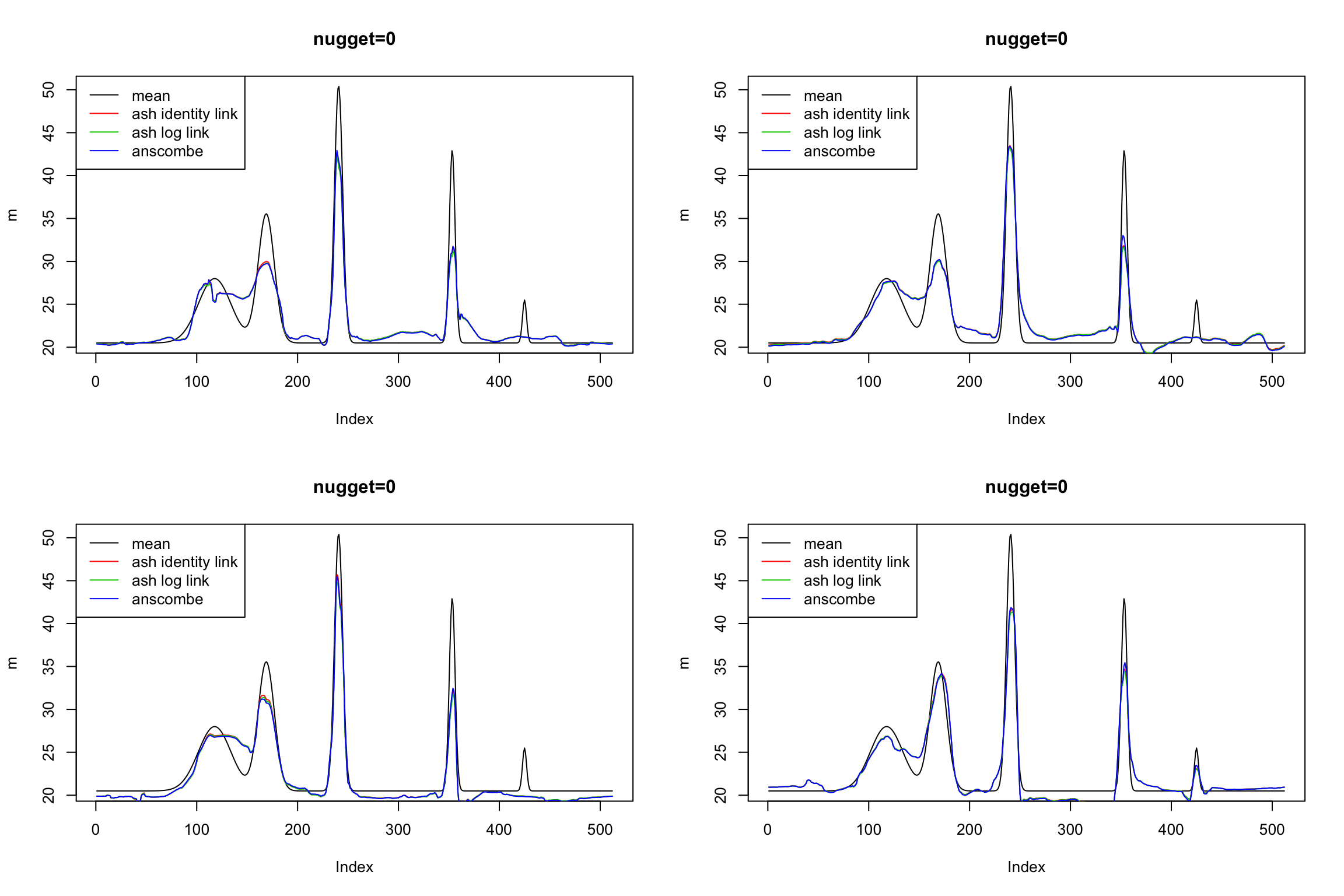Compare 1. smashgen-ash.identity 2. smashgen-ash.log 3. smashgen-ash.identity.zero 4. smashgen-ash.log.zero (known and unknown nugget effect) with smash-anscombe.