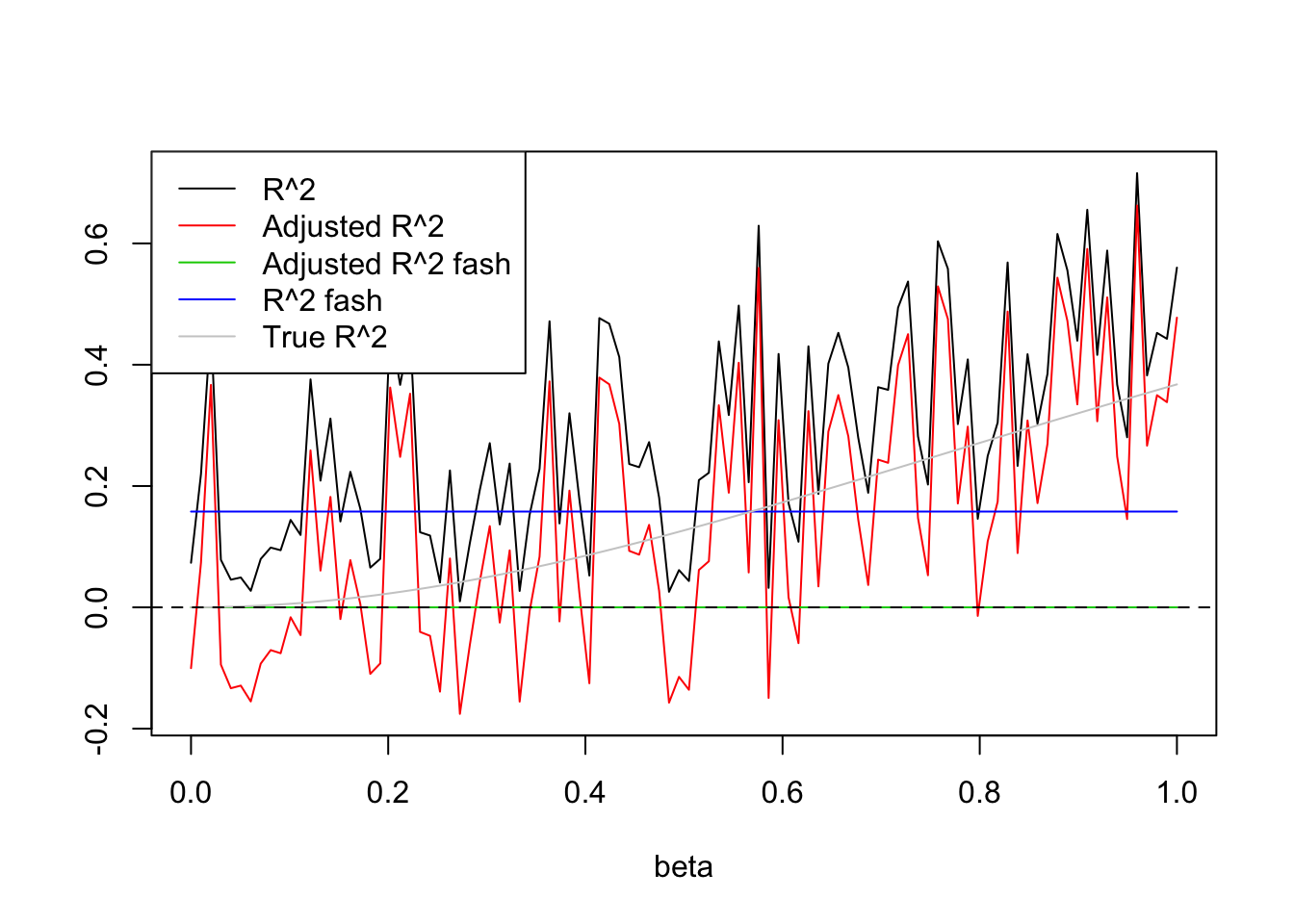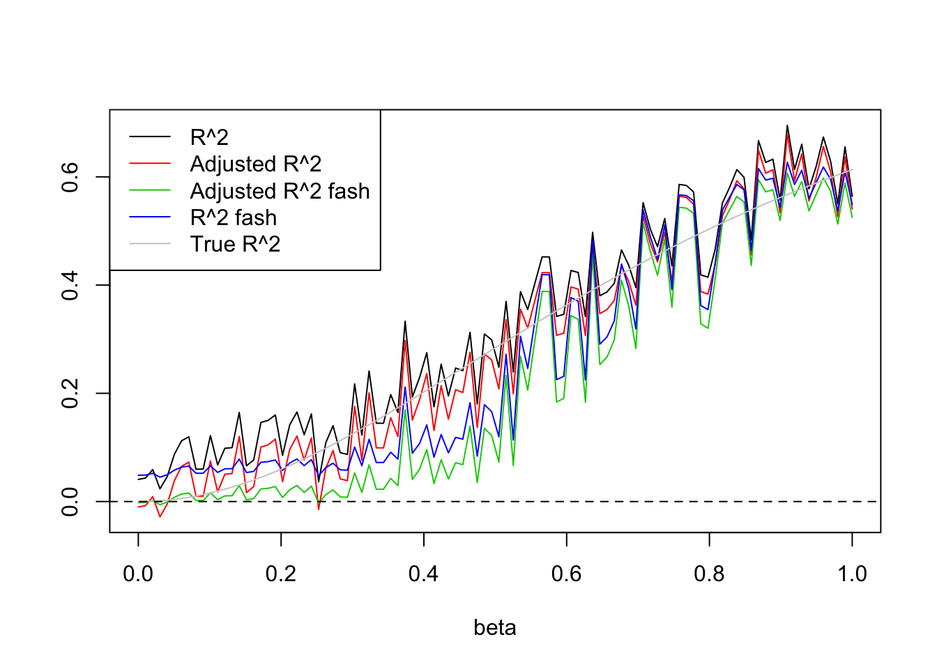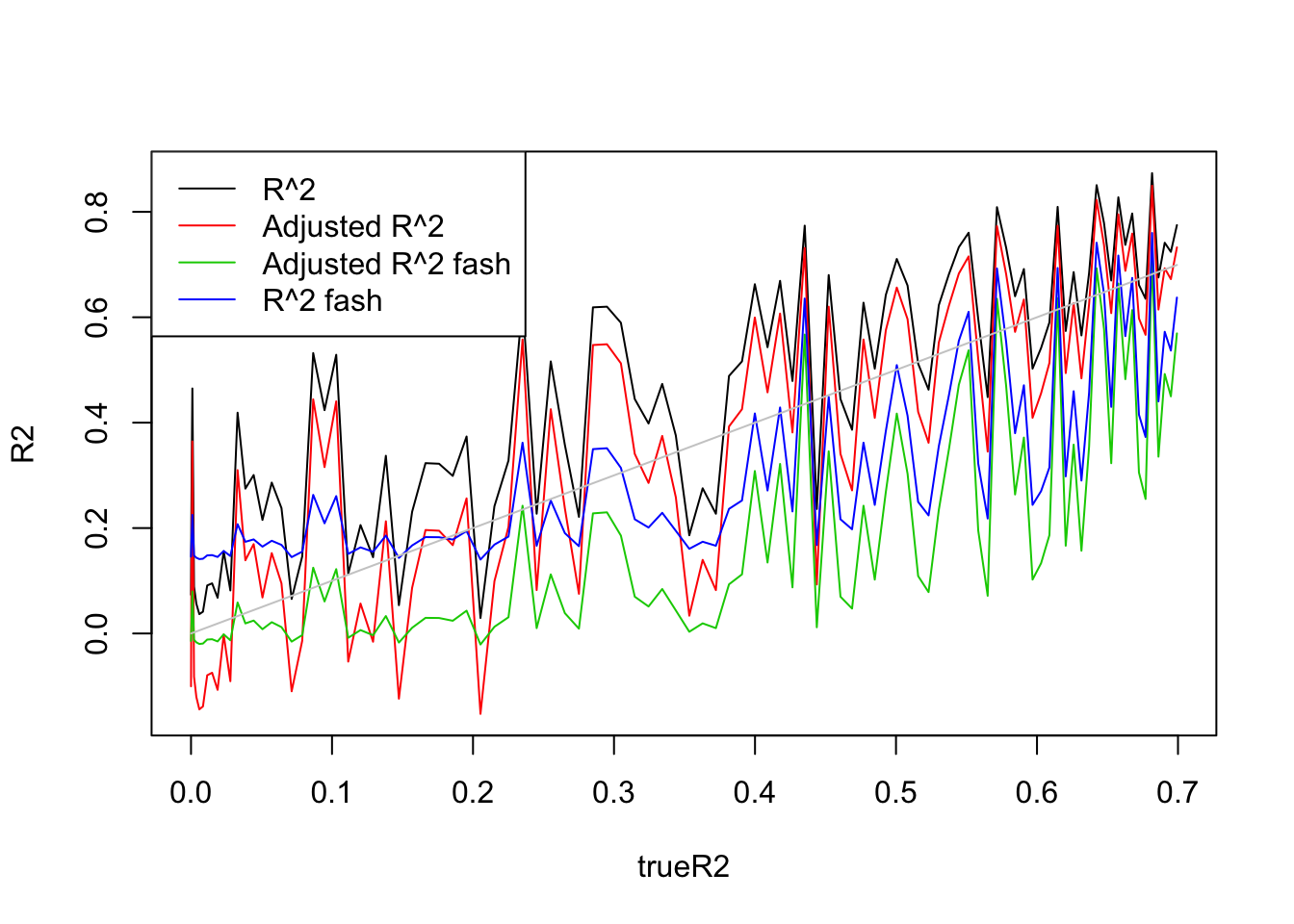 legend('topleft',c('R^2','Adjusted R^2','Adjusted R^2 fash','R^2 fash','True R^2'),lty=c(1,1,1,1,1),col=c(1,2,3,4,'grey80'))