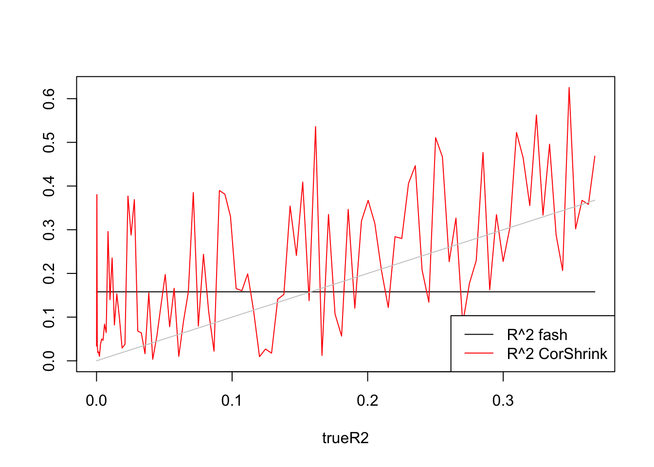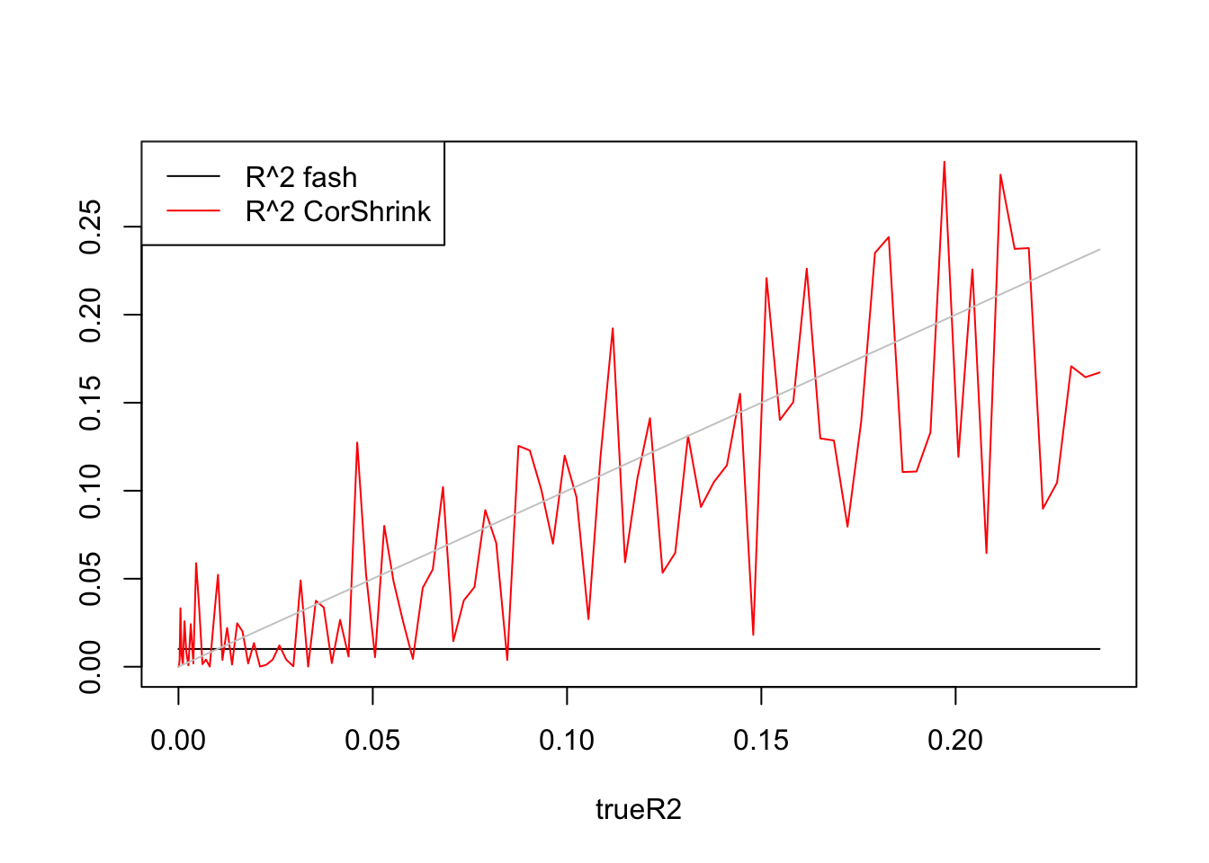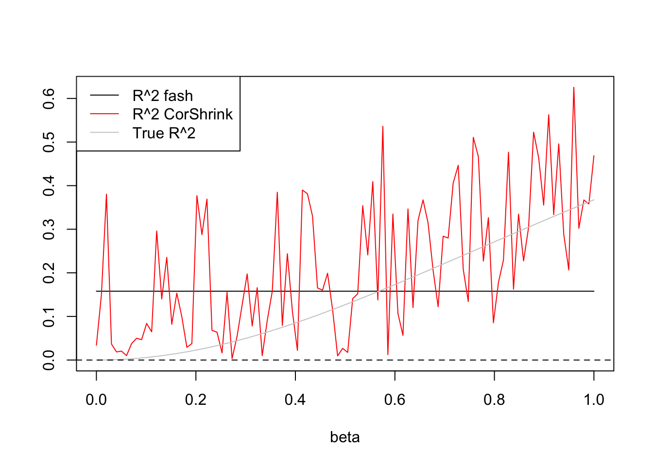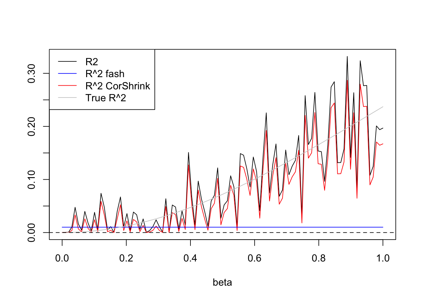 legend('topleft',c('R2','R^2 fash','R^2 CorShrink','True R^2'),lty=c(1,1,1,1),col=c(1,4,2,'grey80'))