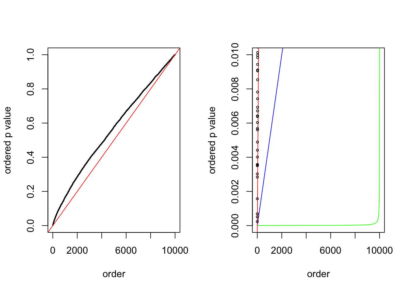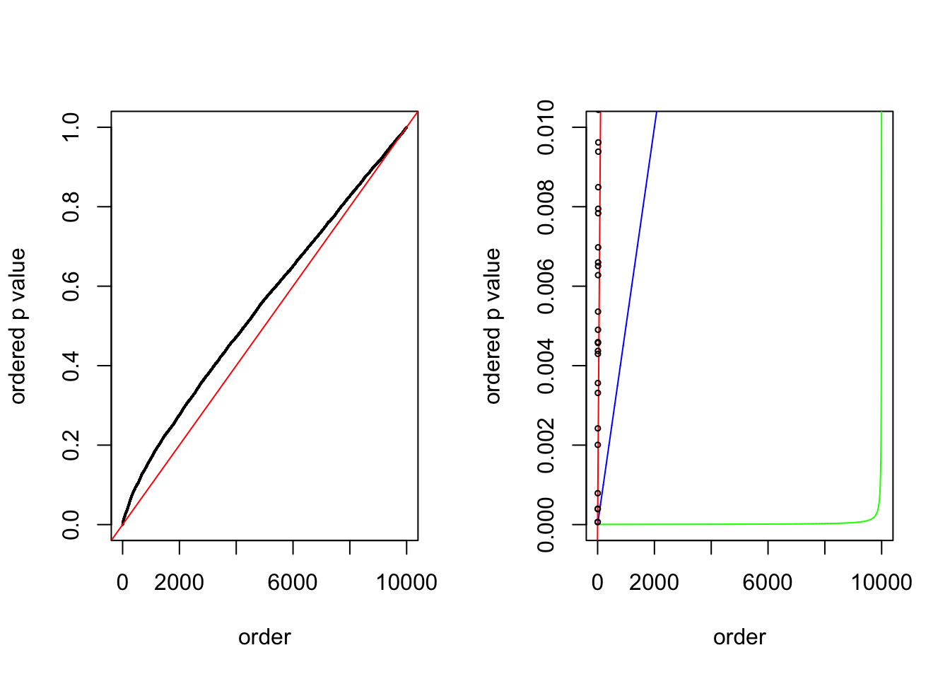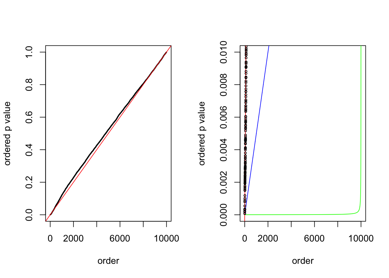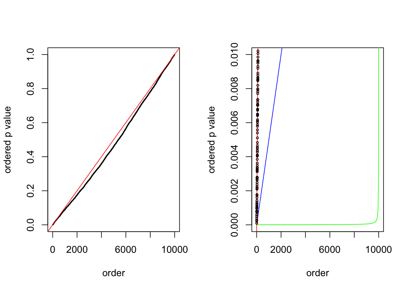 Here we plot \(10\) data sets. For each data set the left plots the ordered \(p\) values on the whole, and the right plot takes a look at the most extreme ones, as well as the critical values in Benjamini-Hochberg’s FDR (green) and Hochberg’s FWER (blue).