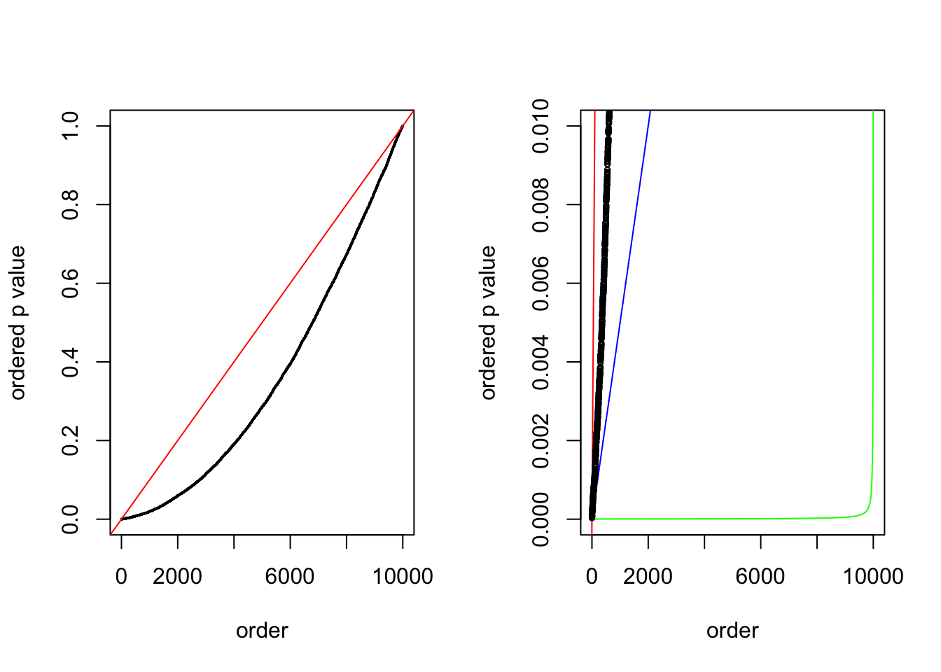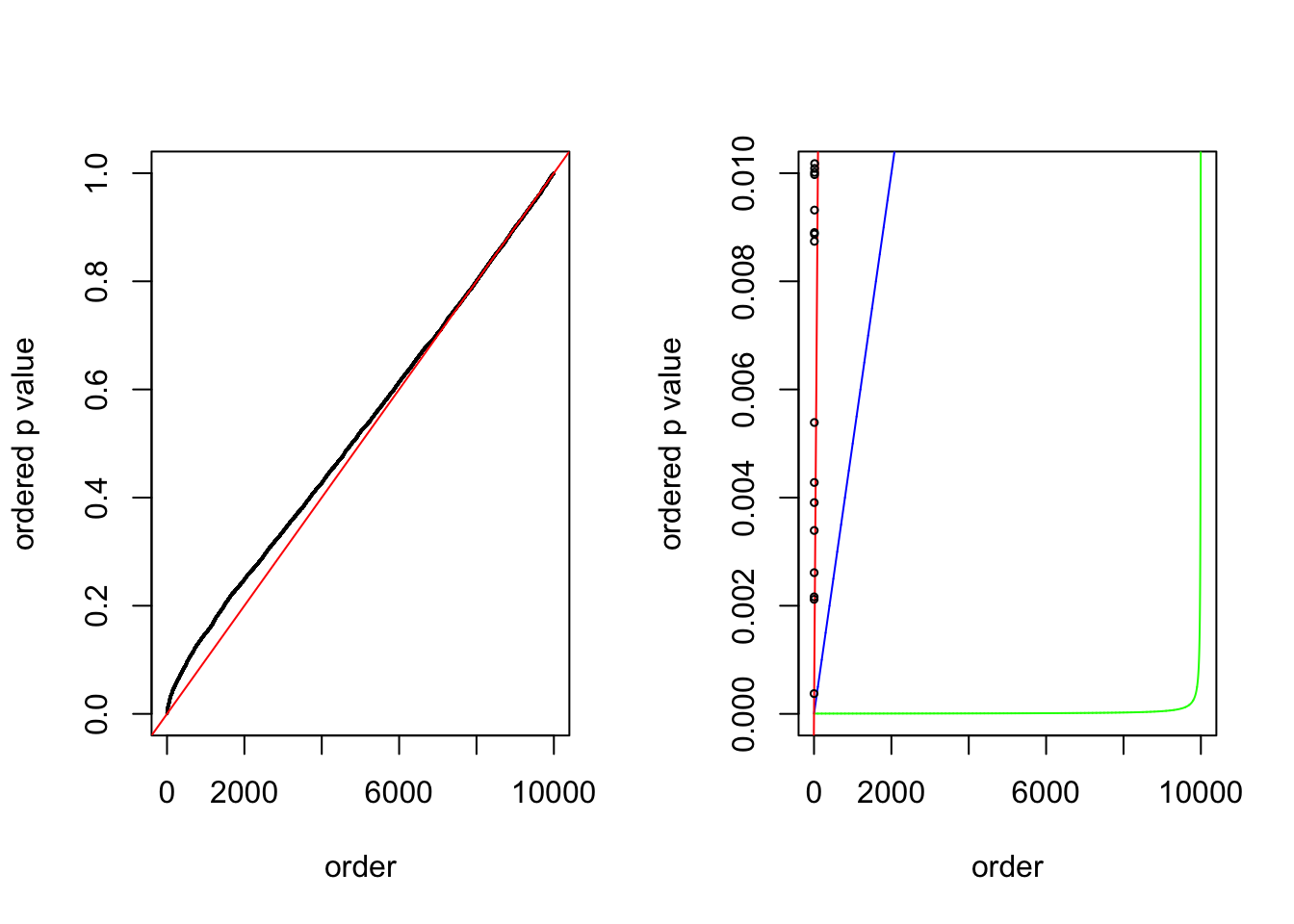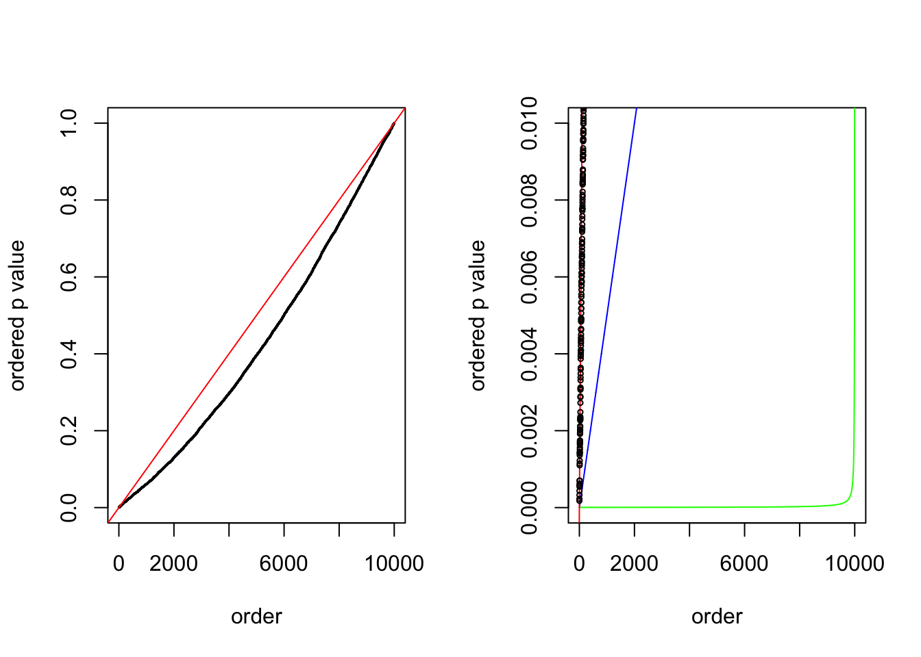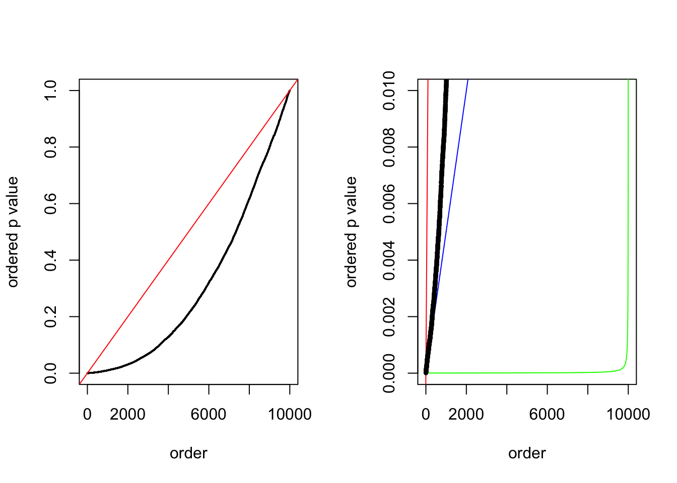 Here we plot \(10\) data sets. For each data set the left plots the ordered \(p\) values on the whole, and the right plot takes a look at the most extreme ones, as well as the critical values in Benjamini-Hochberg’s FDR (green) and Hochberg’s FWER (blue).