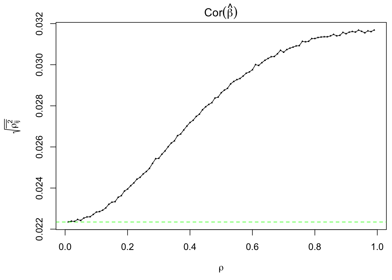 In all three settings, each row of \(X_{n \times p}\) is independently drawn from a \(N(0, \Sigma)\) distribution, where the diagonal elements of \(\Sigma\) are all one. Then the columns of \(X\) are normalized such that \(\|X_j\|_2^2 = 1\).