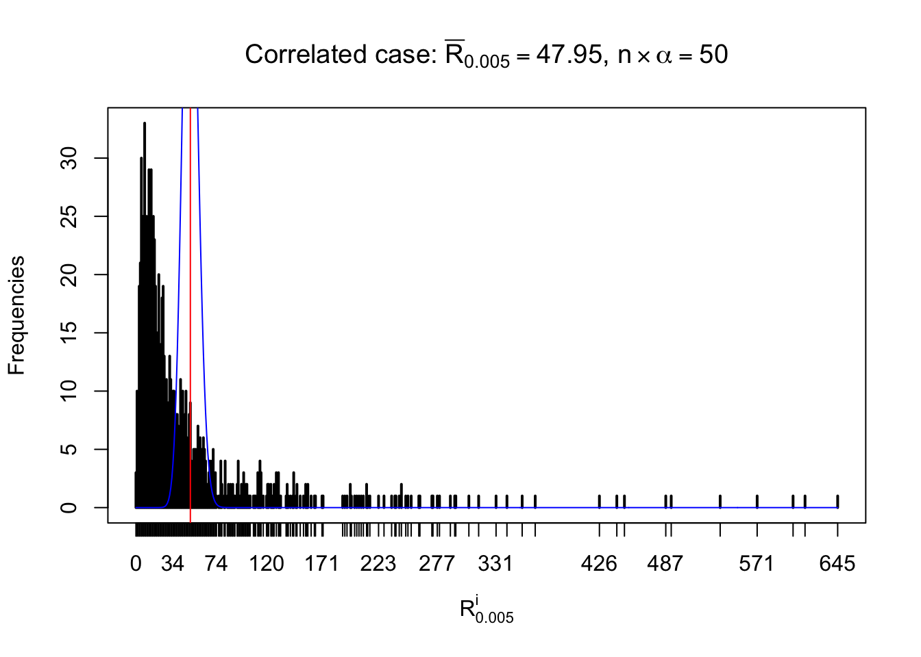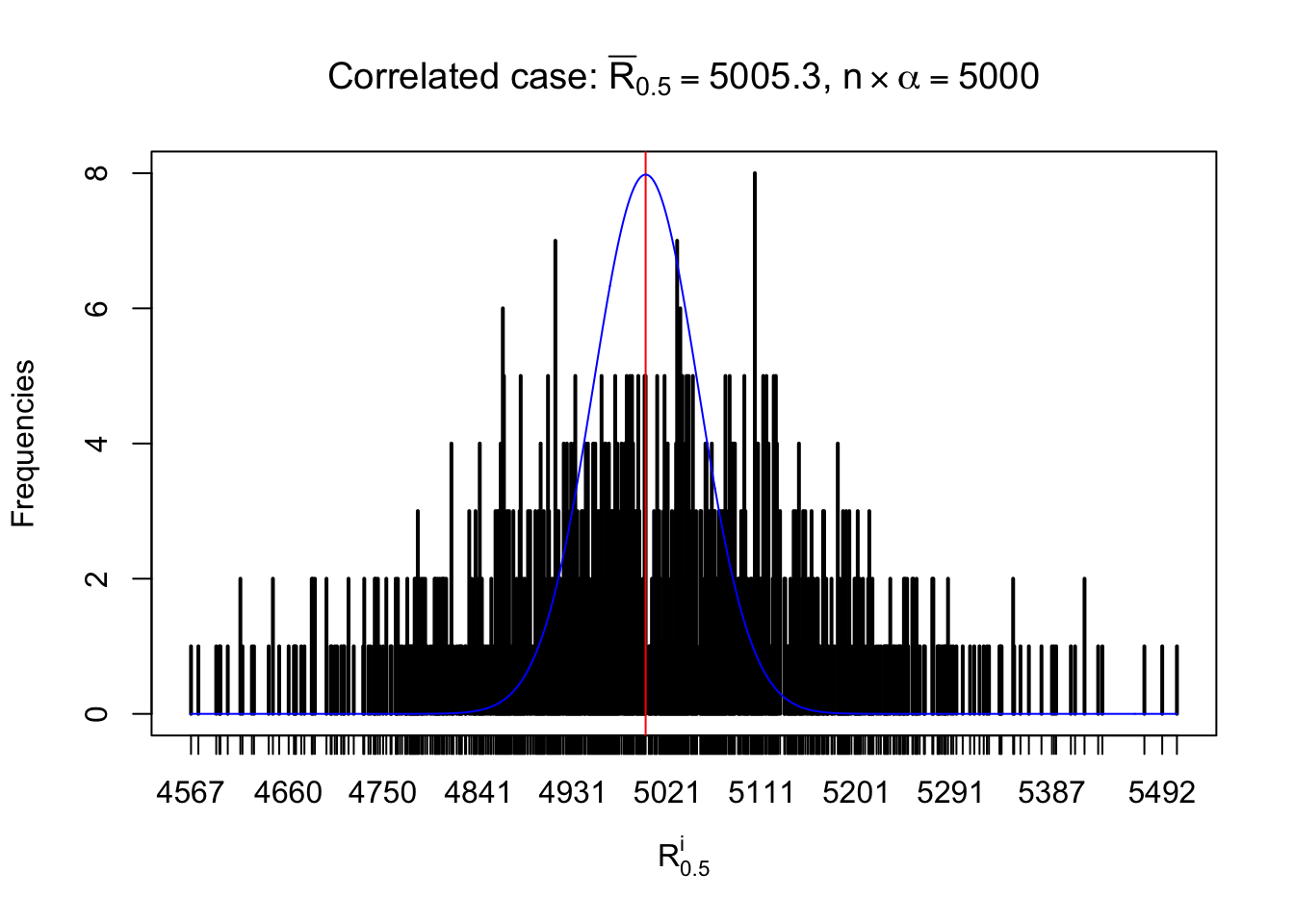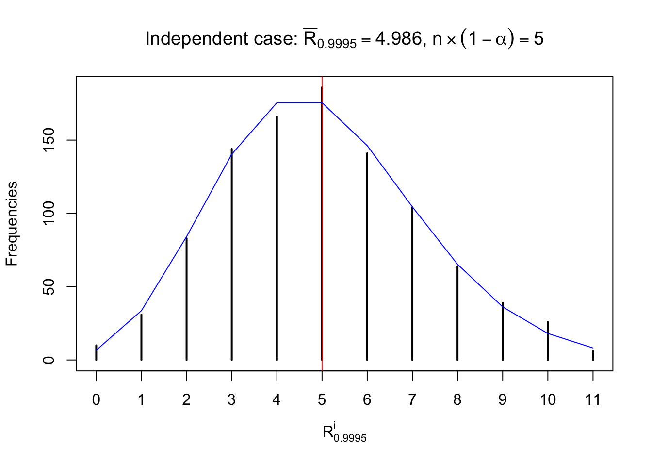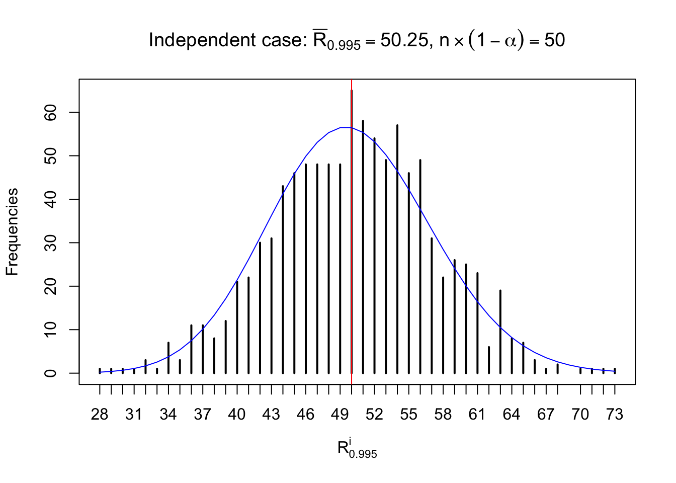 Defined this way, \(R_\alpha^i\) should be a sample from \(n \times F_n^{R_i}\left(z_\alpha\right)\) or \(n \times \left(1- F_n^{R_i}\left(z_\alpha\right)\right)\). We can check if \(E\left[F_n\left(z\right)\right] = \Phi\left(z\right)\) by looking at if the average \[ \bar R_\alpha \approx \begin{cases} n\Phi\left(z_\alpha\right) = n\alpha & \alpha \leq 0.5 \\ n\left(1-\Phi\left(z_\alpha\right)\right) = n\left(1 - \alpha\right) & \alpha > 0.5\end{cases} \ . \] We may also compare the frequencies of \(R_\alpha^i\) with their theoretical expected values \(m \times \text{Binomial}\left(n, \alpha\right)\) (in blue) assuming \(z_{ij}\) are independent.