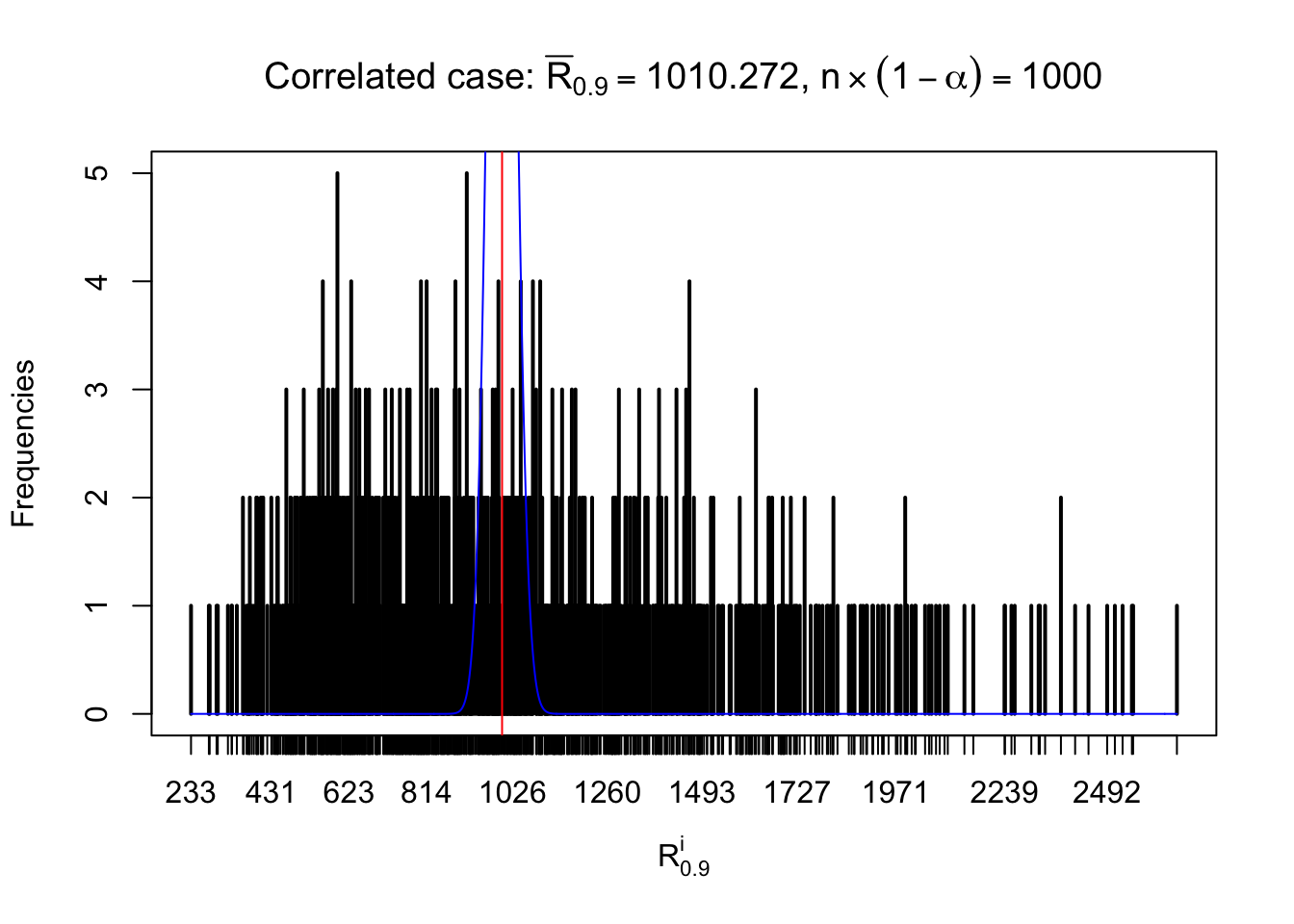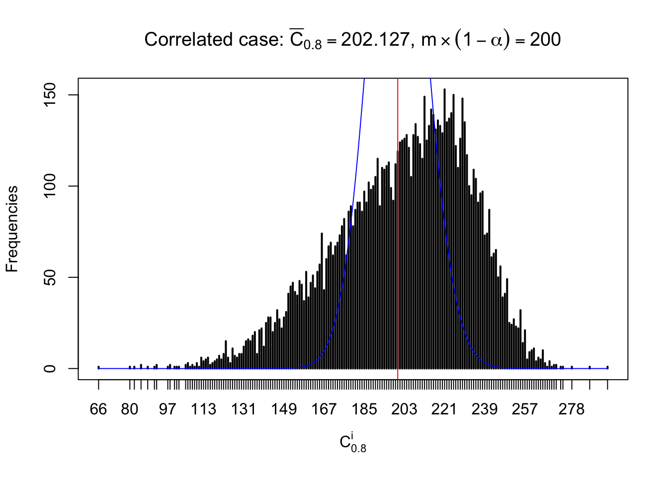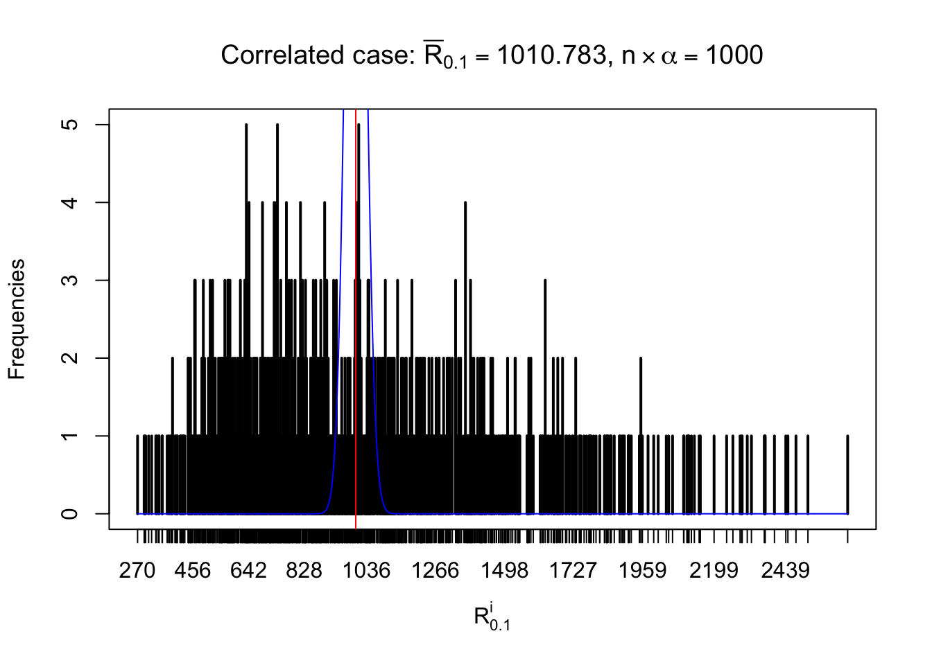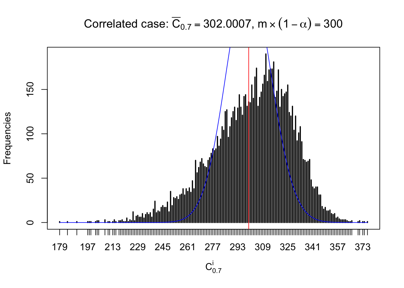Defined this way, \(R_\alpha^i\) should be a sample from \(n \times F_n^{R_i}\left(z_\alpha\right)\) or \(n \times \left(1- F_n^{R_i}\left(z_\alpha\right)\right)\). We can check if \(E\left[F_n\left(z\right)\right] = \Phi\left(z\right)\) by looking at if the average \[ \bar R_\alpha \approx \begin{cases} n\Phi\left(z_\alpha\right) = n\alpha & \alpha \leq 0.5 \\ n\left(1-\Phi\left(z_\alpha\right)\right) = n\left(1 - \alpha\right) & \alpha > 0.5\end{cases} \ . \] We may also compare the frequencies of \(R_\alpha^i\) with their theoretical expected values \(m \times \text{Binomial}\left(n, \alpha\right)\) (in blue) assuming \(z_{ij}\) are independent.