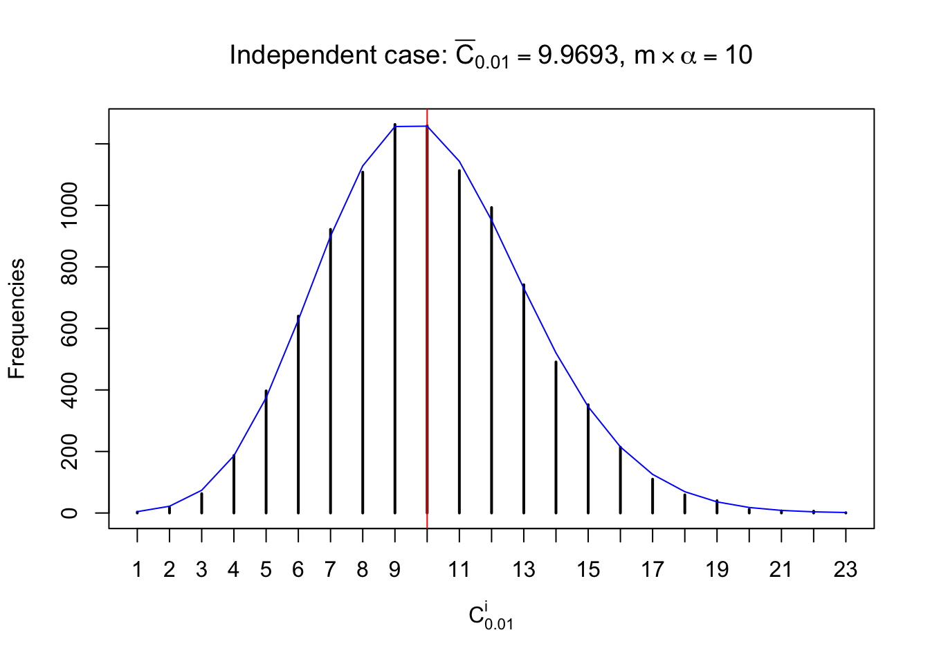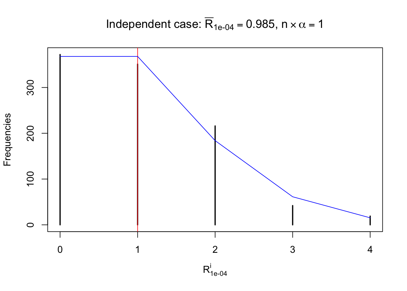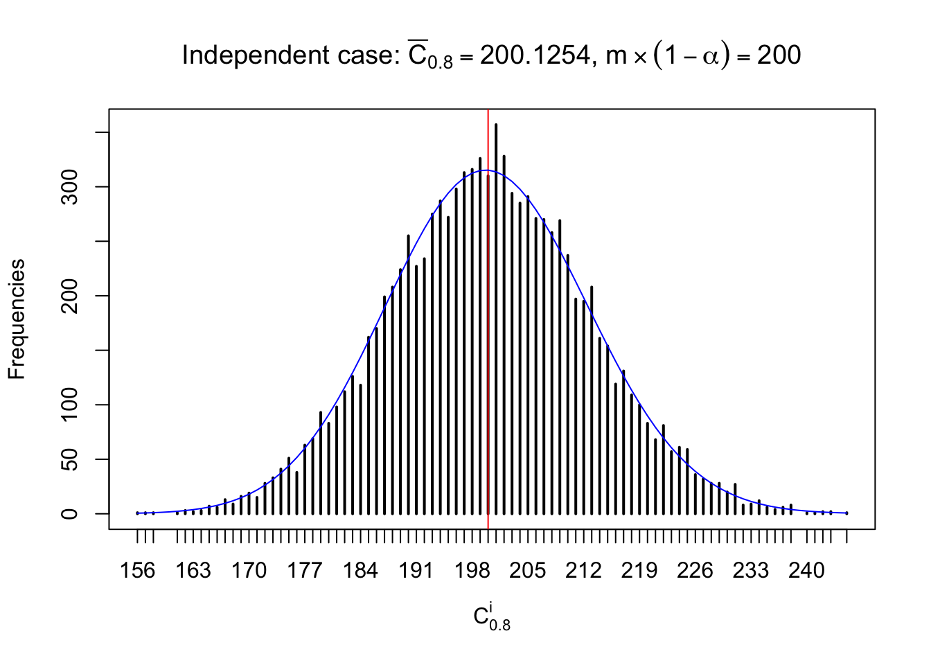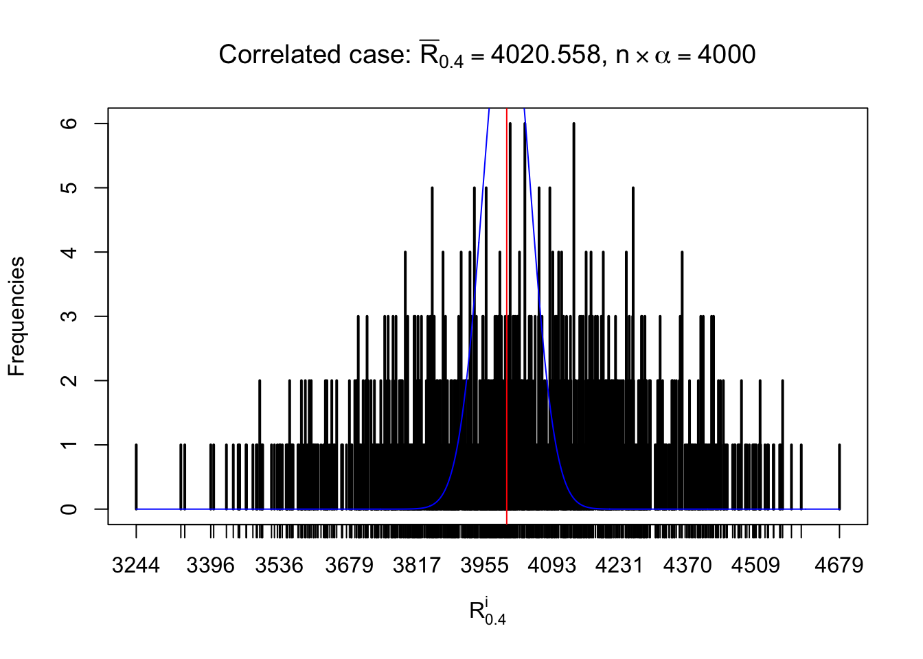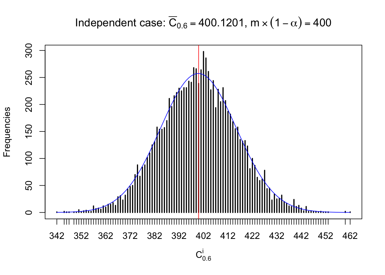 Defined this way, \(R_\alpha^i\) should be a sample from \(n \times F_n^{R_i}\left(z_\alpha\right)\) or \(n \times \left(1- F_n^{R_i}\left(z_\alpha\right)\right)\). We can check if \(E\left[F_n\left(z\right)\right] = \Phi\left(z\right)\) by looking at if the average \[ \bar R_\alpha \approx \begin{cases} n\Phi\left(z_\alpha\right) = n\alpha & \alpha \leq 0.5 \\ n\left(1-\Phi\left(z_\alpha\right)\right) = n\left(1 - \alpha\right) & \alpha > 0.5\end{cases} \ . \] We may also compare the frequencies of \(R_\alpha^i\) with their theoretical expected values \(m \times \text{Binomial}\left(n, \alpha\right)\) (in blue) assuming \(z_{ij}\) are independent.