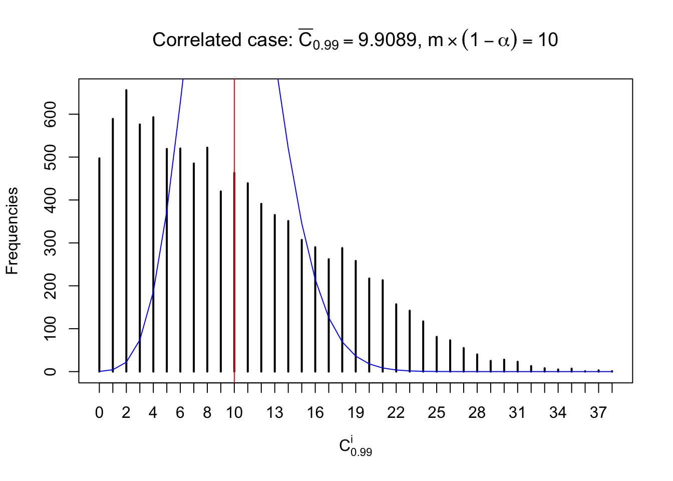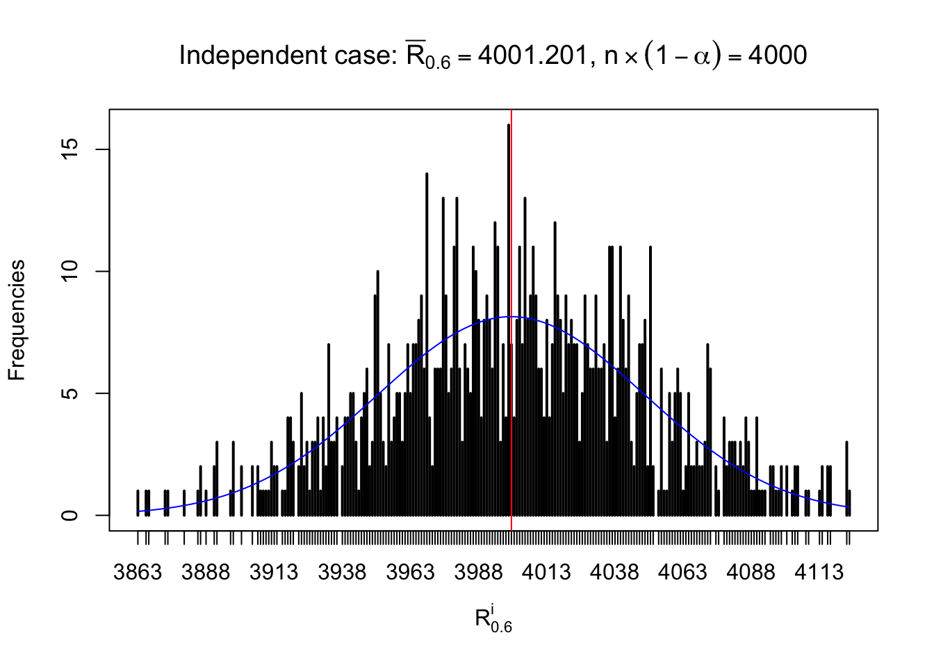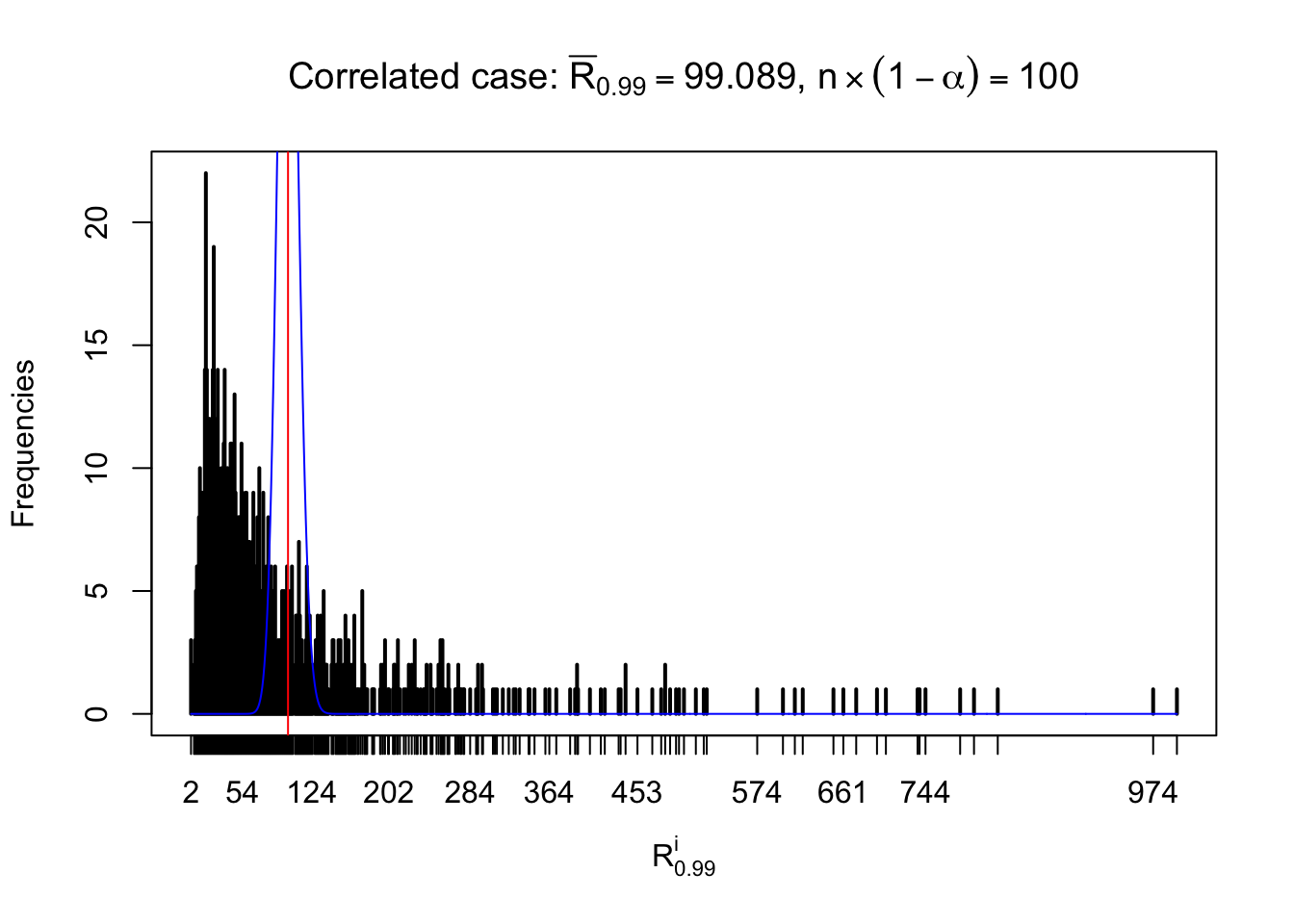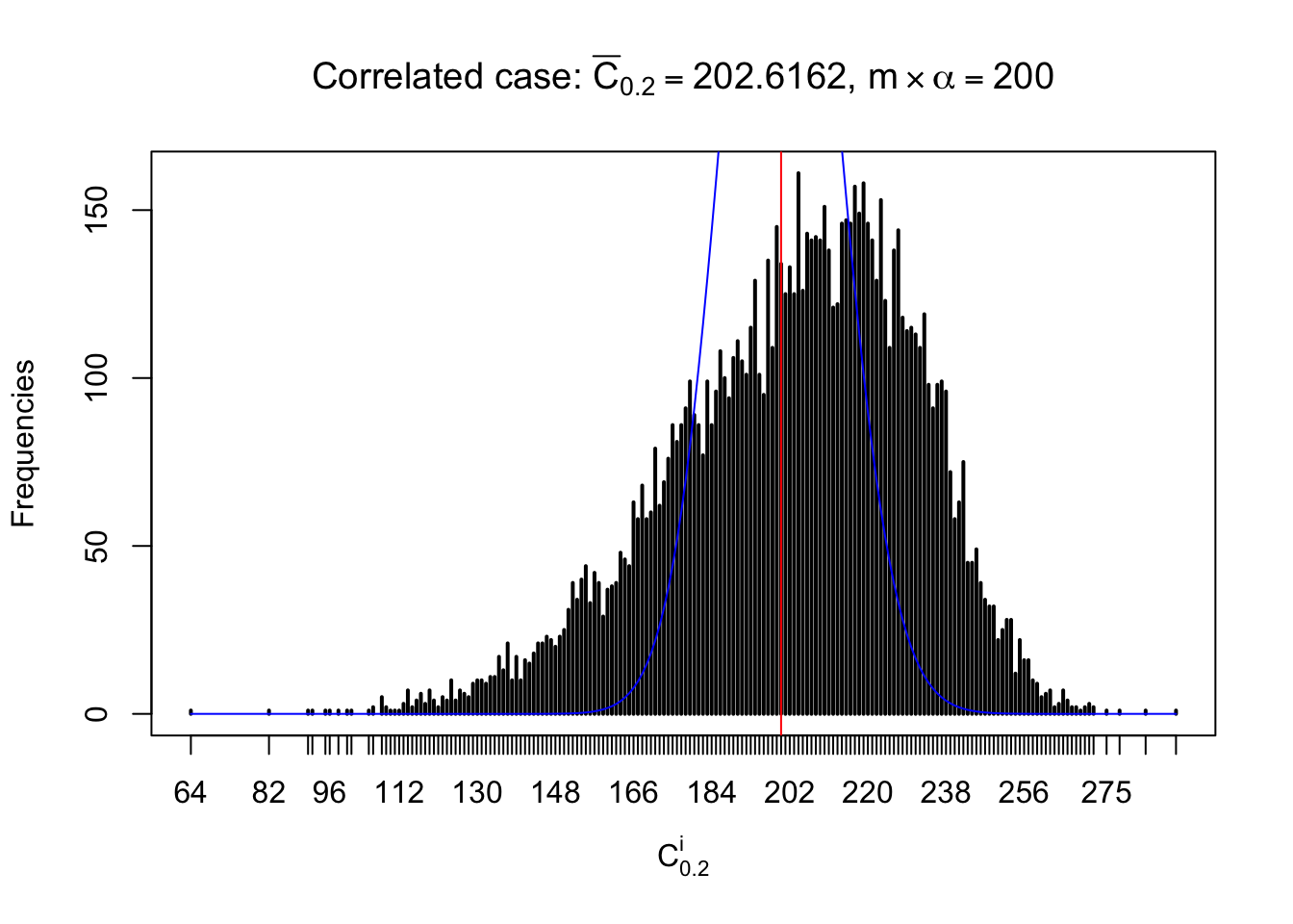 Defined this way, \(R_\alpha^i\) should be a sample from \(n \times F_n^{R_i}\left(z_\alpha\right)\) or \(n \times \left(1- F_n^{R_i}\left(z_\alpha\right)\right)\). We can check if \(E\left[F_n\left(z\right)\right] = \Phi\left(z\right)\) by looking at if the average \[ \bar R_\alpha \approx \begin{cases} n\Phi\left(z_\alpha\right) = n\alpha & \alpha \leq 0.5 \\ n\left(1-\Phi\left(z_\alpha\right)\right) = n\left(1 - \alpha\right) & \alpha > 0.5\end{cases} \ . \] We may also compare the frequencies of \(R_\alpha^i\) with their theoretical expected values \(m \times \text{Binomial}\left(n, \alpha\right)\) (in blue) assuming \(z_{ij}\) are independent.