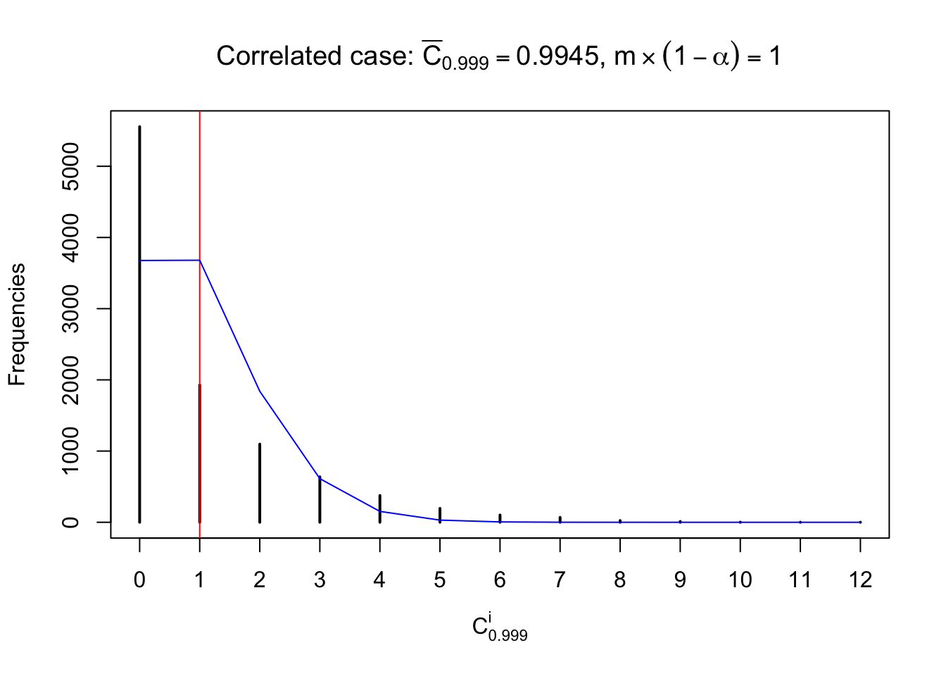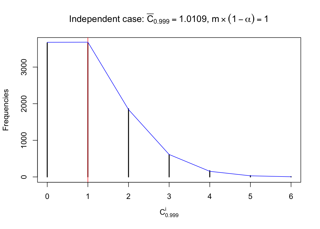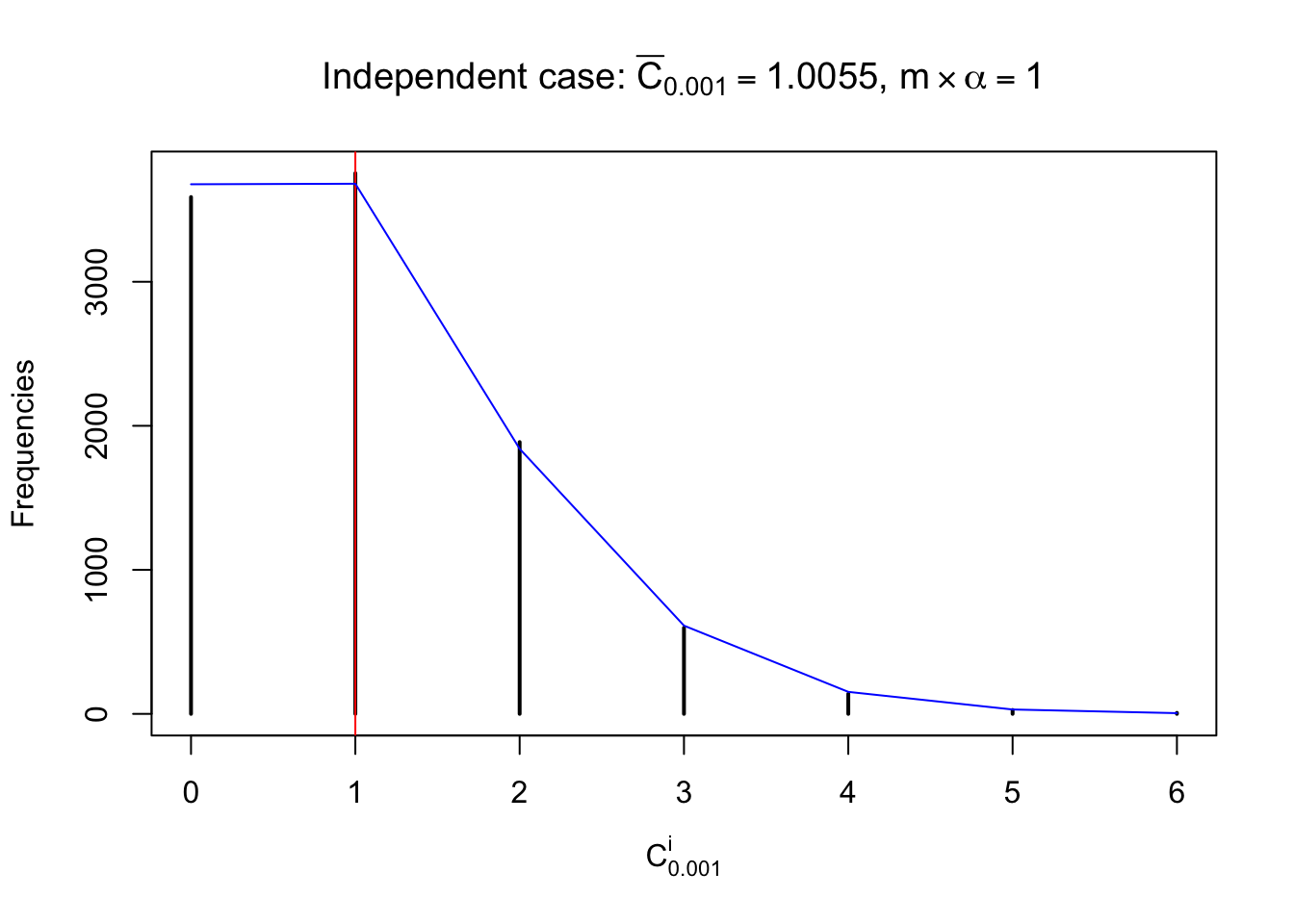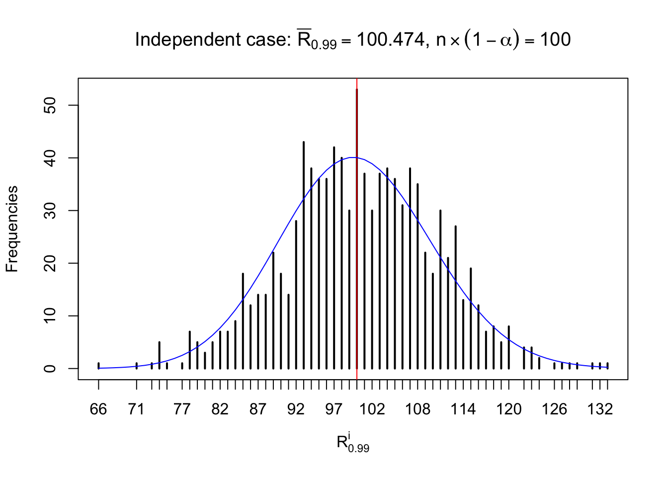 Defined this way, \(R_\alpha^i\) should be a sample from \(n \times F_n^{R_i}\left(z_\alpha\right)\) or \(n \times \left(1- F_n^{R_i}\left(z_\alpha\right)\right)\). We can check if \(E\left[F_n\left(z\right)\right] = \Phi\left(z\right)\) by looking at if the average \[ \bar R_\alpha \approx \begin{cases} n\Phi\left(z_\alpha\right) = n\alpha & \alpha \leq 0.5 \\ n\left(1-\Phi\left(z_\alpha\right)\right) = n\left(1 - \alpha\right) & \alpha > 0.5\end{cases} \ . \] We may also compare the frequencies of \(R_\alpha^i\) with their theoretical expected values \(m \times \text{Binomial}\left(n, \alpha\right)\) (in blue) assuming \(z_{ij}\) are independent.