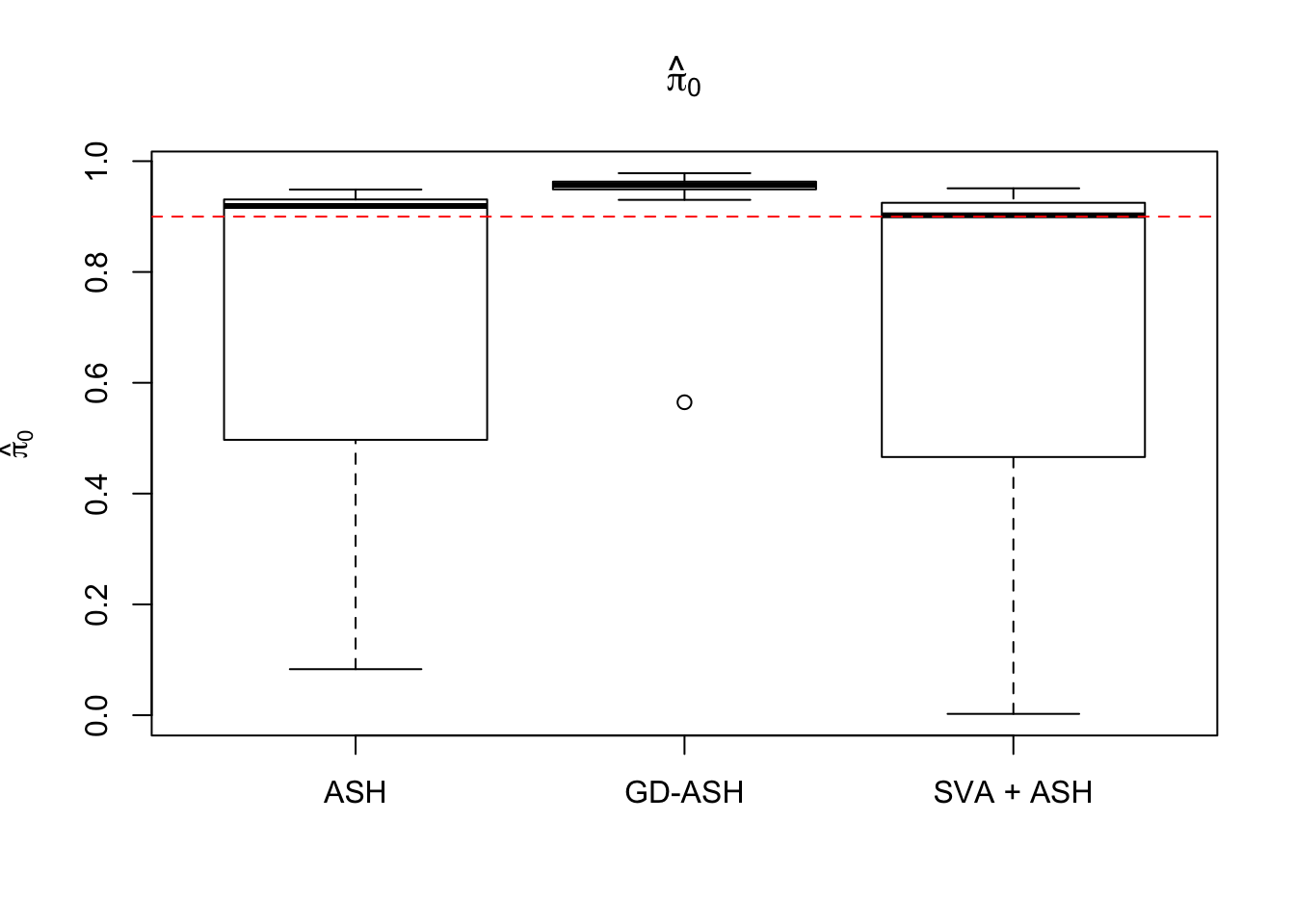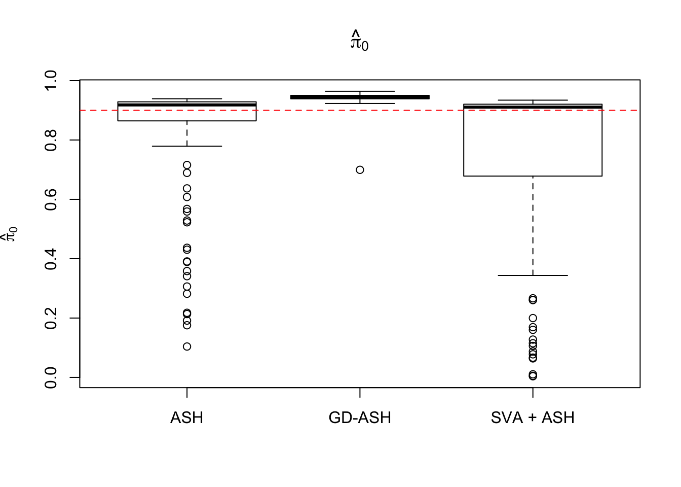 Artefactual effects \(\pi_0\delta_0 + \left(1 - \pi_0\right)N\left(0, \sigma^2\right)\) are added to the real GTEx data.
