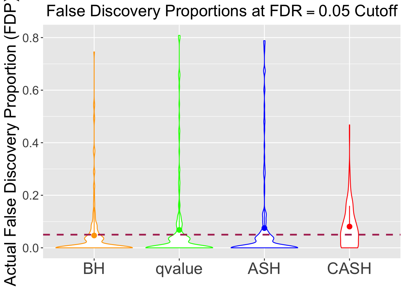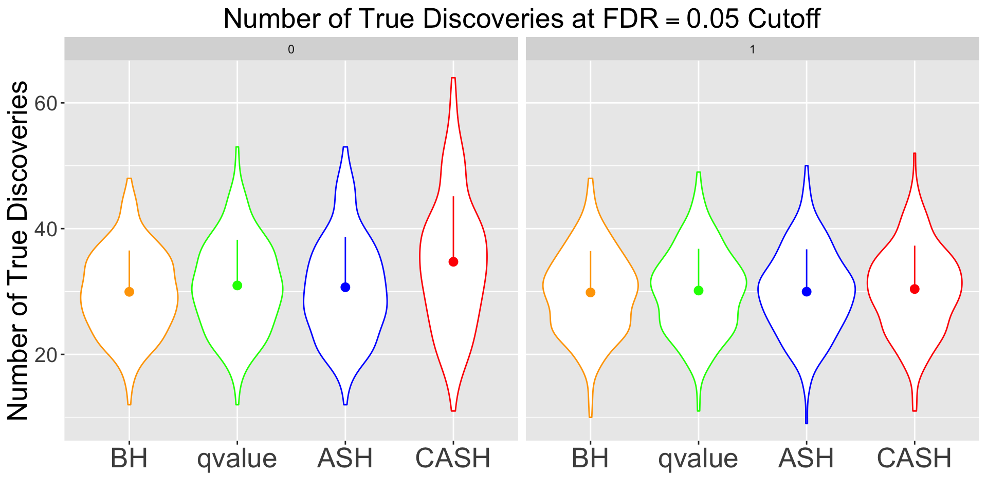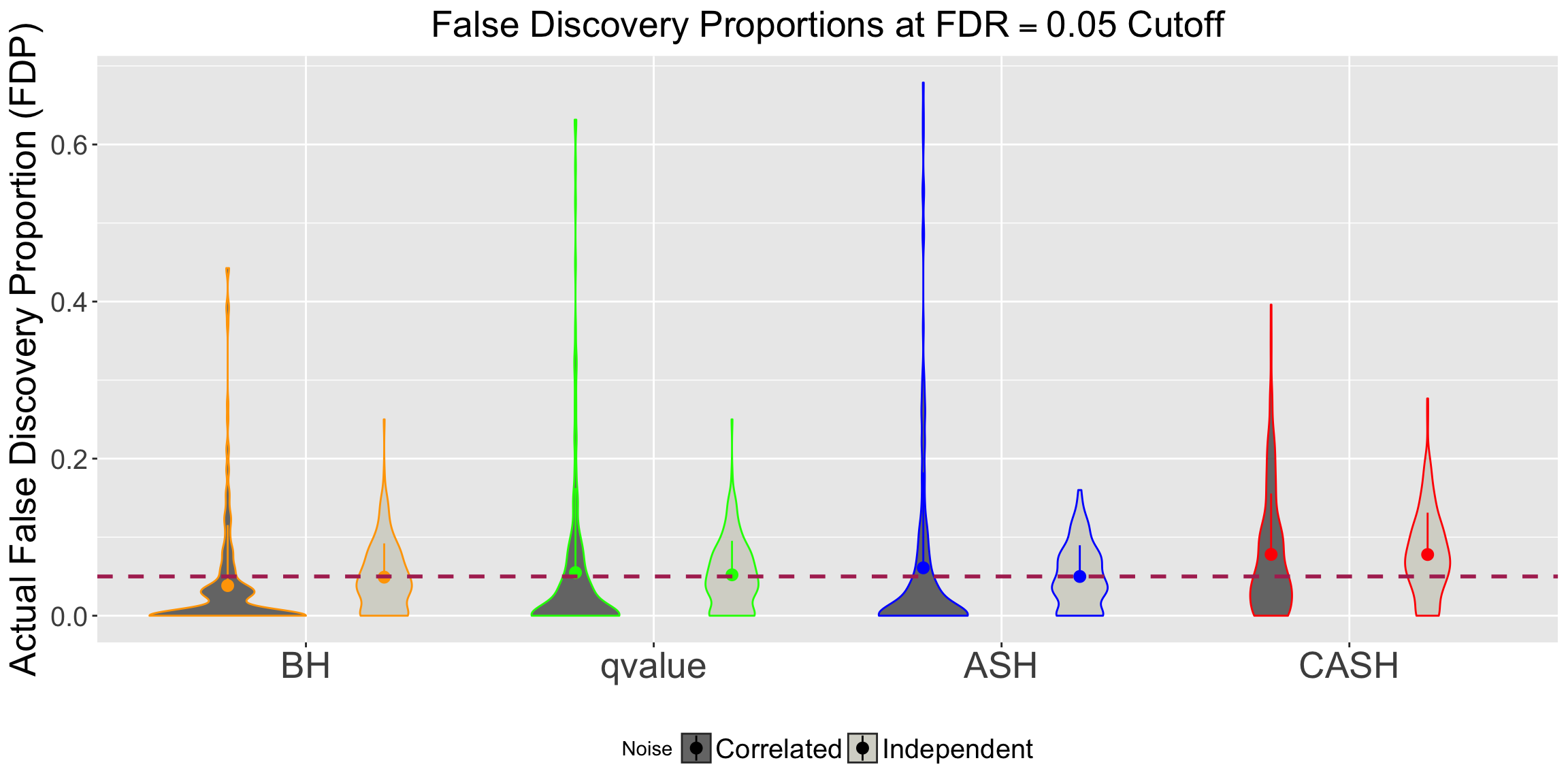 The following plots show that although the performance of CASH is not ideal for the more sparse case (\(\pi_0 = 0.9\)), it gives results under correlation similar to what other methods give under independence.