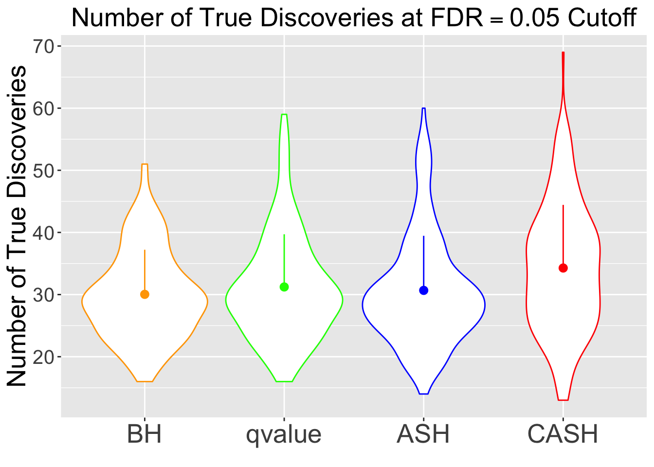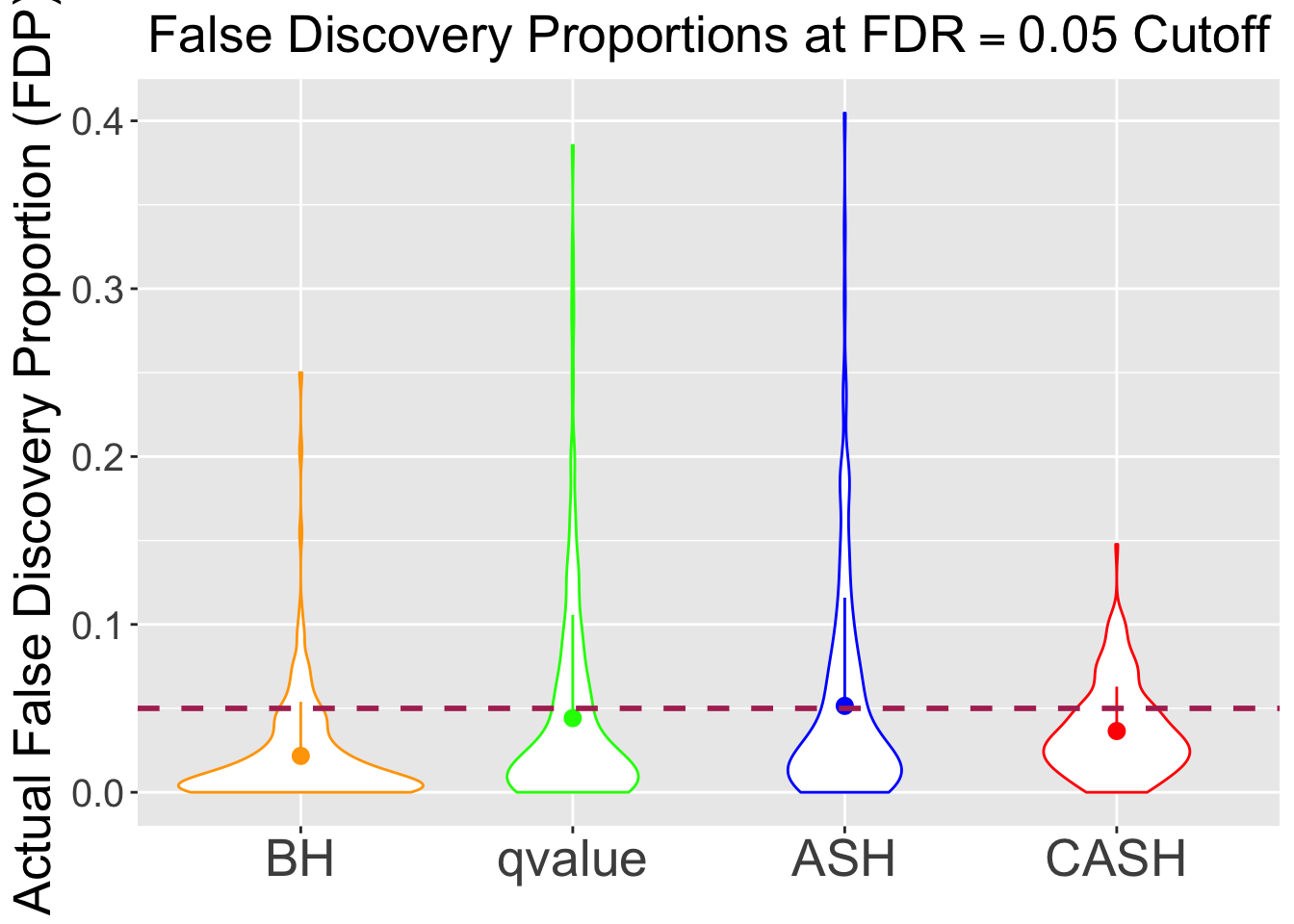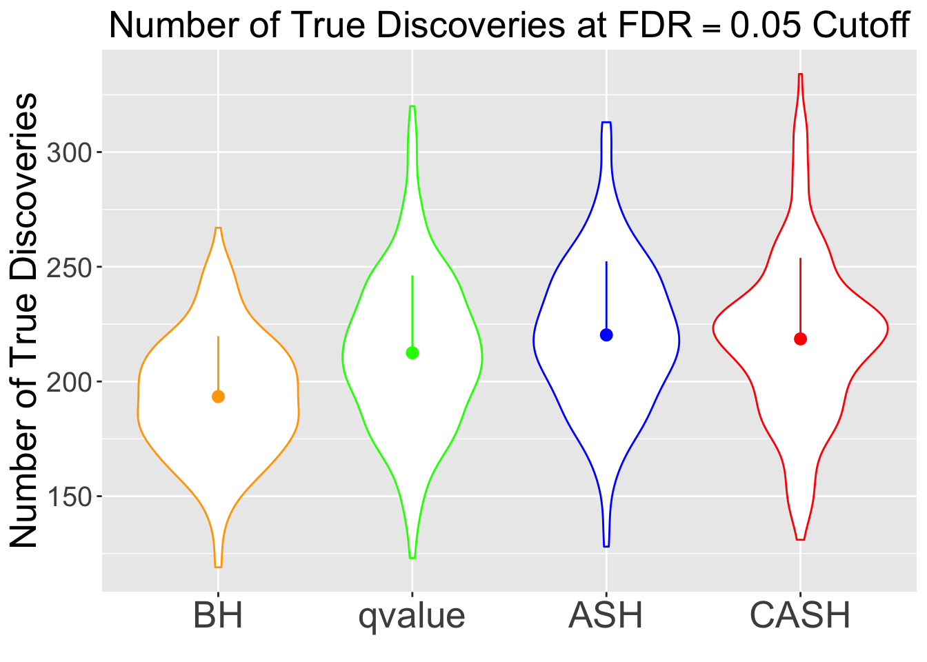 The following plots show that although the performance of CASH is not ideal for the more sparse case (\(\pi_0 = 0.9\)), it gives results under correlation similar to what other methods give under independence.