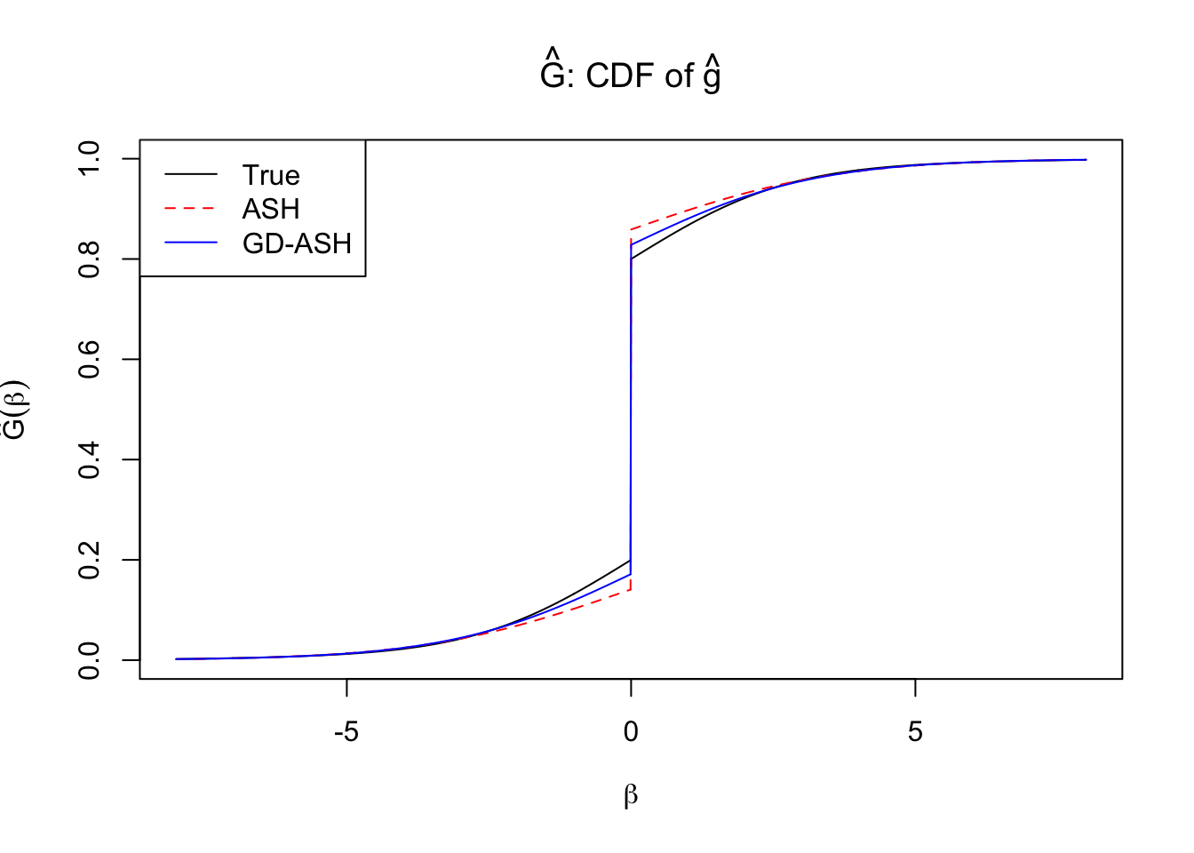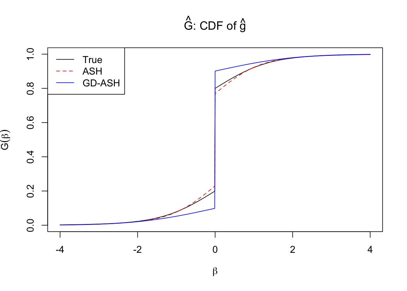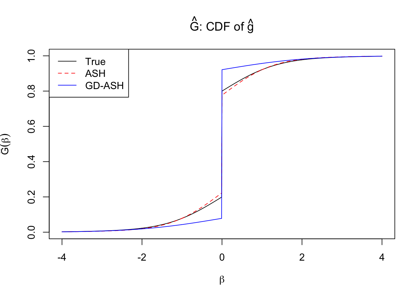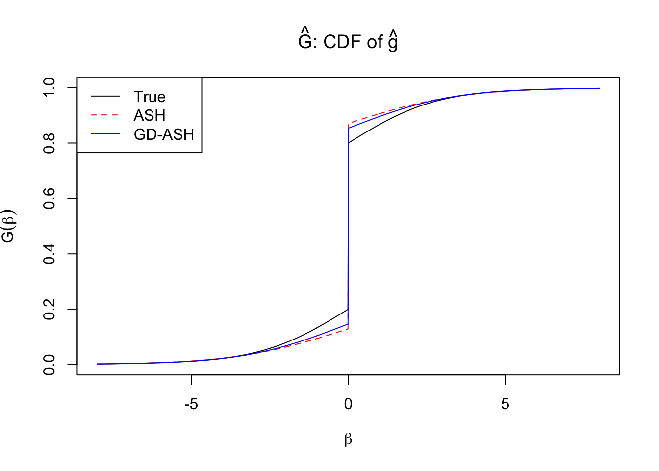 \[ \begin{array}{c} \beta_j \sim g = \sum\limits_{k=0}^K\pi_kg_k \ ;\\ g \text{ is unimodal} \ ; \\ \hat\beta_j | \beta_j, \hat s_j = \beta_j + \hat s_jz_j \ ;\\ z_j \sim N(0, 1) \text{, marginally} \ ; \\ z_j \text{ correlated} \ . \end{array} \] ## Fitting the model
