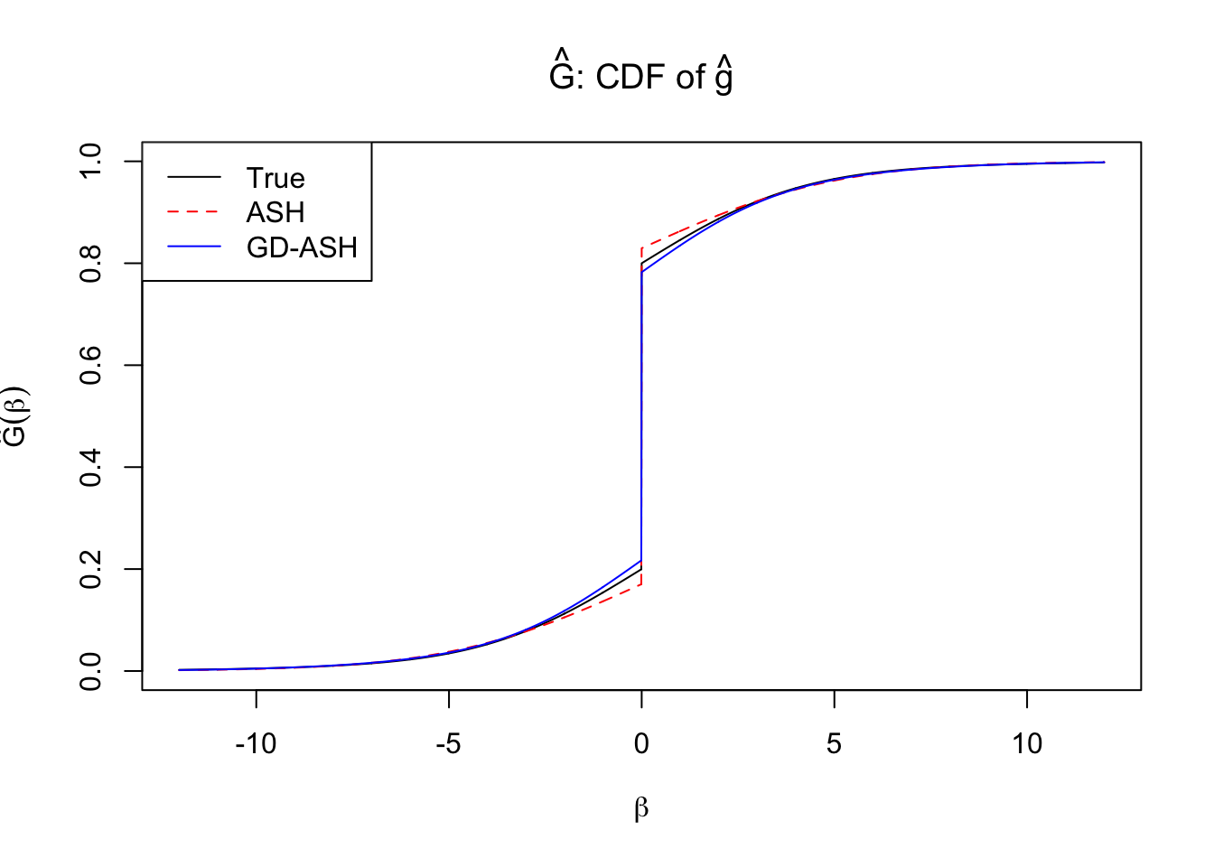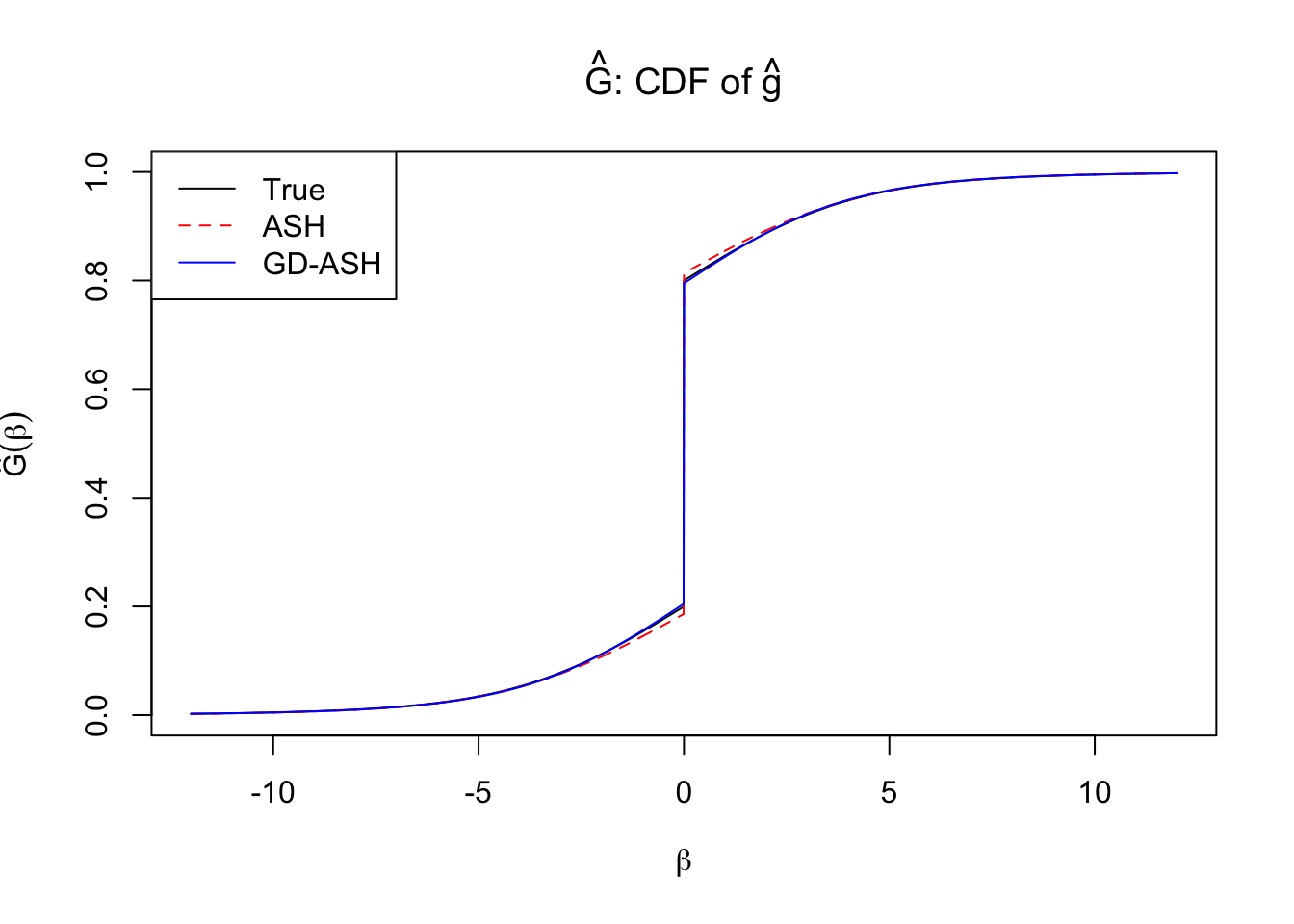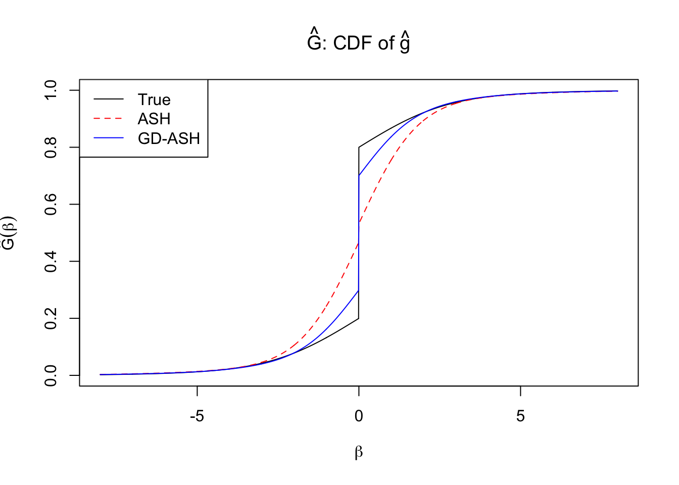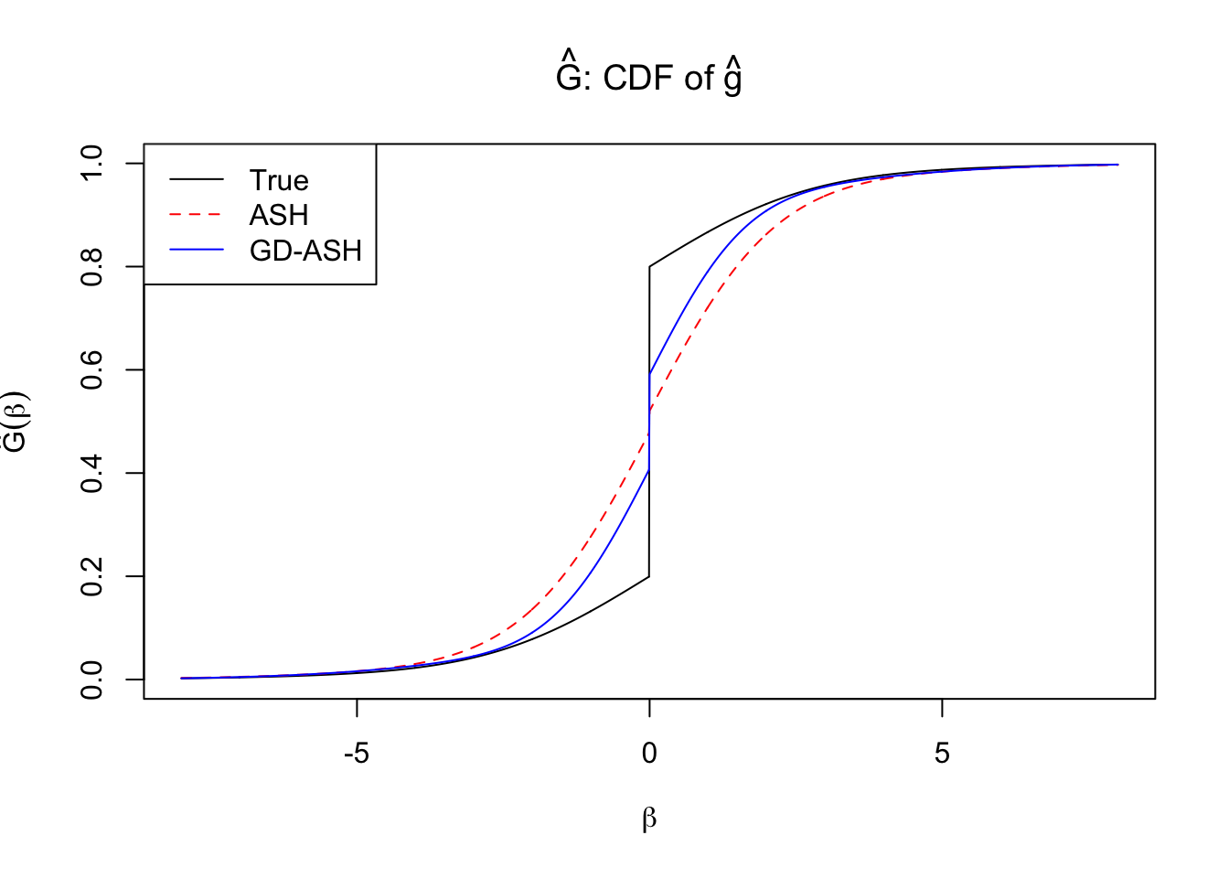 \[ \begin{array}{c} \beta_j \sim g = \sum\limits_{k=0}^K\pi_kg_k \ ;\\ g \text{ is unimodal} \ ; \\ \hat\beta_j | \beta_j, \hat s_j = \beta_j + \hat s_jz_j \ ;\\ z_j \sim N(0, 1) \text{, marginally} \ ; \\ z_j \text{ correlated} \ . \end{array} \] ## Fitting the model