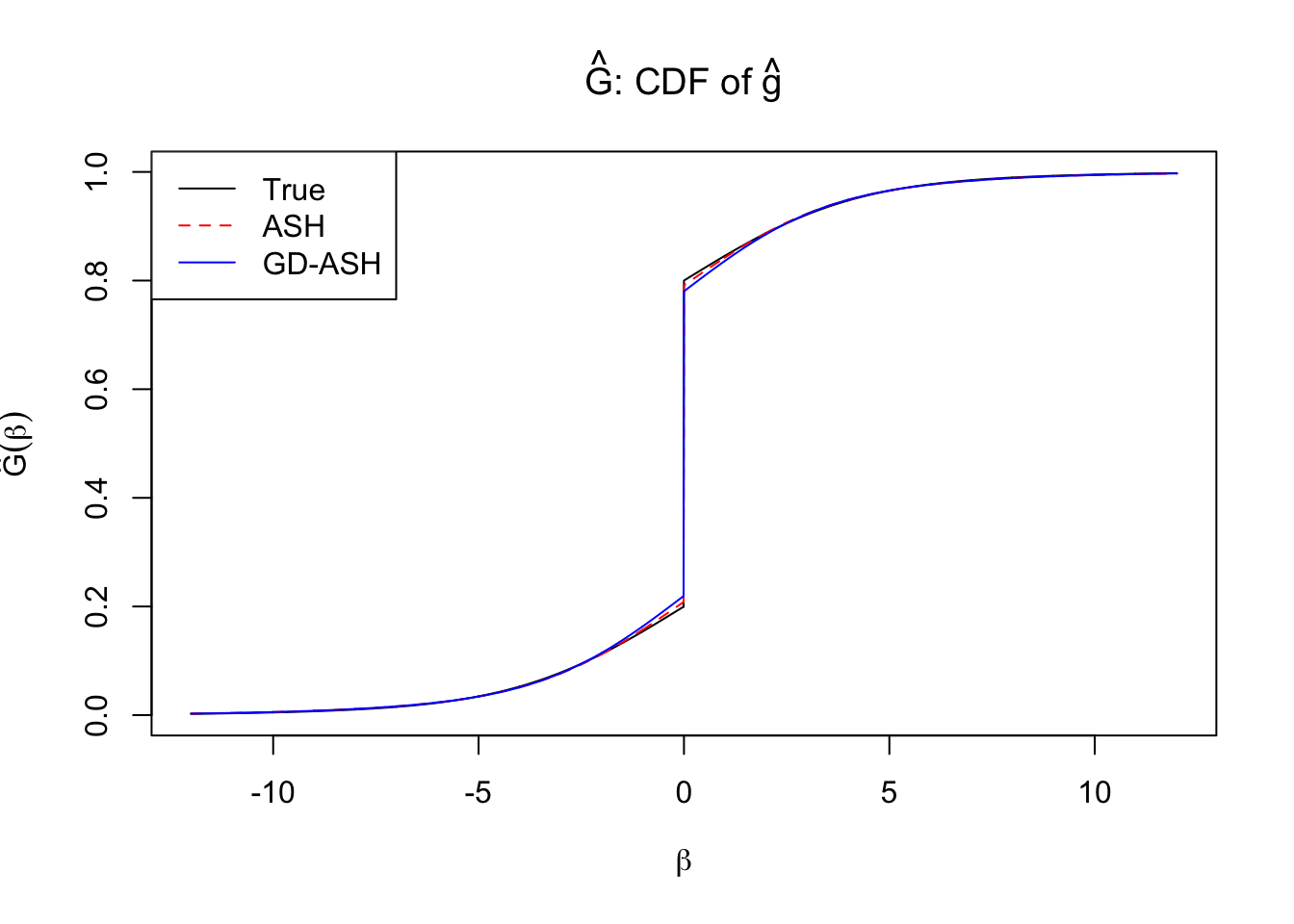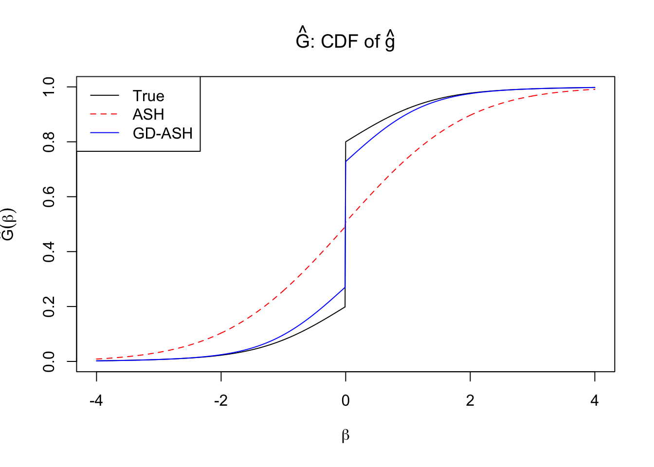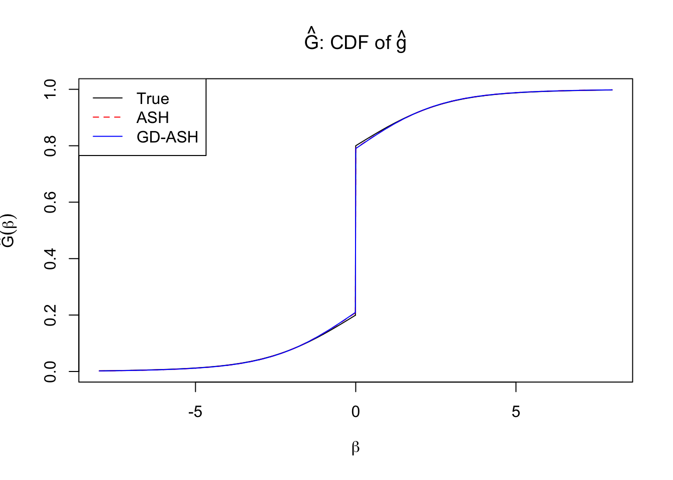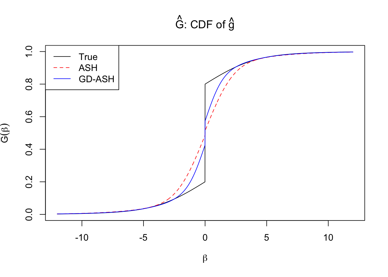 \[ \begin{array}{c} \beta_j \sim g = \sum\limits_{k=0}^K\pi_kg_k \ ;\\ g \text{ is unimodal} \ ; \\ \hat\beta_j | \beta_j, \hat s_j = \beta_j + \hat s_jz_j \ ;\\ z_j \sim N(0, 1) \text{, marginally} \ ; \\ z_j \text{ correlated} \ . \end{array} \] ## Fitting the model