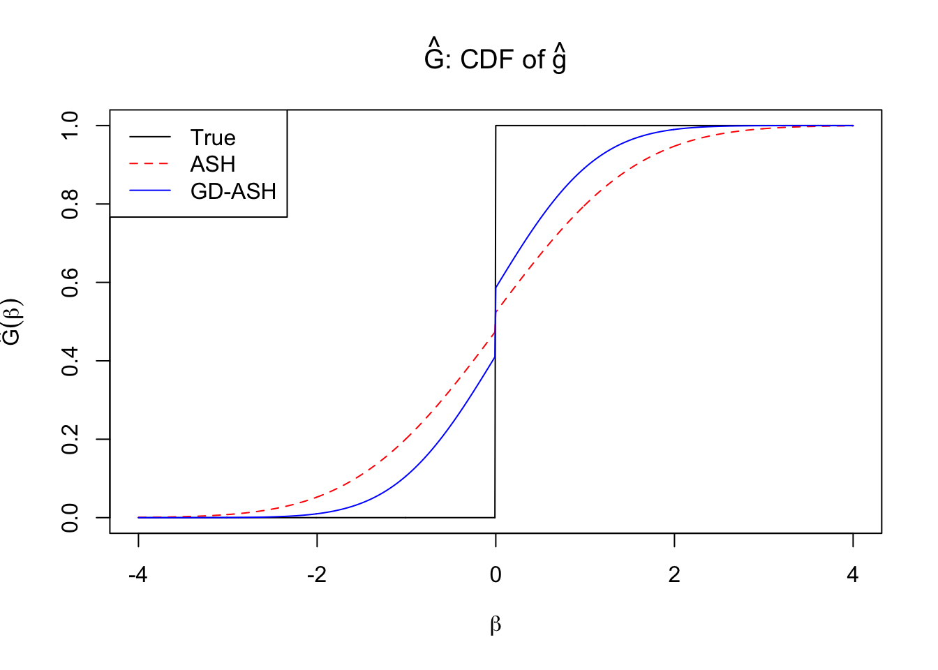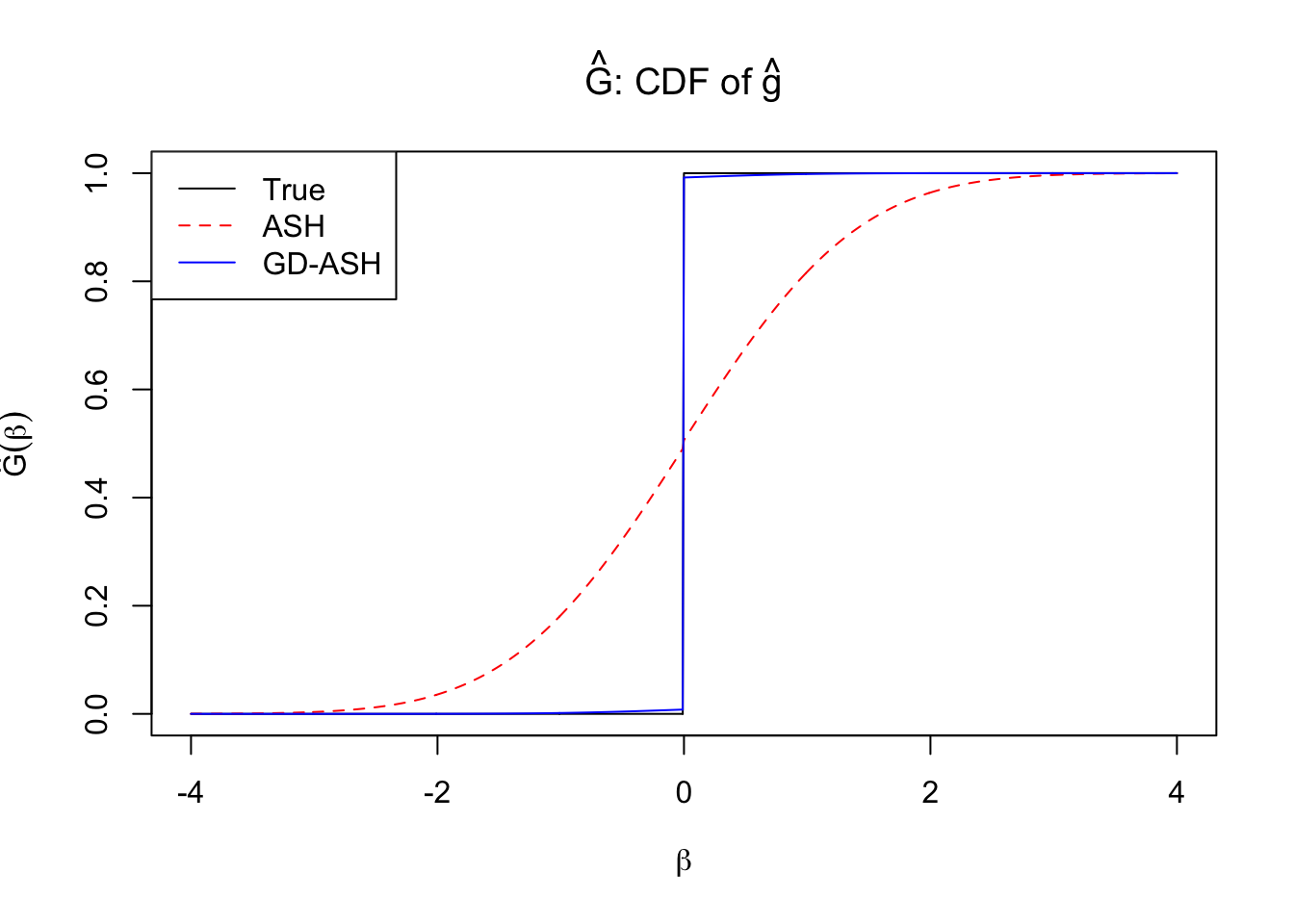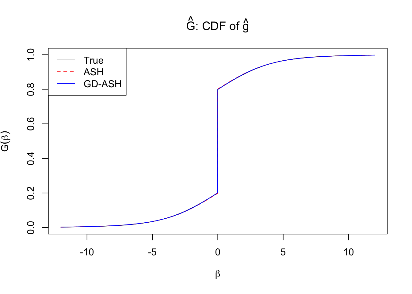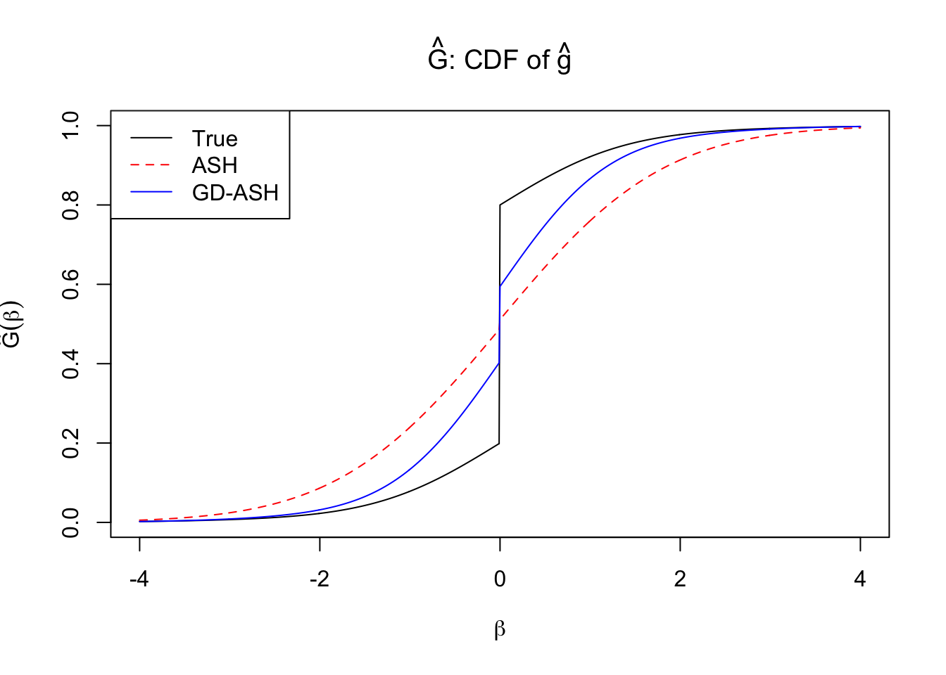 \[ \begin{array}{c} \beta_j \sim g = \sum\limits_{k=0}^K\pi_kg_k \ ;\\ g \text{ is unimodal} \ ; \\ \hat\beta_j | \beta_j, \hat s_j = \beta_j + \hat s_jz_j \ ;\\ z_j \sim N(0, 1) \text{, marginally} \ ; \\ z_j \text{ correlated} \ . \end{array} \] ## Fitting the model