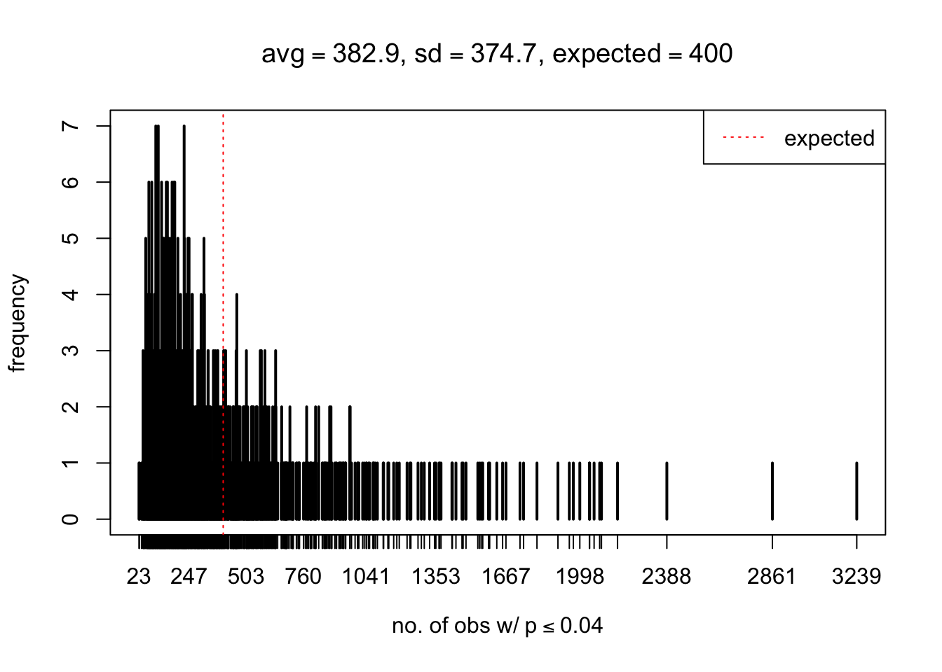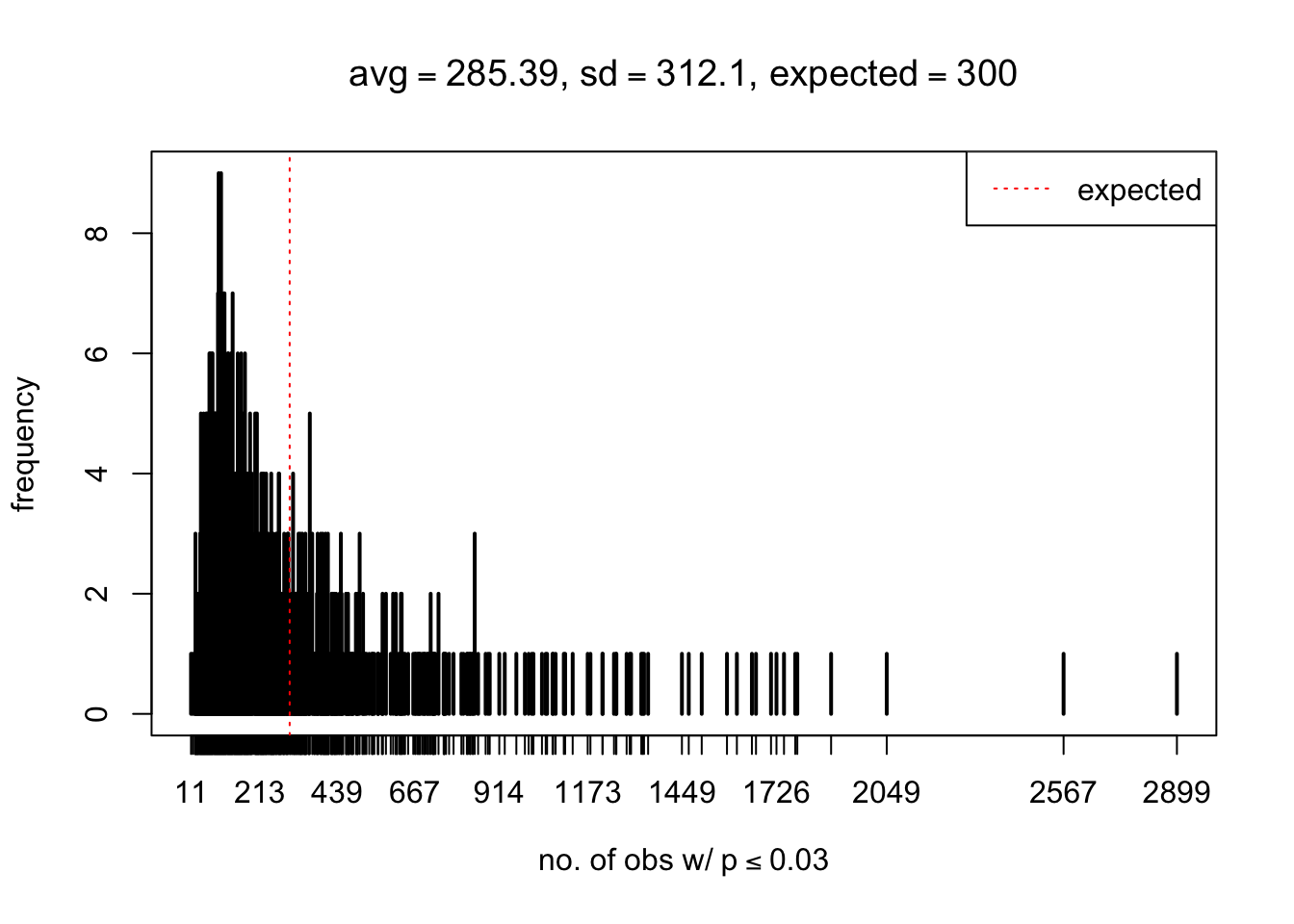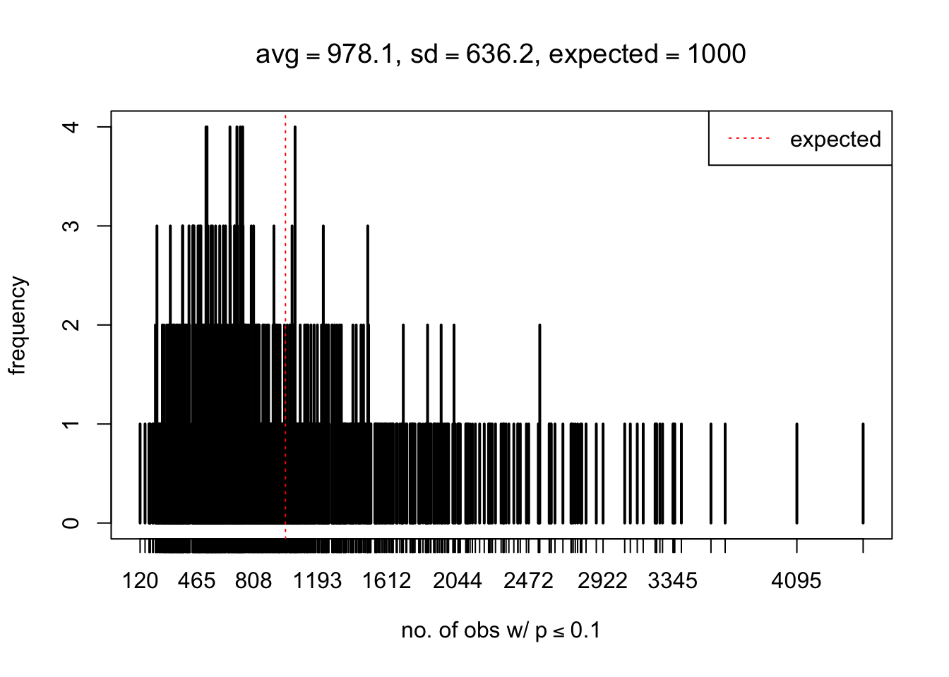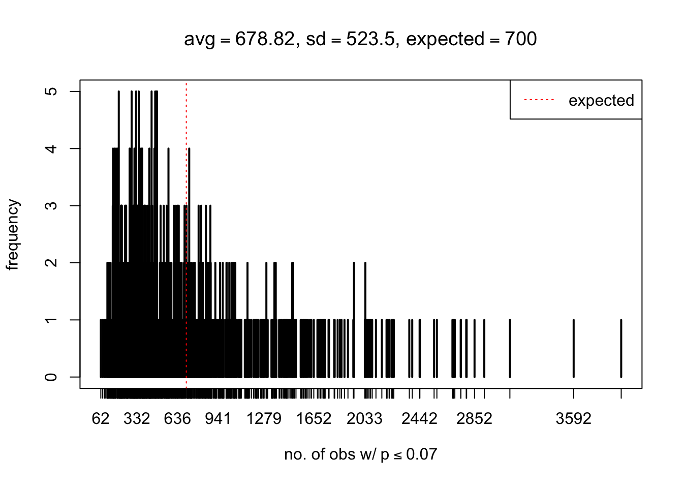 xlab = bquote("no. of obs w/"~p<=.(thj)),