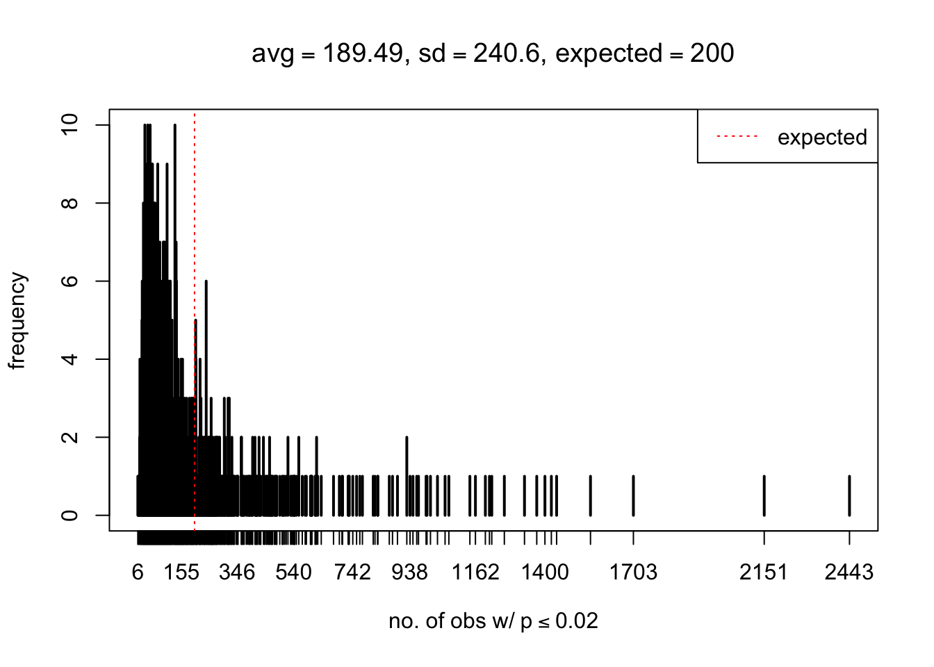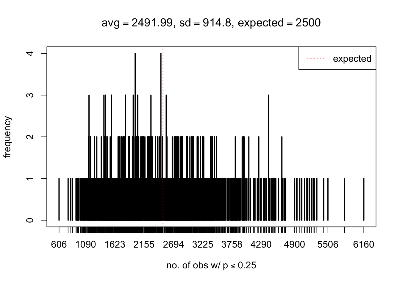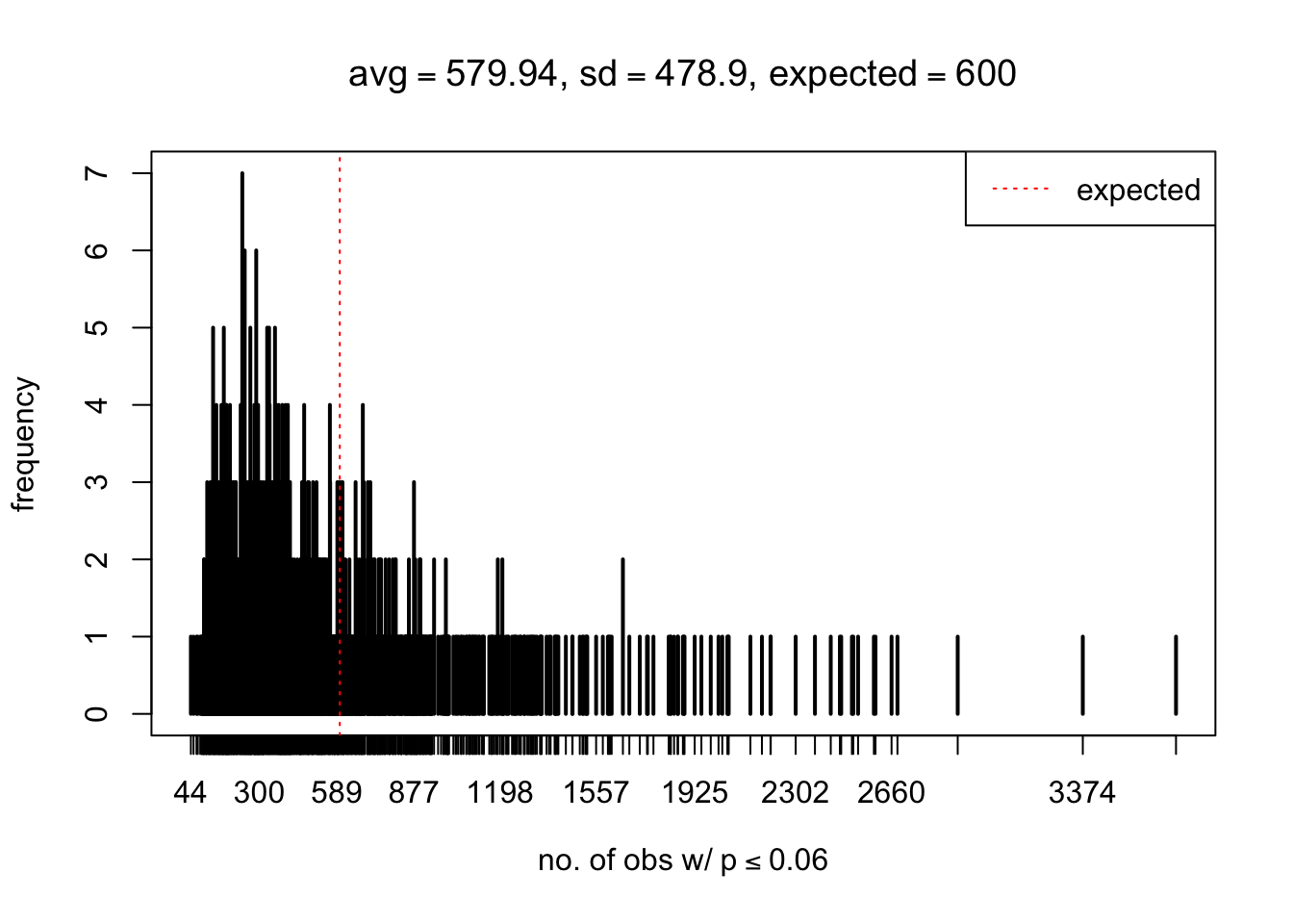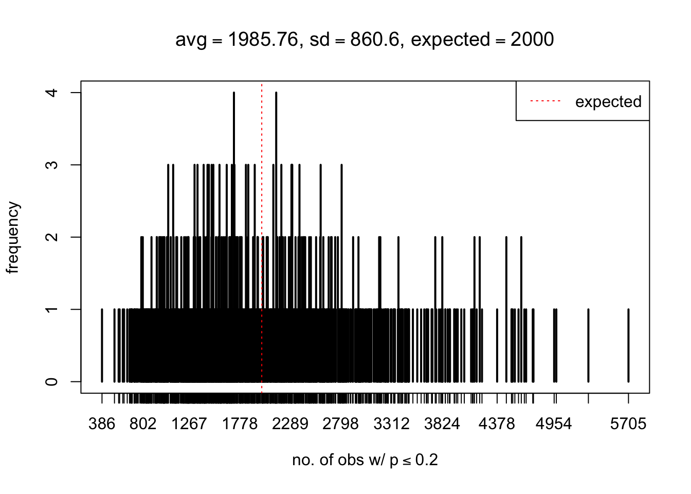 xlab = bquote("no. of obs w/"~p<=.(thj)),