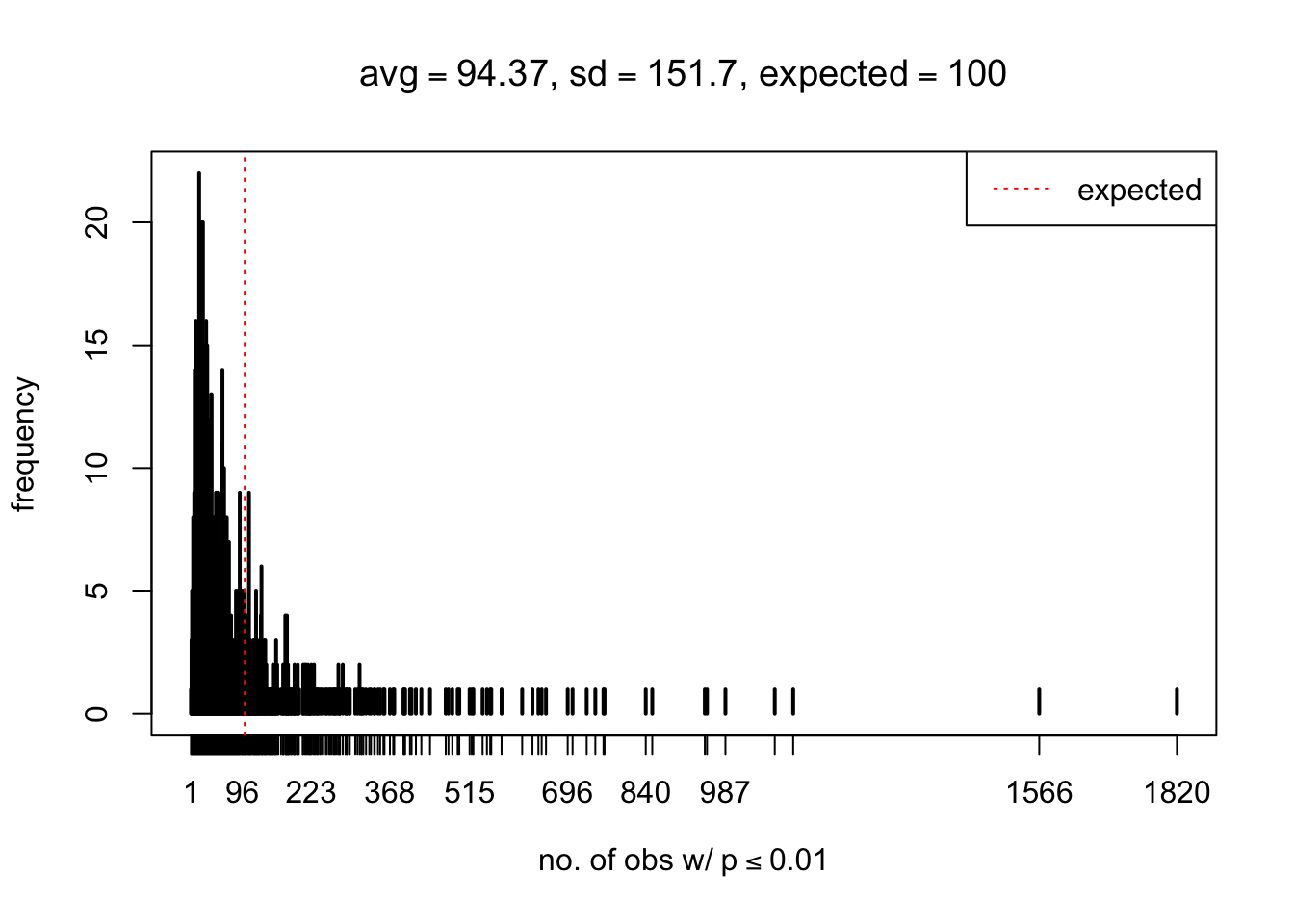 With different pre-specified thresholds \(T_p\), we record, for each of the \(m = 1000\) runs, the number of extreme observations with \(p \leq T_p\). The occurrence table is stored in p_null_liver_extreme.txt.