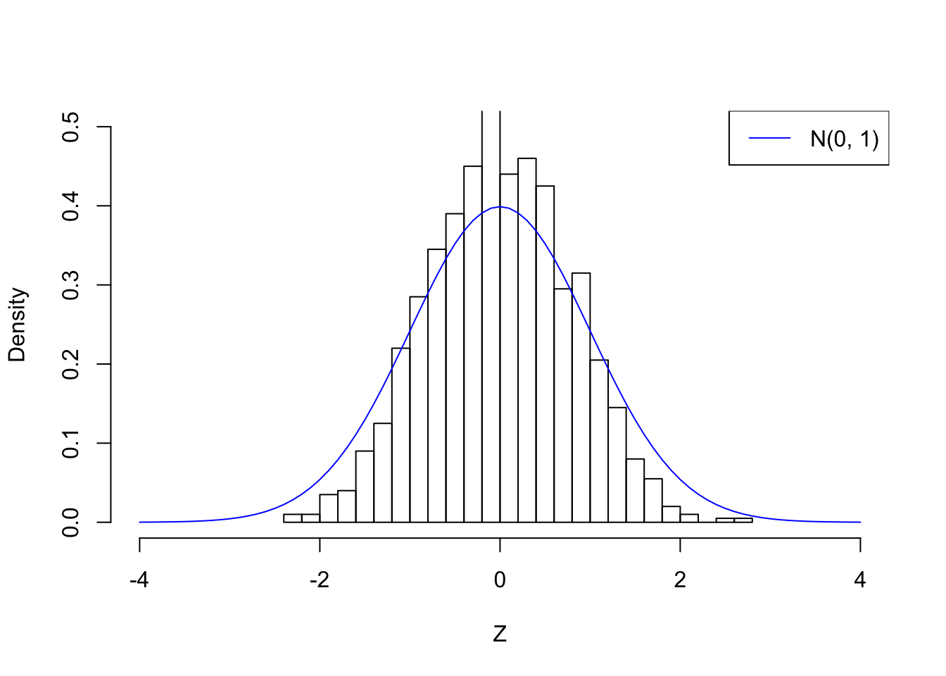 histz <- hist(z, prob = TRUE, breaks = 20, xlab = "Z", main = "", xlim = c(-4, 4), ylim = c(0, 0.5))
