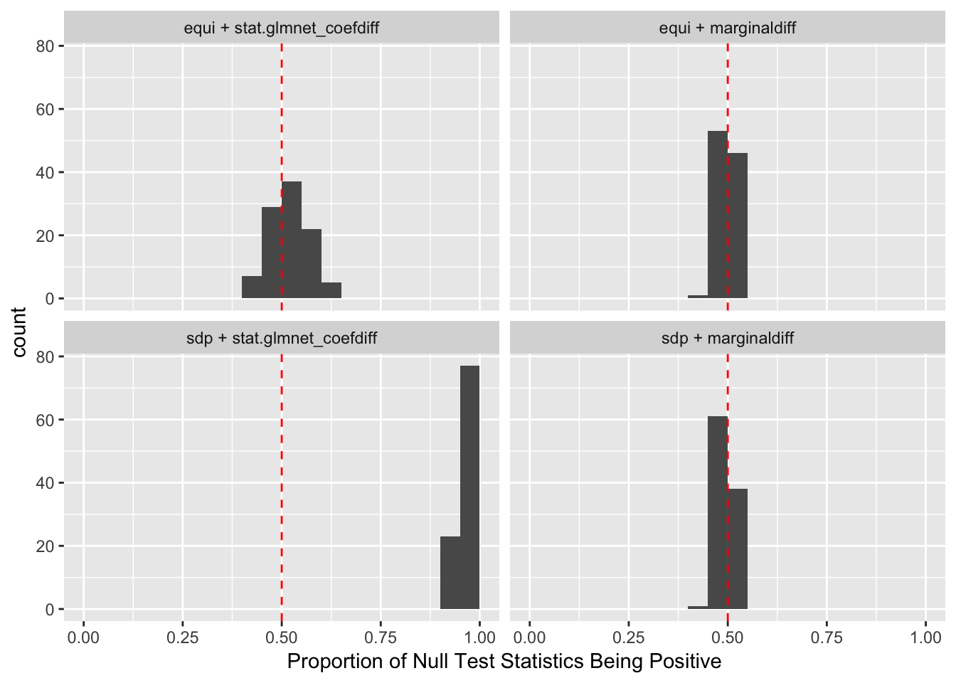 In step 1, we use two construction methods: equi and sdp. sdp is believed to be more powerful. In step 2, we use two statistics: marginal and lasso-related. lasso-related is believed to be more powerful.