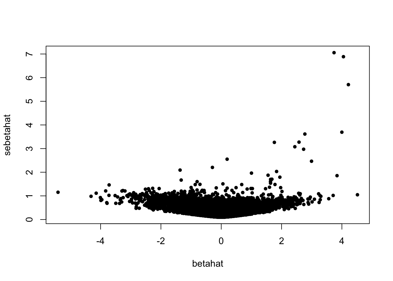 plot(betahat, sebetahat, cex = 0.7, pch = 19)