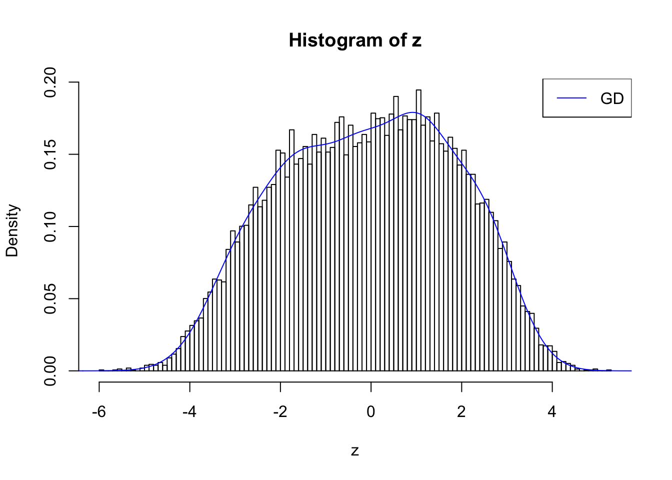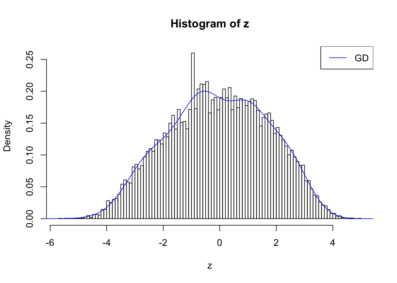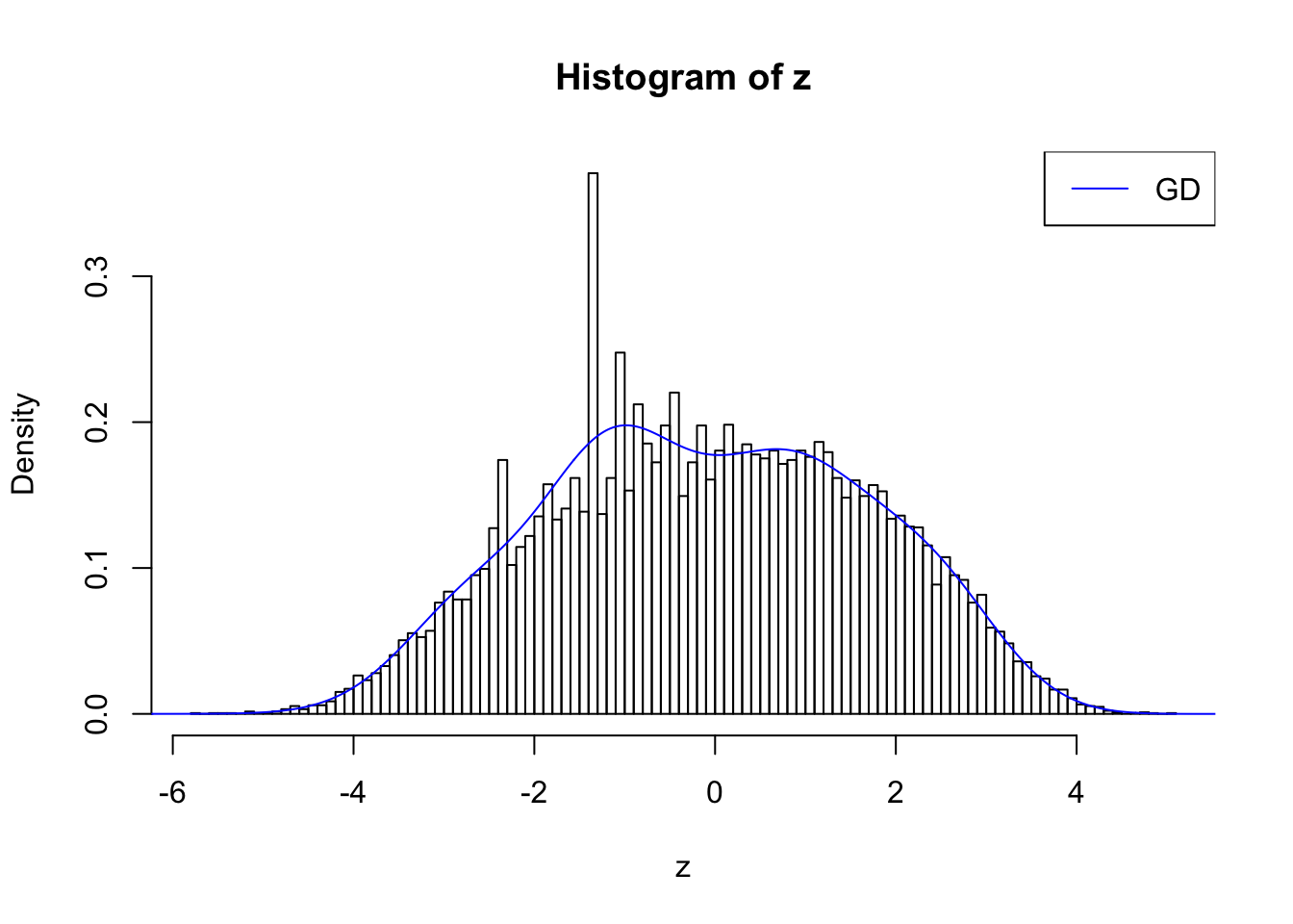 plot.gdfit(z, w.fit$w, w.fit$gd.ord, std.norm = FALSE, breaks = 100)