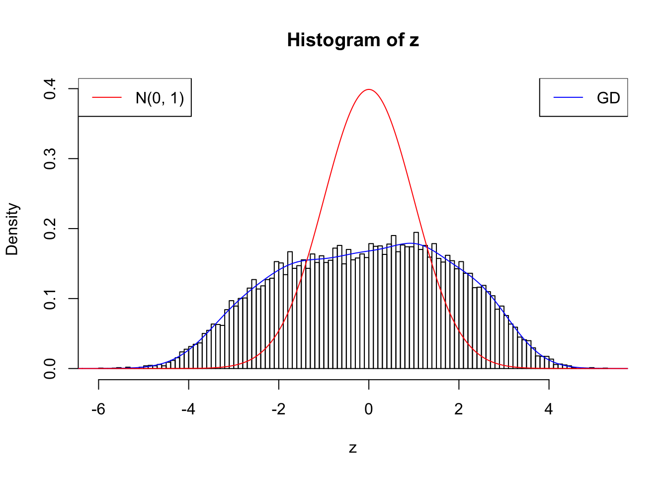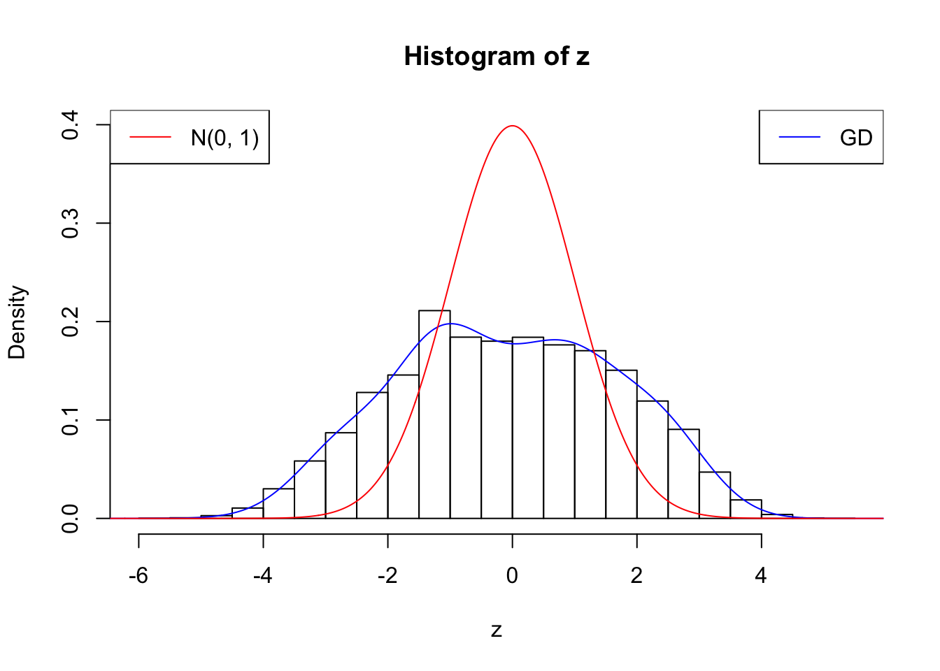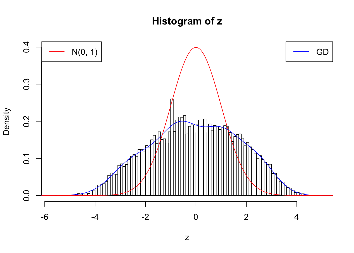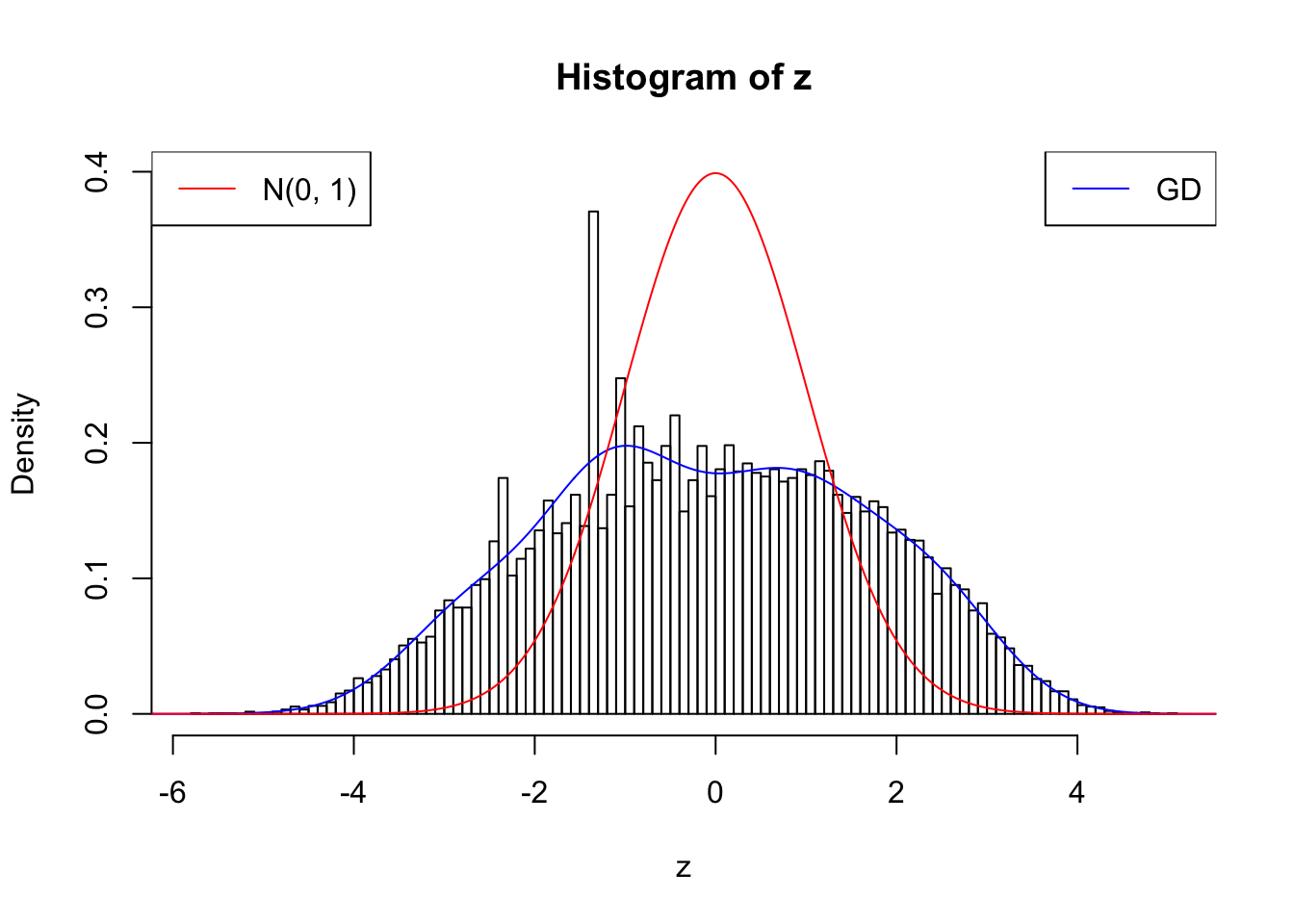 plot.gdfit(z, w.fit$w, w.fit$gd.ord, std.norm = FALSE, breaks = 100)