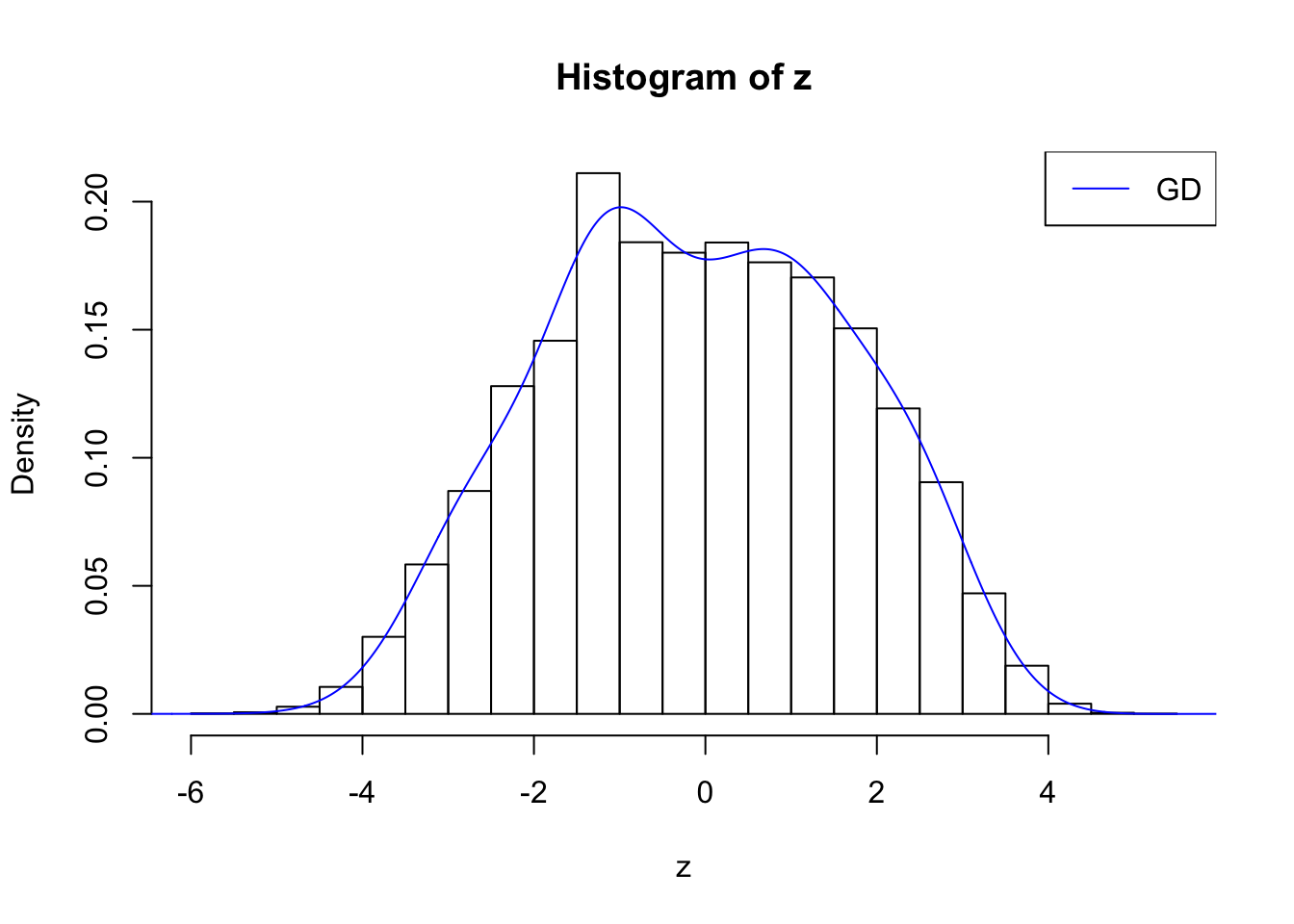 plot.gdfit(z, w.fit$w, w.fit$gd.ord, std.norm = FALSE, breaks = "Sturges")