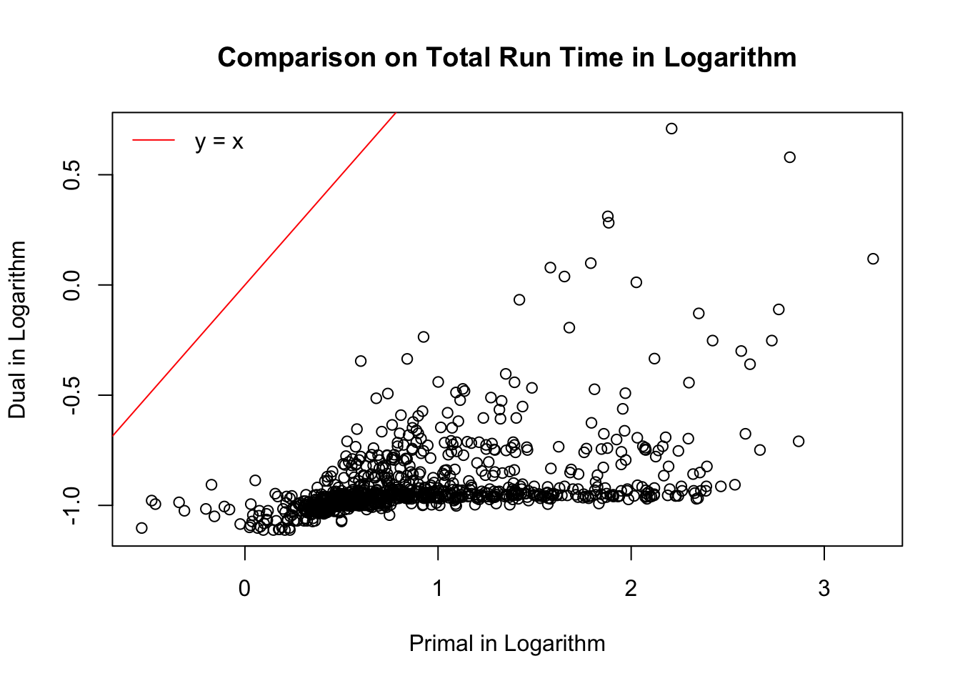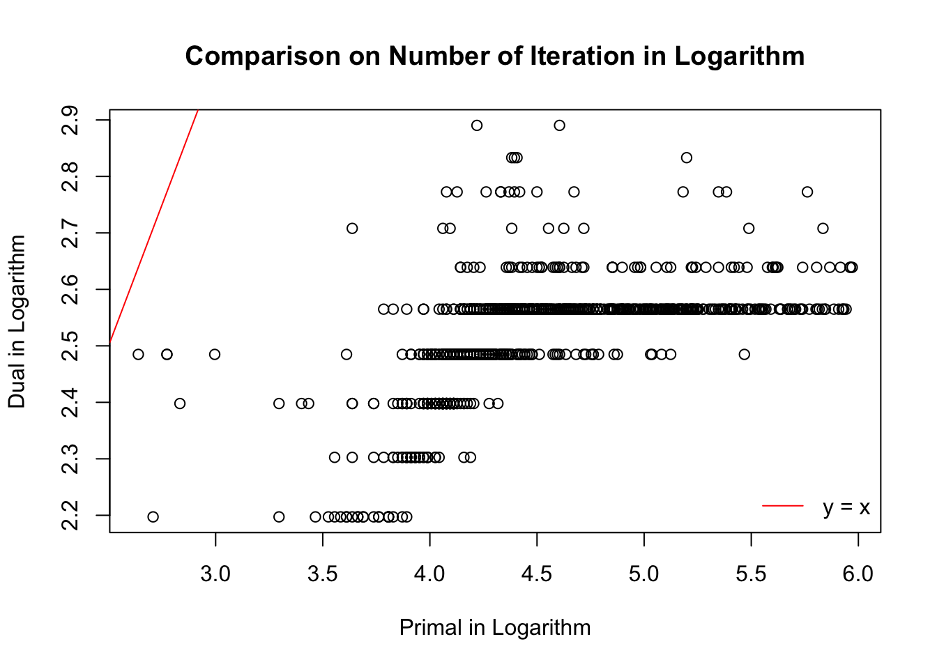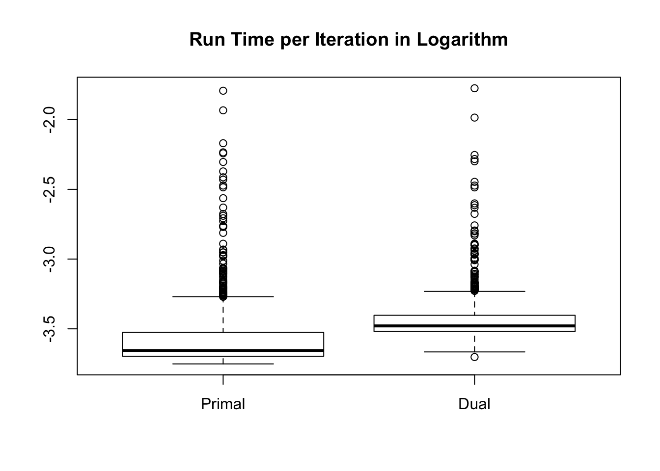 In the following comparisons, we only compare the results when both primal and dual reach the optimal. Worthnoting is that out of \(1000\) runs, the dual reaches optimal in all of them, whereas the primal doesn’t in 61 of them, or \(6.1\%\).