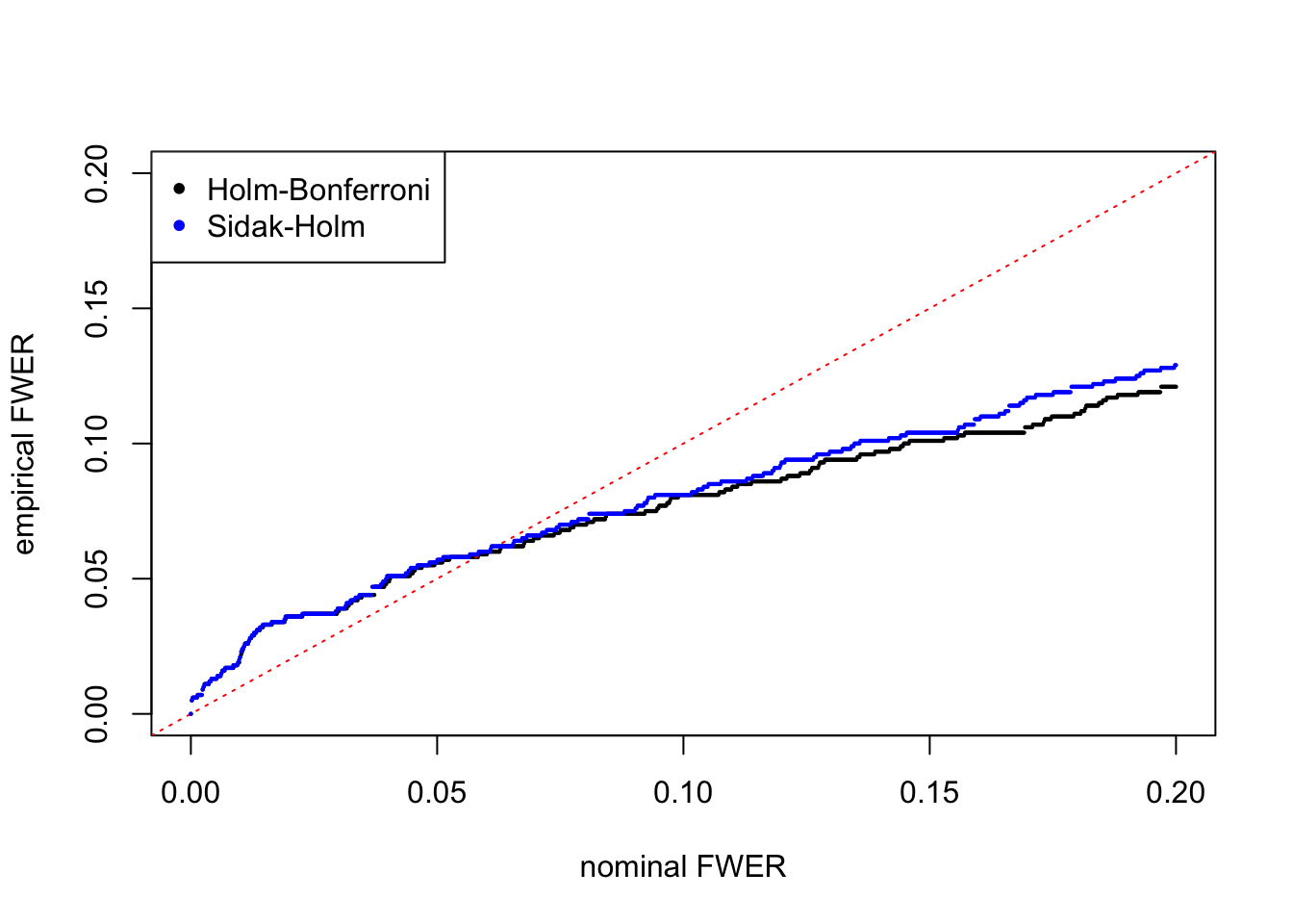 The theoretical result tells us that Holm-Bonferroni controls FWER under any circumstances (arbitrary correlation) whereas Sidak-Holm is guaranteed to control FWER only when p-values are independent. On the other hand, both procedures control FWER very conservatively; that is, under respective assumptions, both procedures are guaranteed to have FWER \(< \alpha\), not \(= \alpha\).