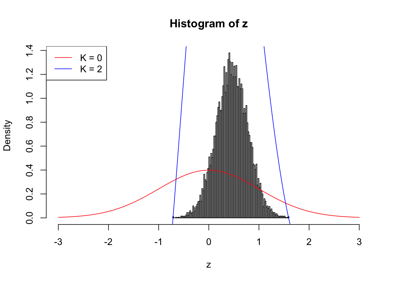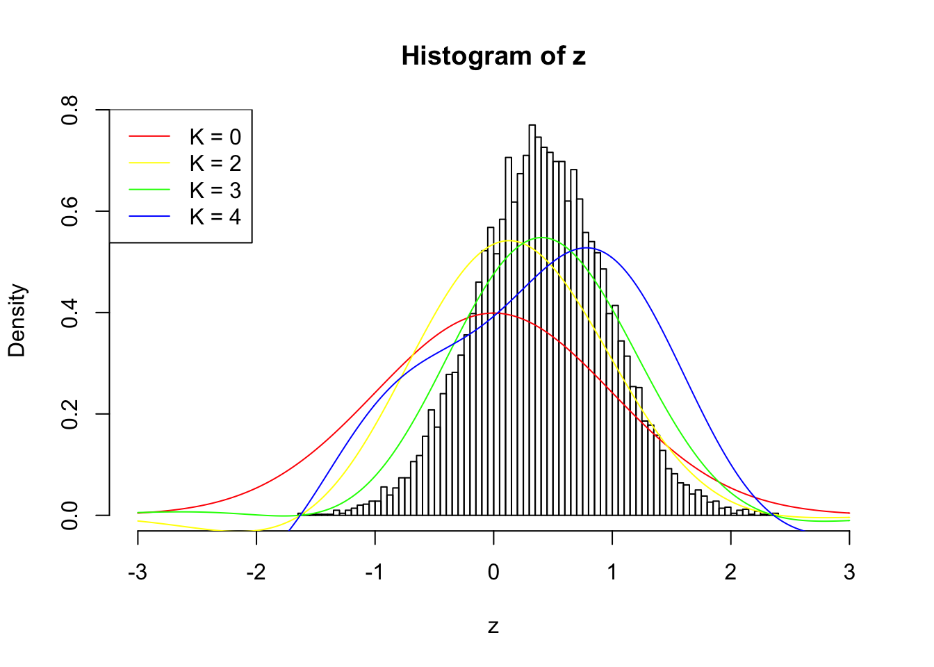 \[ f_0^K(x) = \varphi(x)\sum\limits_{k = 0}^K \frac{1}{k!}h_k(z)h_k(x) \ . \] Meanwhile, let \(F_0^K(x) = \int_{-\infty}^x f_0^K(u)du\). It’s easy to shown that