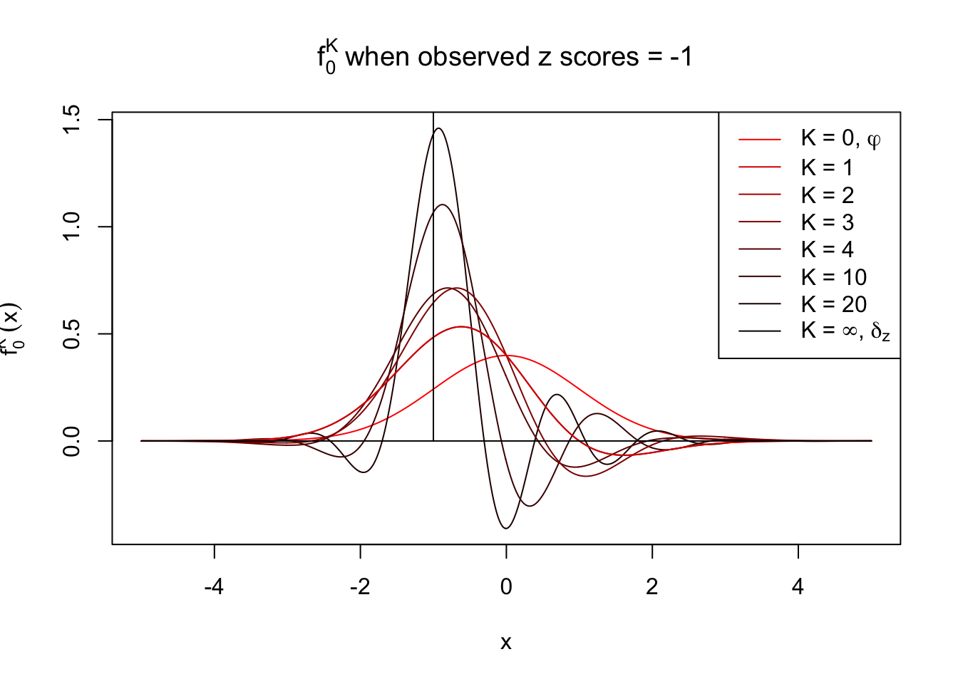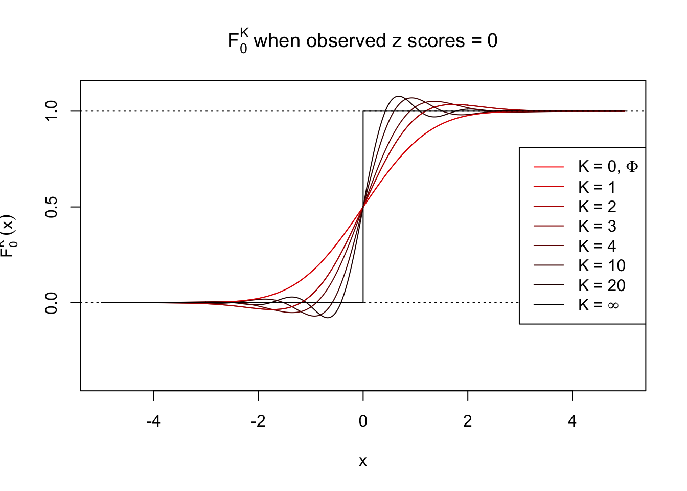 Theoretically, \(f_0^K\) is an approximation to empirical density of perfectly correlated \(z\) scores; hence, as \(K\to\infty\), \(f_0^K\to\delta_z\). Similarly, \(F_0^K\) is an approximation to empirical cdf of perfectly correlated \(z\) scores; hence, as \(K\to\infty\), \(f_0^K\) should converge to the \(0\)-\(1\) step function, and the location of the step is the observed \(z\).
