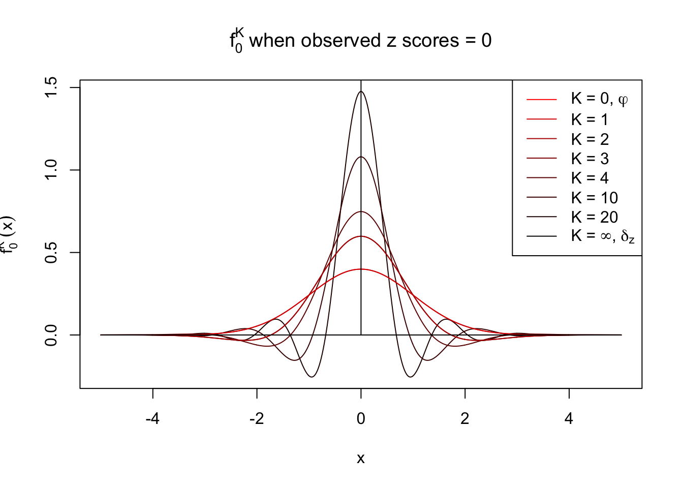 When we have perfect correlation among all \(z\) scores, the approximate limit observed density \(f_0(x)\to\delta_z(x) = \delta(x-z)\). That is, with probability one, we observe \(z_1 = \cdots = z_n = z\), as \(n\to\infty\), \(f_0(x)\) goes to a Dirac delta function peak at the observed \(z\), and zero elsewhere. Now the question is, can this Dirac delta function be decomposed with the Gaussian \(\varphi\) and its derivatives \(\varphi^{(k)}\), so that we still have