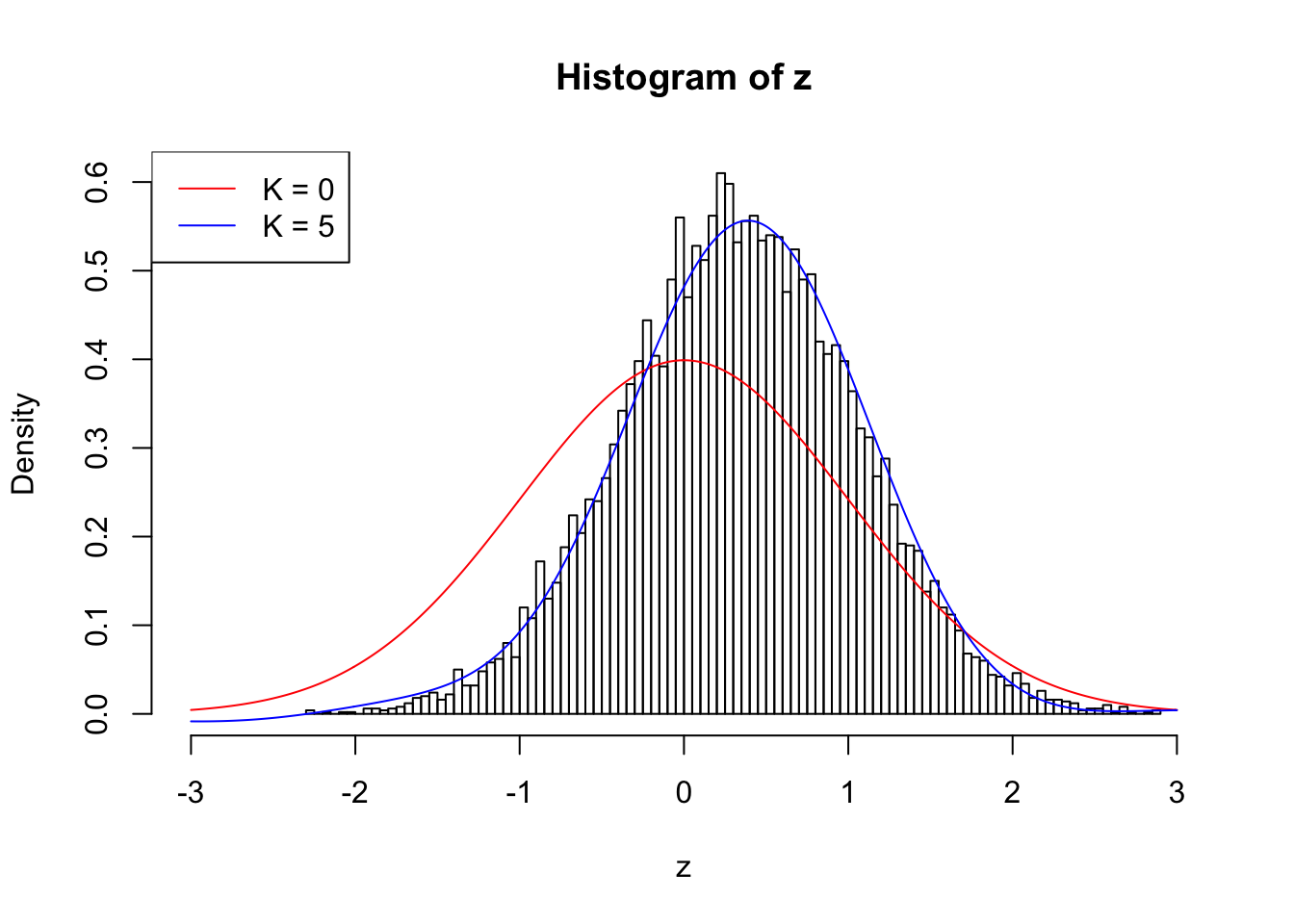 When \(\rho = 0.9\), the observed \(z\) scores are so concentrated in a small range, even if we have \(10,000\) of them, making the effective sample size hopelessly small. Current implementation can’t even handle this data set; it goes crazy when \(K = 2\).