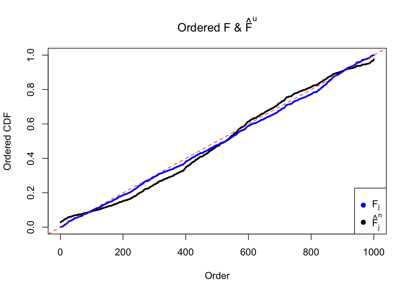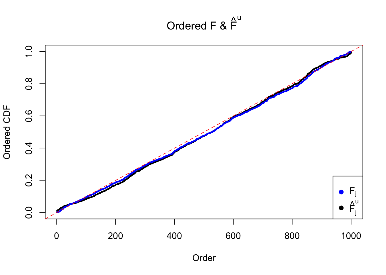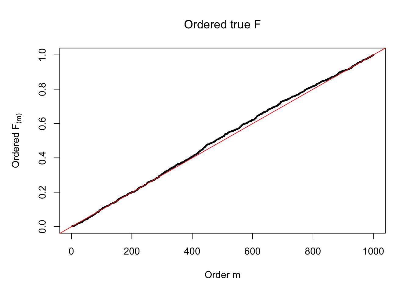 \[ F_j^o = \int_{-\infty}^{\hat\beta_j}\int p\left(t\mid\beta_j, \hat s_j\right)g_j\left(\beta_j\right)d\beta_jdt \ . \] Then the difference in the “uniformness” between \(F_j\) and \(F_j^o\) indicates the goodness of the exchangeability assumption.