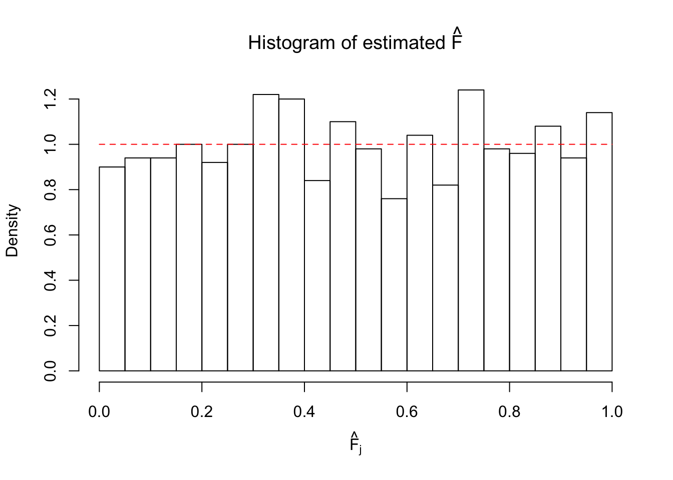 \[ \displaystyle F_j := F_{\hat\beta_j|\hat s_j} \left(\hat\beta_j|\hat s_j\right) = \int_{-\infty}^{\hat\beta_j} f_{\hat\beta_j|\hat s_j}\left(t|\hat s_j\right)dt \ , \] should be a random sample from \(\text{Unif}\left[0, 1\right]\).