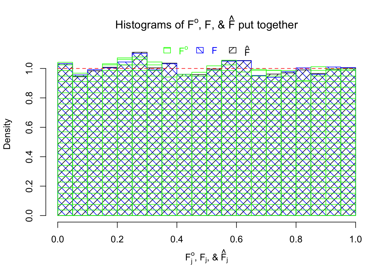 \[ \begin{array}{rcl} \hat s_j &\equiv& 1 \ ;\\ \beta_j &\sim& 0.5\delta_0 + 0.5N(0, 1)\ ;\\ \hat\beta_j | \beta_j, \hat s_j \equiv 1 &\sim& N\left(\beta_j, \hat s_j^2 \equiv1\right)\ . \end{array} \] The histograms of \(\left\{F_j^o\right\}\), \(\left\{F_j\right\}\), and \(\left\{\hat F_j\right\}\) are plotted together. In this example \(\left\{F_j^o\right\}\) are hardly more uniform than \(\left\{F_j\right\}\).