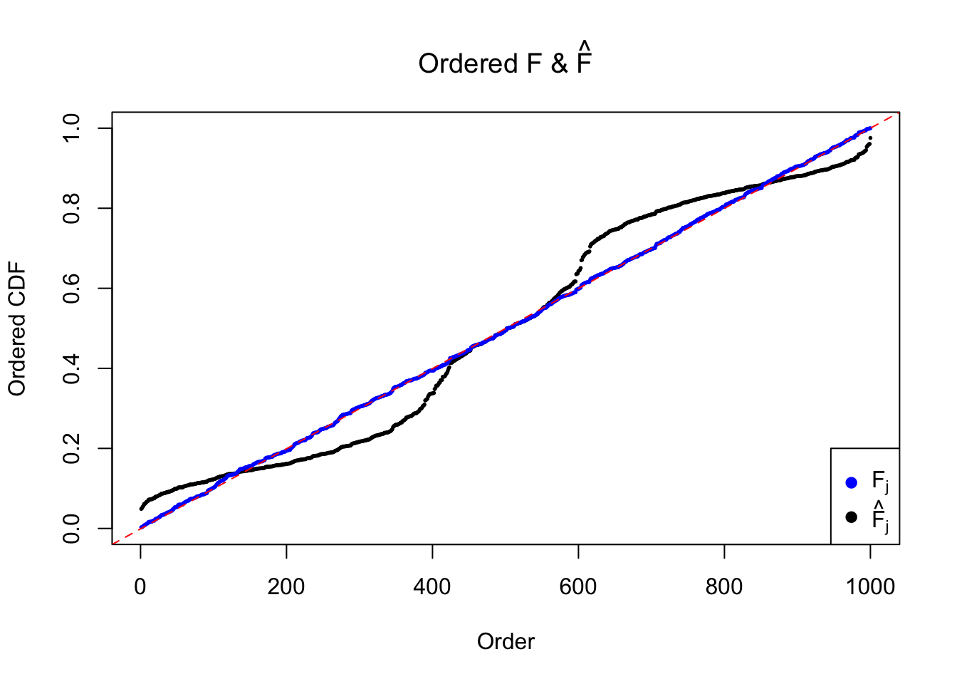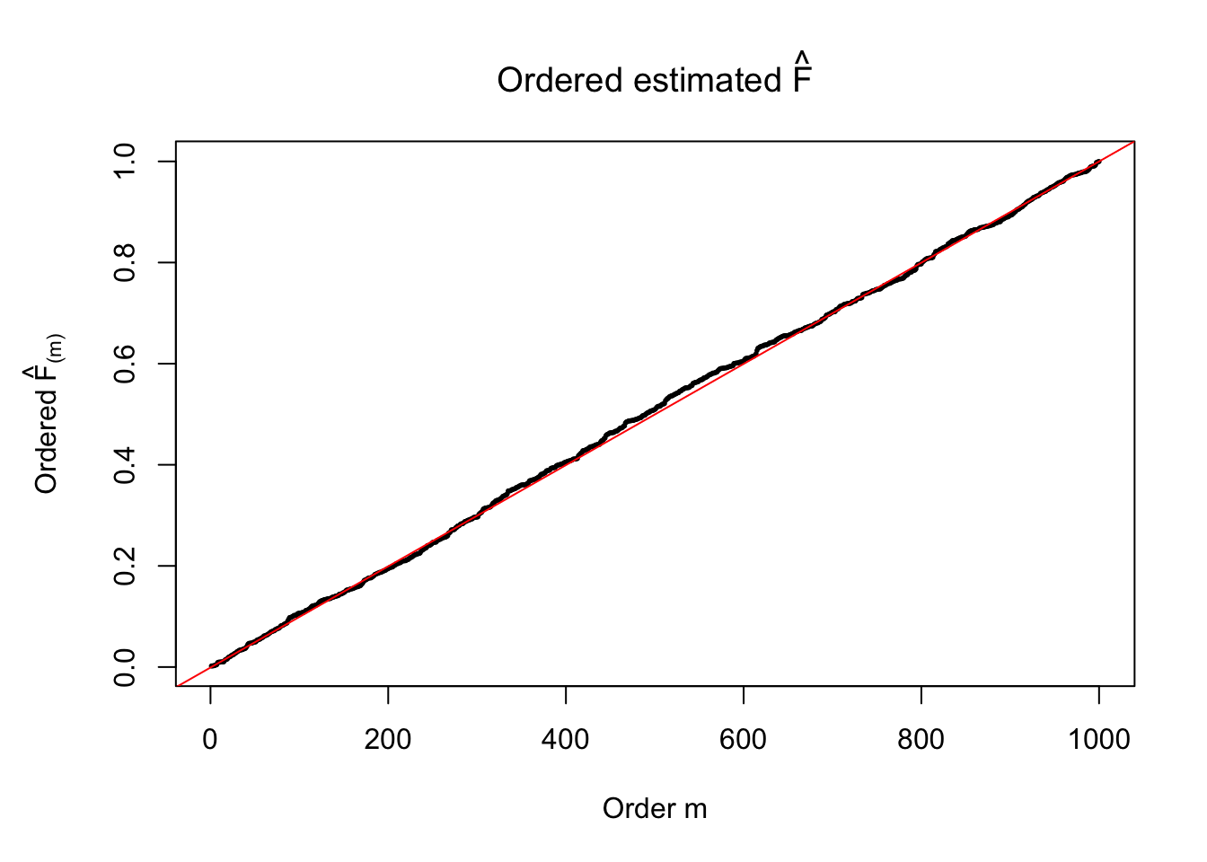 plot(sort(Fhat), cex = 0.25, pch = 19, xlab = "Order m", ylab = expression(paste("Ordered ", hat("F")["(m)"])), main = expression(paste("Ordered estimated ", hat("F"))))