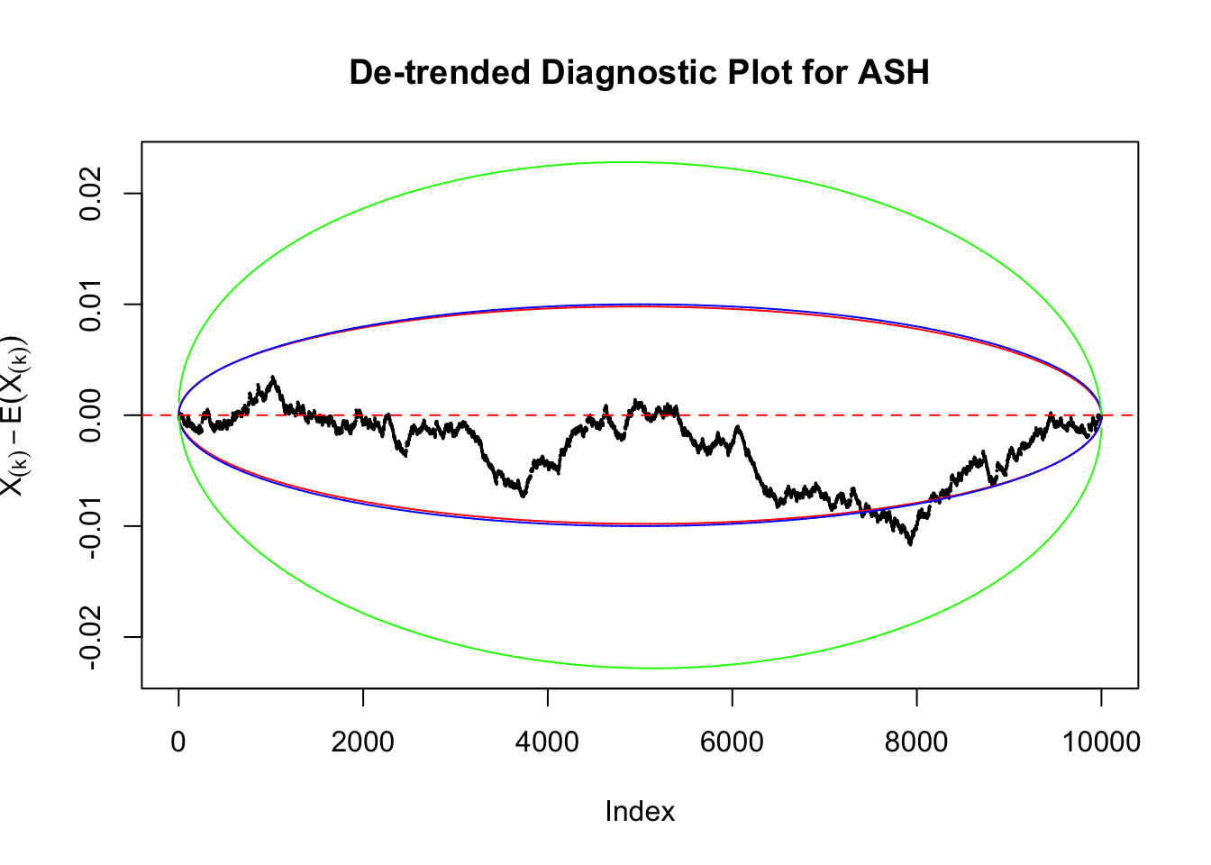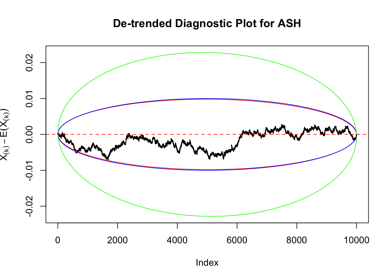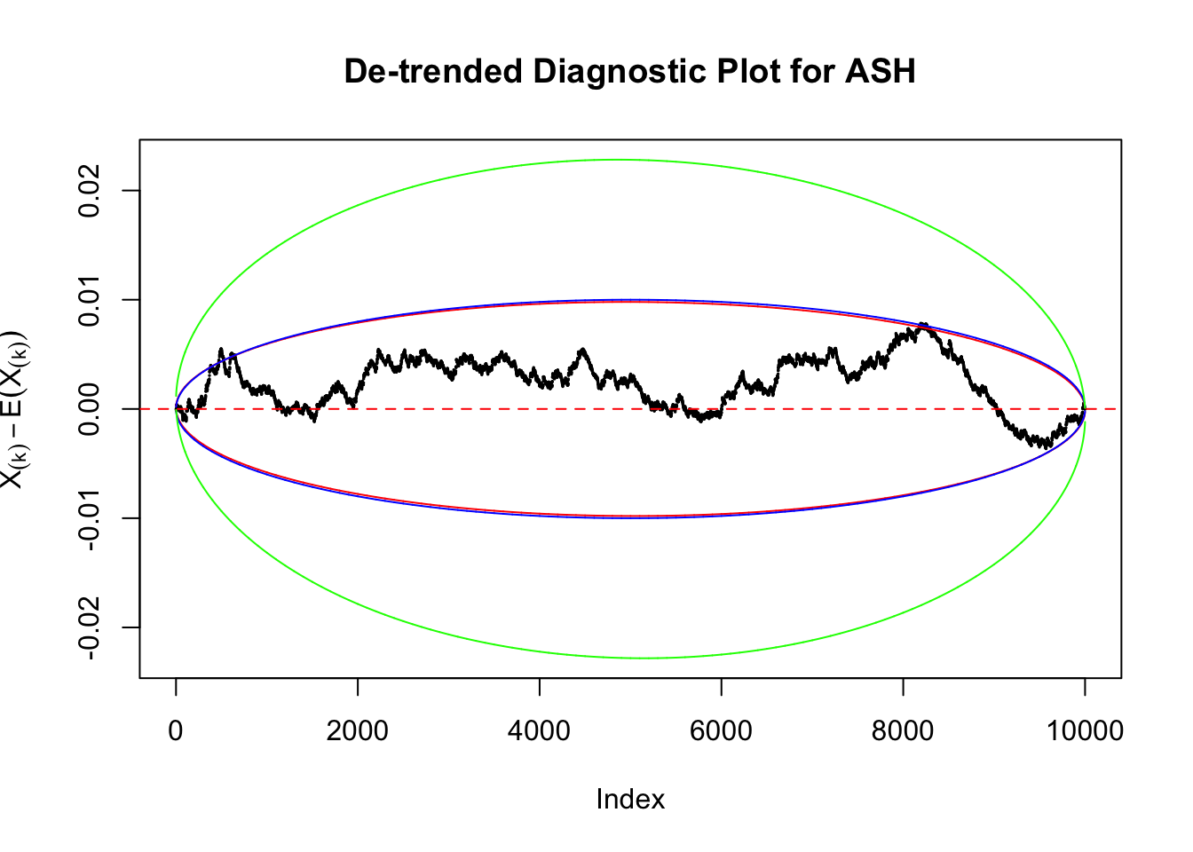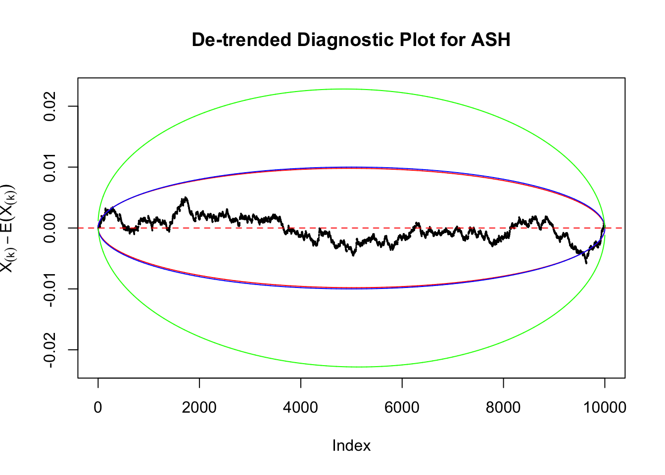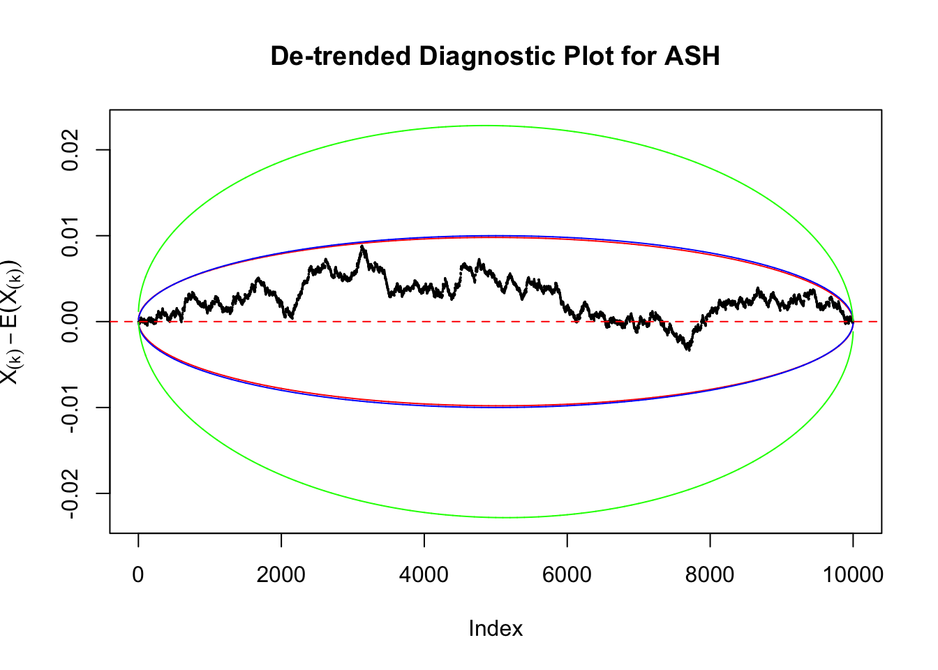 Therefore, we can set \(\epsilon\) so that \(\alpha = 2e^{-2n\epsilon^2}\), and plot \(F_n\left(X_{(k)}\right) - F\left(X_{(k)}\right) = \frac kn - X_{(k)}\) against \(\pm\epsilon\). Note that in this case we are plotting \(F_n\left(X_{(k)}\right) - F\left(X_{(k)}\right)\), not \(X_{(k)} - E\left[X_{(k)}\right]\), but under uniform they are very close, with no practical difference.