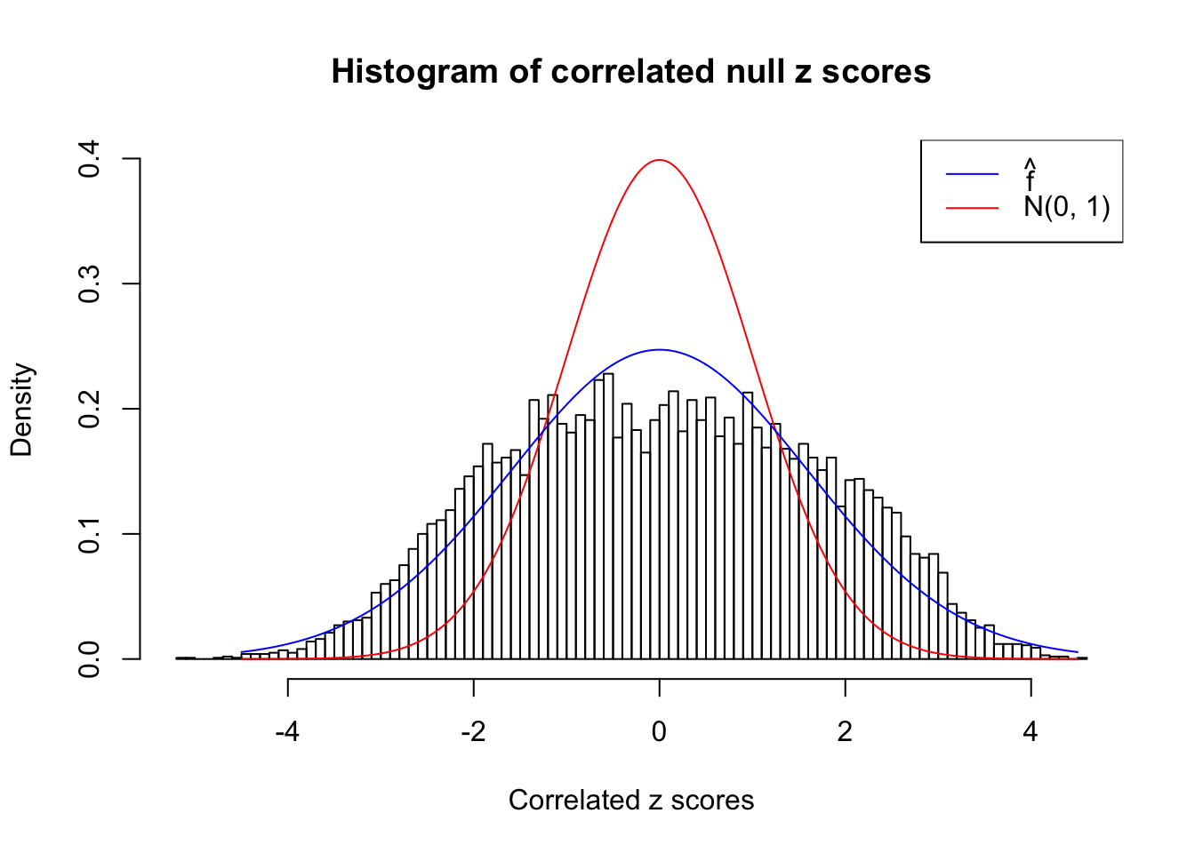 We are selecting four data sets with \(N(0, 1)\) \(z\) scores distorted by correlation. The first two are inflated, and the latter two mildly deflated. ASH has a hard time handling both cases, and the fitted predictive density curves can show that.