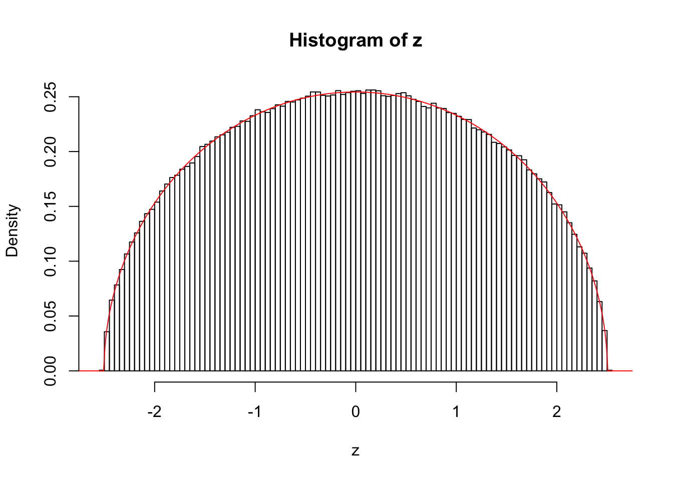 For example, when \(k = 4\), \(n\) is sufficiently large, say, \(10^6\), the histogram of \(z\) looks like a semicircle almost perfectly, as illustrated in the following simulation. The semicircle is centered at the origin, and has a radius of \(\left\|x\right\|_2\).